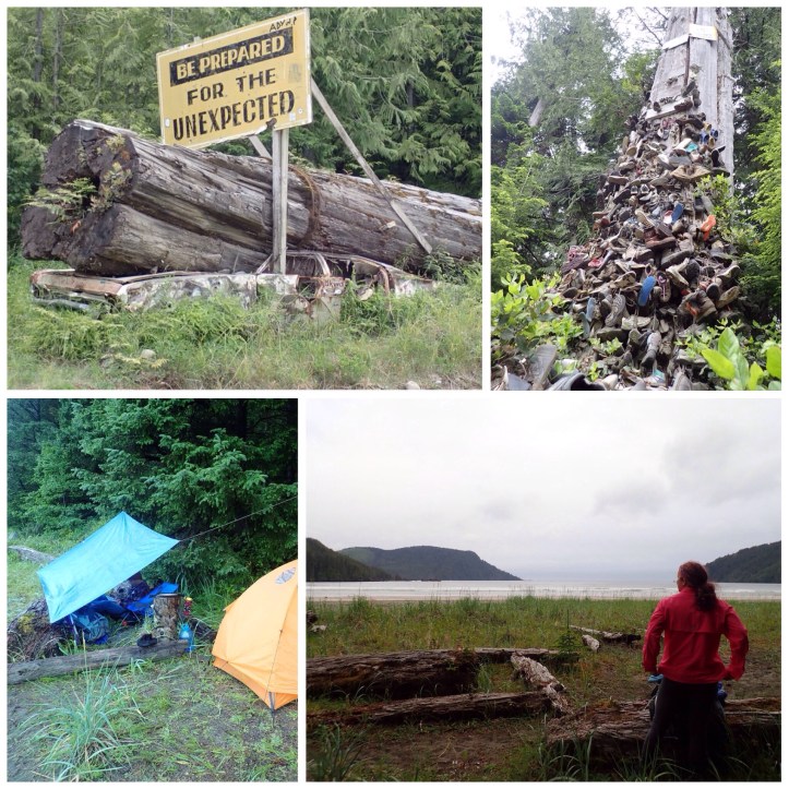 We left the campground just as loads of people were showing up for the weekend and headed to the far north west coast of the island. The plan was to camp the first night on the beach at San Josef Bay and then hike back out, reload and head out on the North Coast Trial. A stop for Timmy Hortons coffee allowed us to check the weather. The forecast was for rain all day on Sunday so we decided to just get to the beach at San Josef and stay put for the next couple of nights. My endurance just isn’t up for hauling heavy packs five and half hours one way for a one night stay then back out the next morning. The drive up was long but fast until we hit the gravel logging roads. Basically from Port Hardy (Cafe Guido has awesome coffee) it is al logging roads to the coast. Given that is was Canada Day today, we didn’t see any trucks but we did find a road side monument. A huge pile of shoes, with some nailed to the tree. I’m not sure the significance, I’ll try googling when we get internet! And the Internet says it was started in 1989 by a local resident for no particular reason!