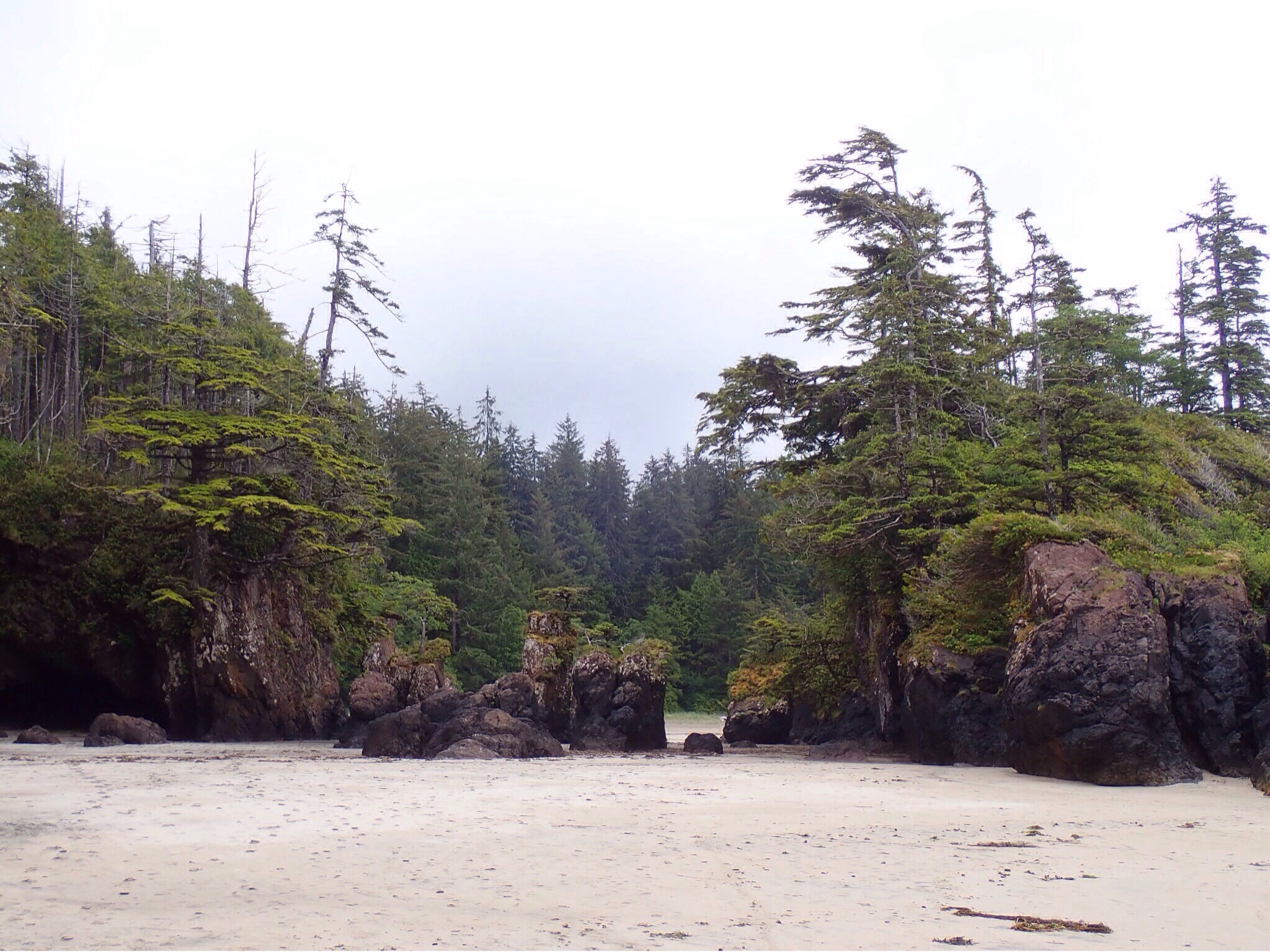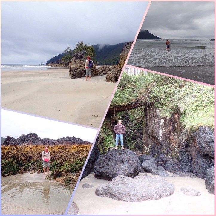 Once we hit the trailhead the caretakers warned us that the beach was crowded for Canadian standards, 45 people or so were already camped down there. Not sure what to expect, we figured it couldn’t be any worse than the campground at the rim of the Grand Canyon, so away we went! The hike down is really easy and goes through some beautiful coastal rainforests. Some of the trees are giants! We made it to the beach around 6:30 pm and found a spot easily. The other campers are all well spaced and tucked into the tree line so it feels like we have the beach to ourselves! The camp area provides two food caches and one outhouse but no water.