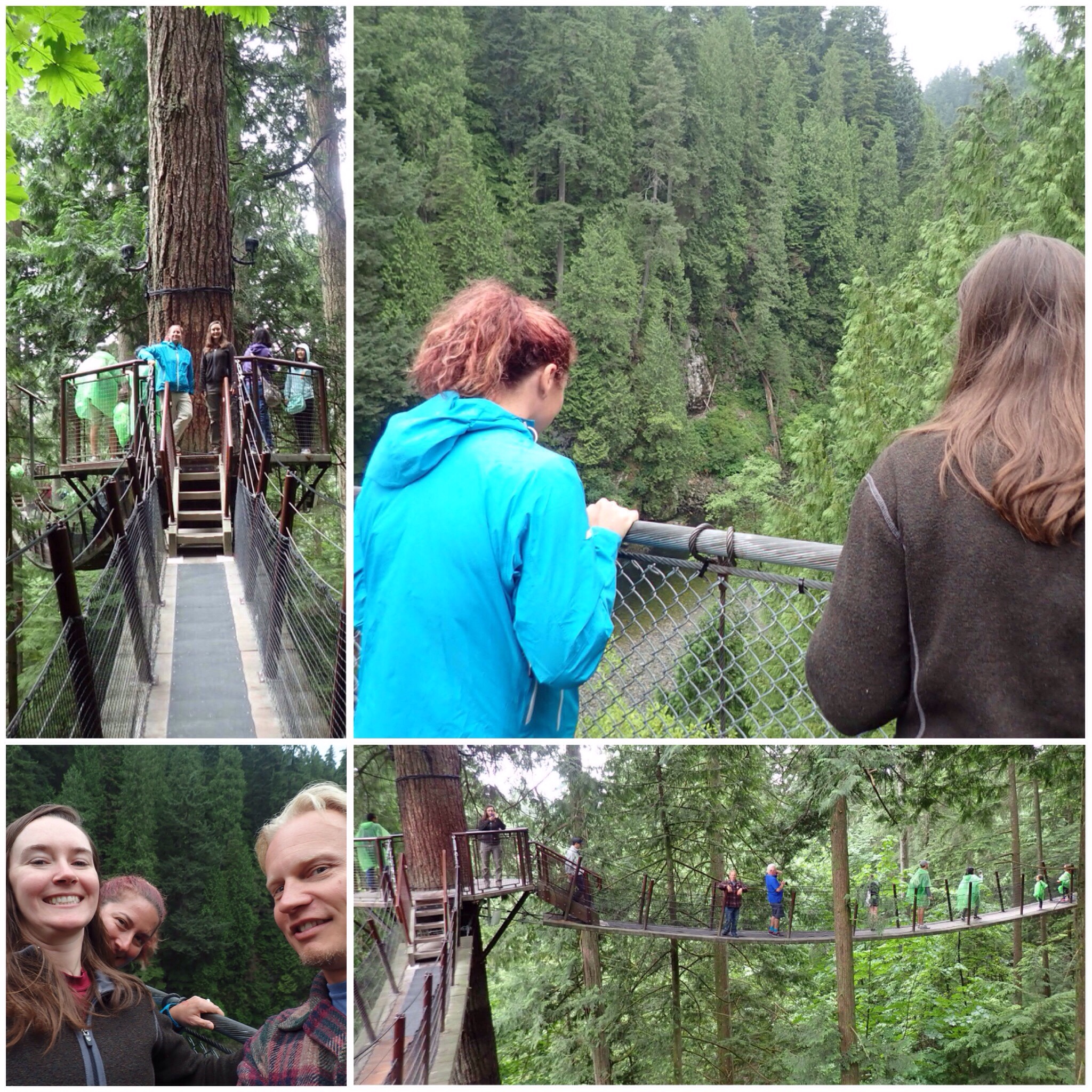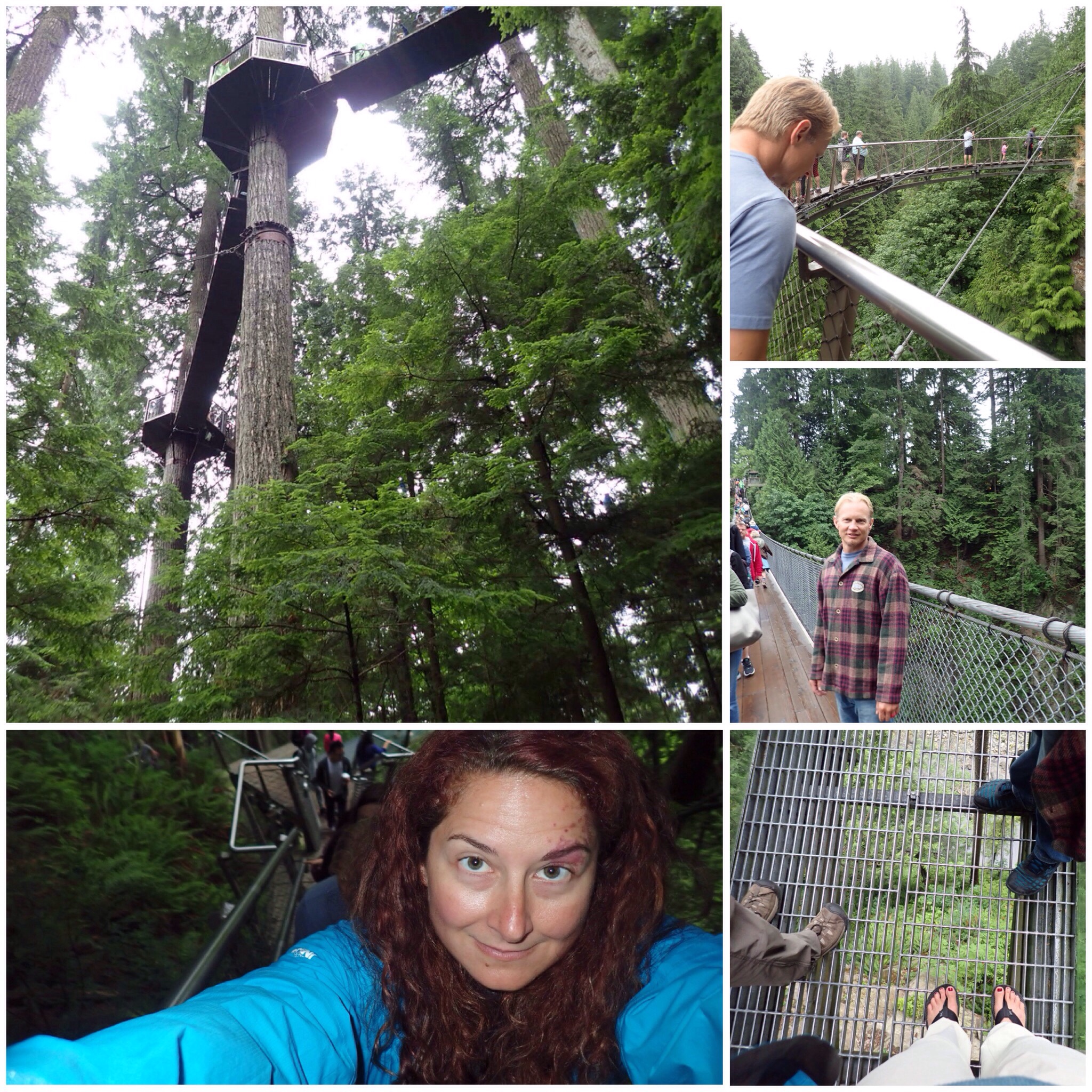 The morning was overcast and we hustled to repackage everything for flying while it was still dry. Once that was done I just couldn’t bring myself to drink another mug of that nasty instant coffee and lobbied for a diner for breakfast. Just a short distance from the RV park we found a White Spot Cafe in a seriously ritzy shopping area, so fancy it contained a Tesla dealership! Breakfast was amazing! Our final sightseeing venture was up to the Capilano Suspension Bridge. I was imaging something akin to the Carrick a Rede bridge we saw in Ireland, basically wait in line to cross a rope bridge to a small island and then back again. Nope, this was a full grade A tourist attraction, complete with park map and informational placards conveniently placed! Honestly, all sarcasm aside, it was pretty neat!