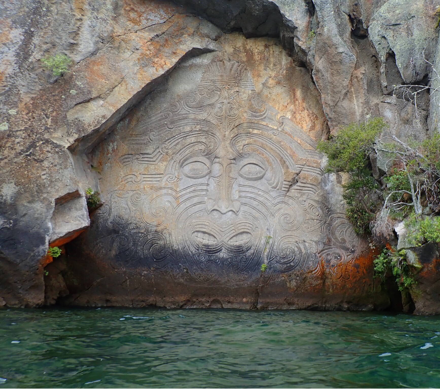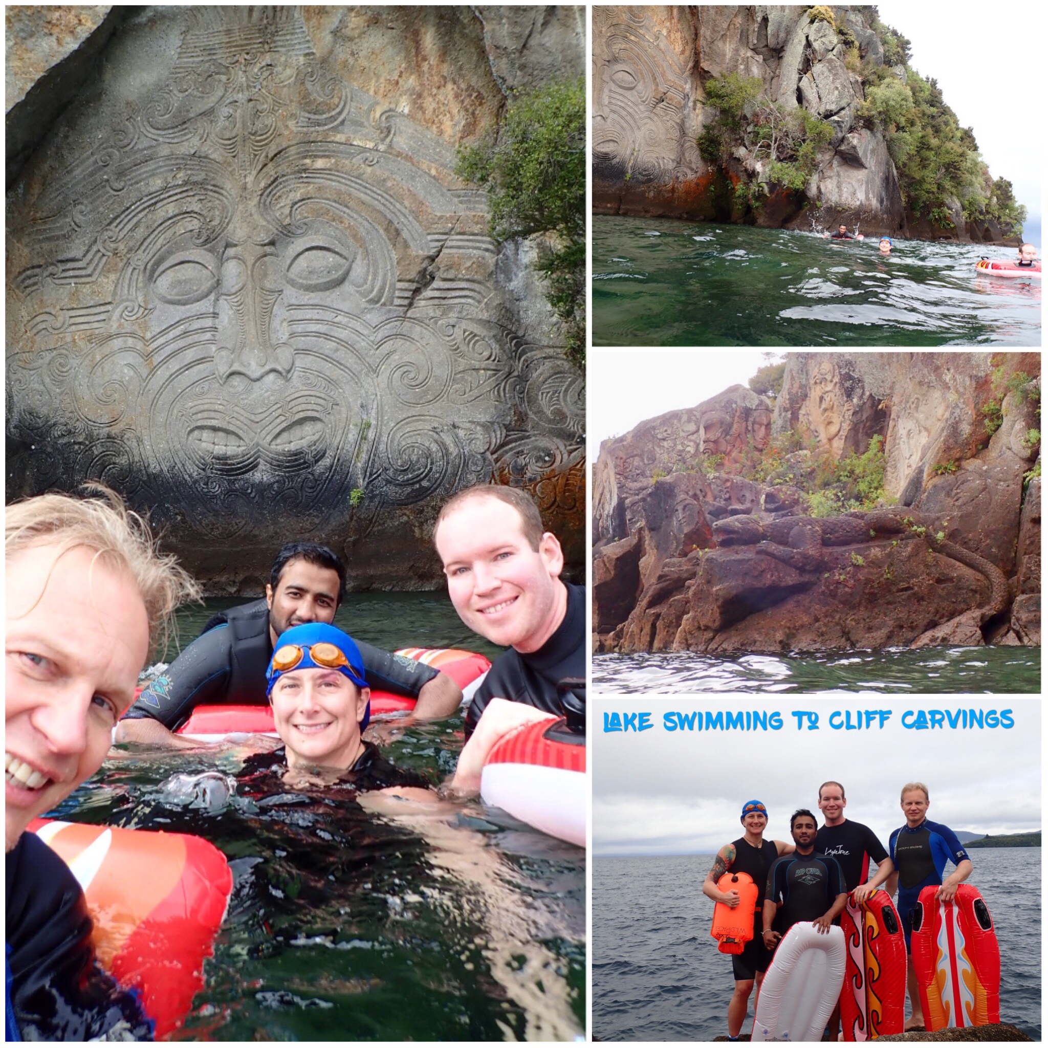 We drove for about 1 1/2 hrs to get to our first adventure of the day, swimming out in Lake Taupo to see the cliff carvings. This was one of those things that you don’t really do but can be done, with enough planning and Steve’s prowess with maps! We donned our shorties, inflated our floaties, and hit the water! We ended up only having to swim about 1/2 km one way and the water wasn’t too cold at all! The waves were minimal and we were able to avoid the large boats taking tourists out to view the carvings.