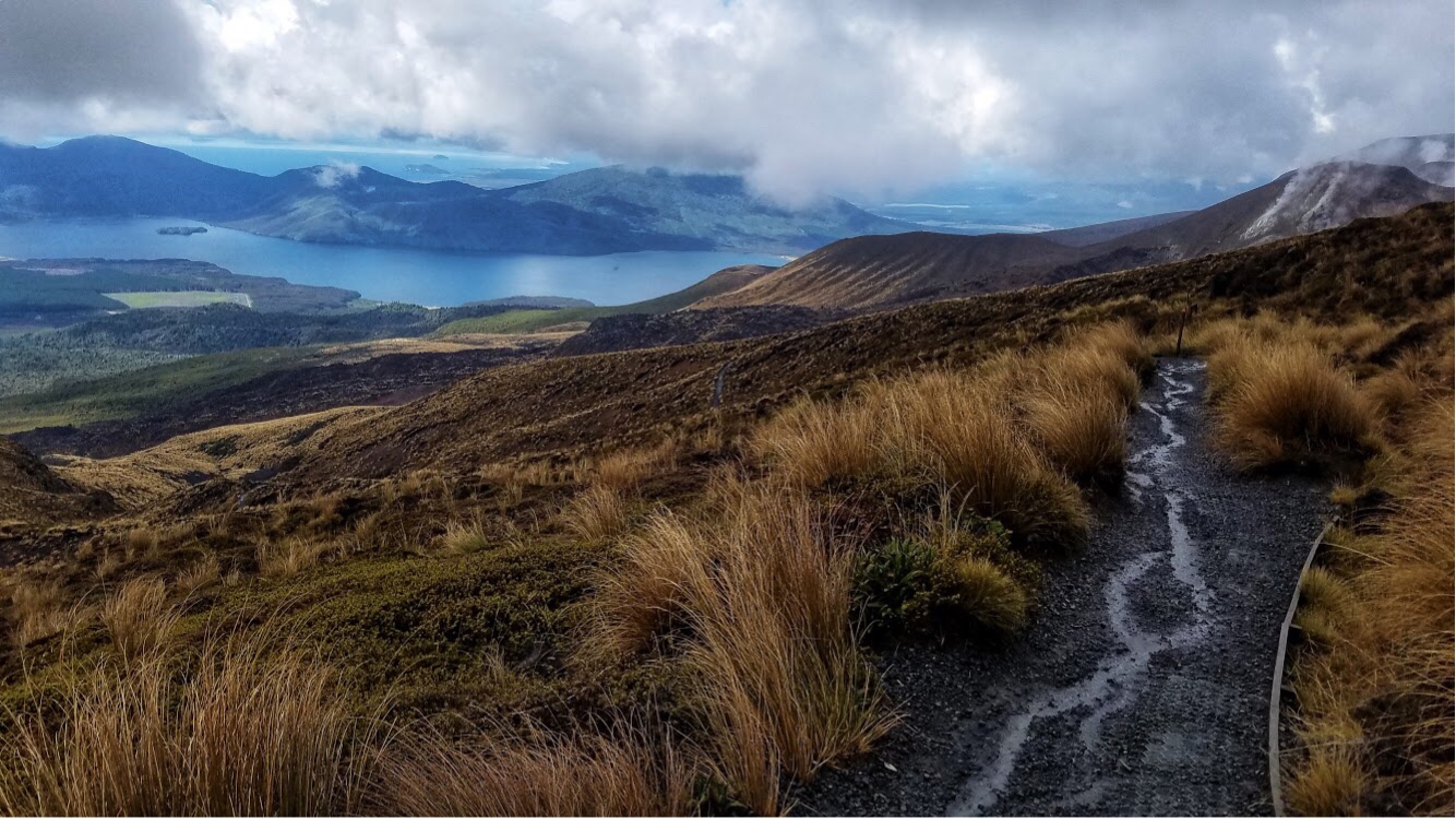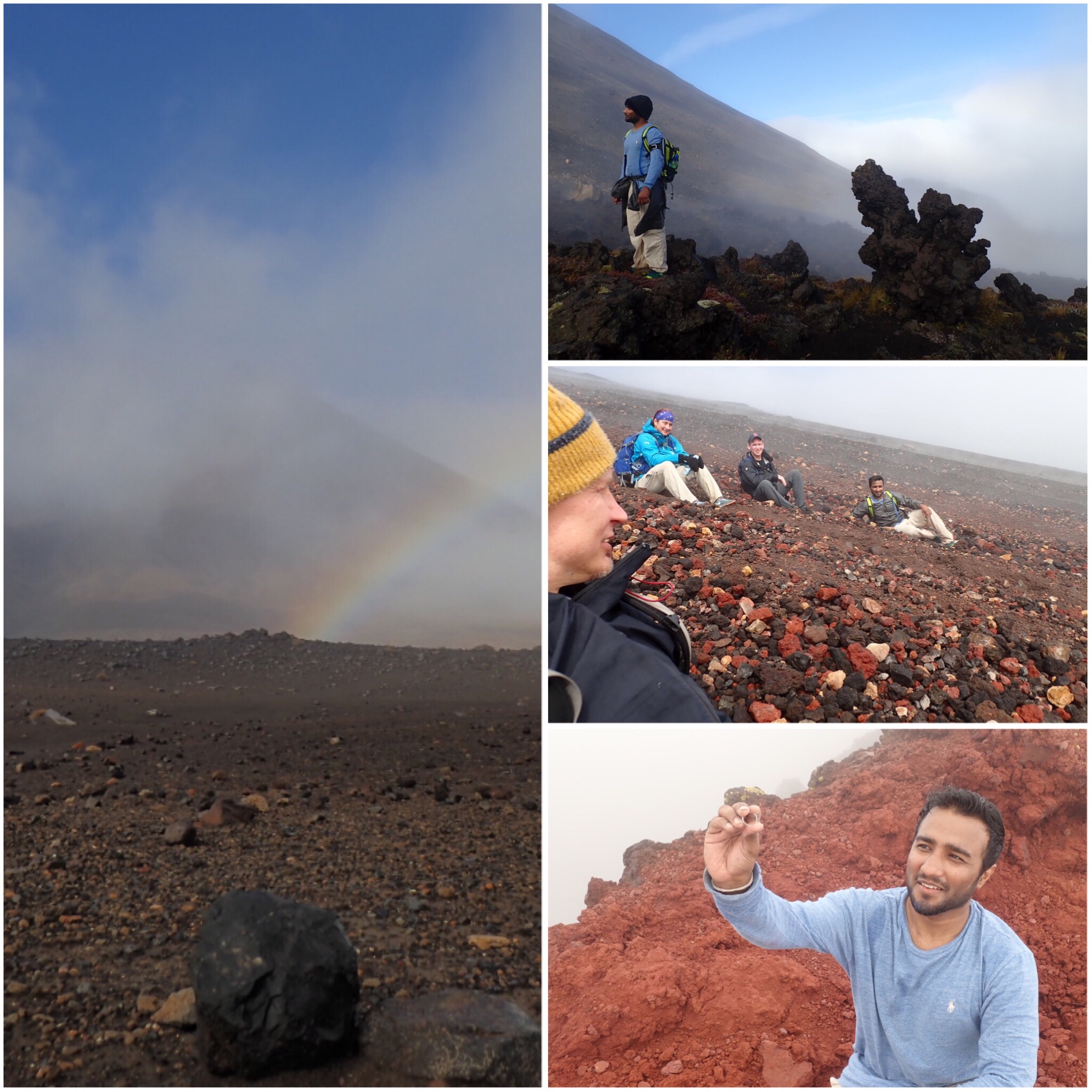 Two hours down the trail, where we were walking upstream of the hoard of hikers, we got our first look at Mt. Ngauruhoe, complete with a partial rainbow! It wasn’t completely clear of clouds but even partially covered it loomed large on the horizon. Josh was questioning that it was the right peak, not completely convinced it was the one. We made our way to the base of the quintessential volcano, the same volcano all of us drew as children, ditched our extra water and began climbing. The start was easy but we quickly got to the part where a scrabble was easier than a walk, at least for three of us! It took us about 2 hrs to ascend the 2037 vertical feet to the lip of crater. My garmin had us at 13 miles at the top. I’m not going to lie, this was really tough! We had about 1/2 hr to enjoy the view, which was mostly cloud covered down slope, before the threat of rain hastened our descent. Going down presented it’s own challenges but we all became pretty proficient in skiing down the rocks.