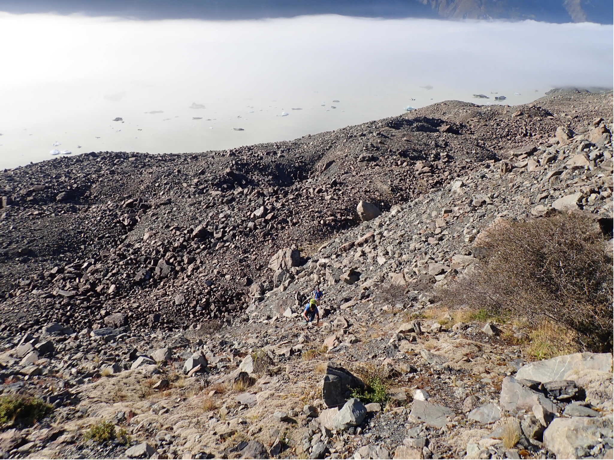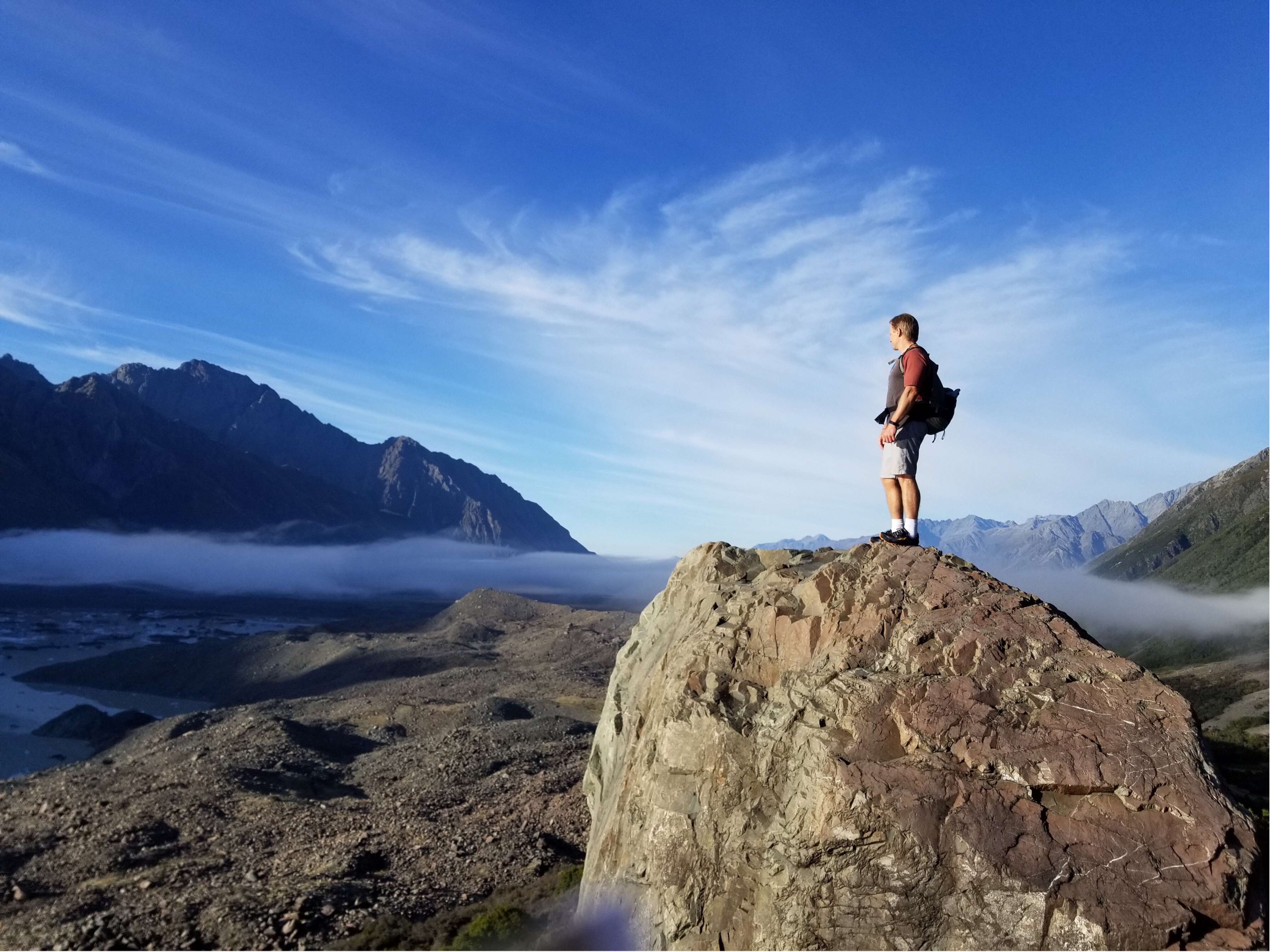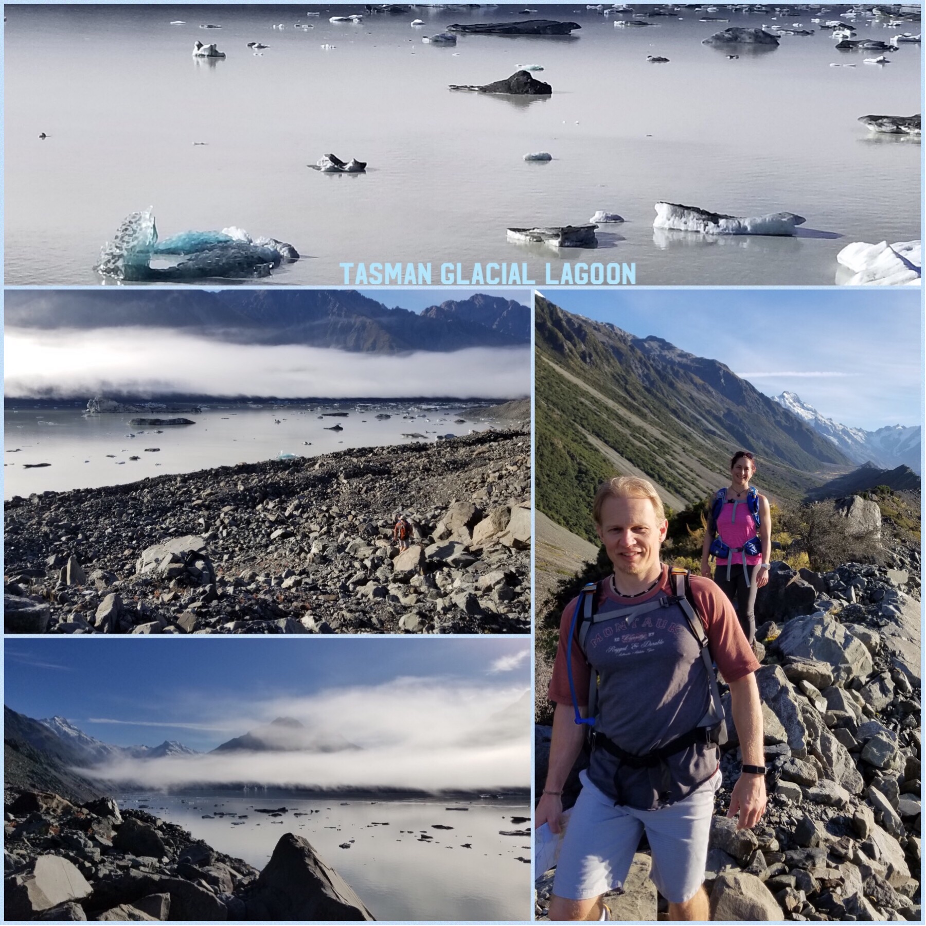 We had a short drive over to the Tasman Glacier Valley to do a short hike before driving north again. This glacier valley wasn’t as accessible as the Hooker Valley glacier so we headed out on a rough track that was potentially a road. We opted to not drive the rental car down it since it was new and not yet damaged (more on that later…) At some point we decided that we were going to run out of time if we tried to hike to the foot of the glacier, so we found a narrow trail heading up the ridge.