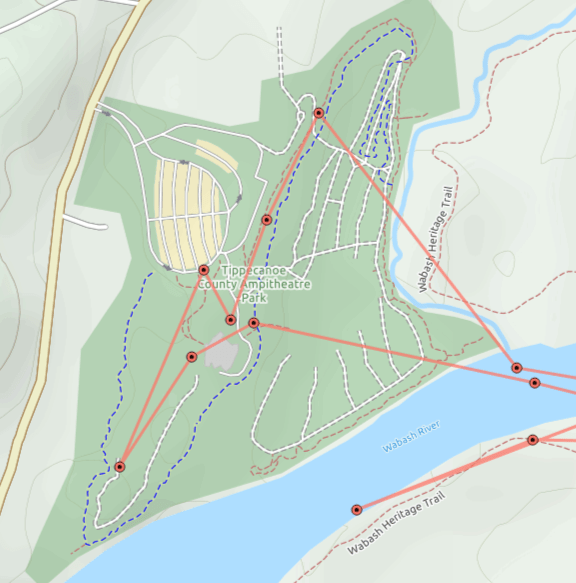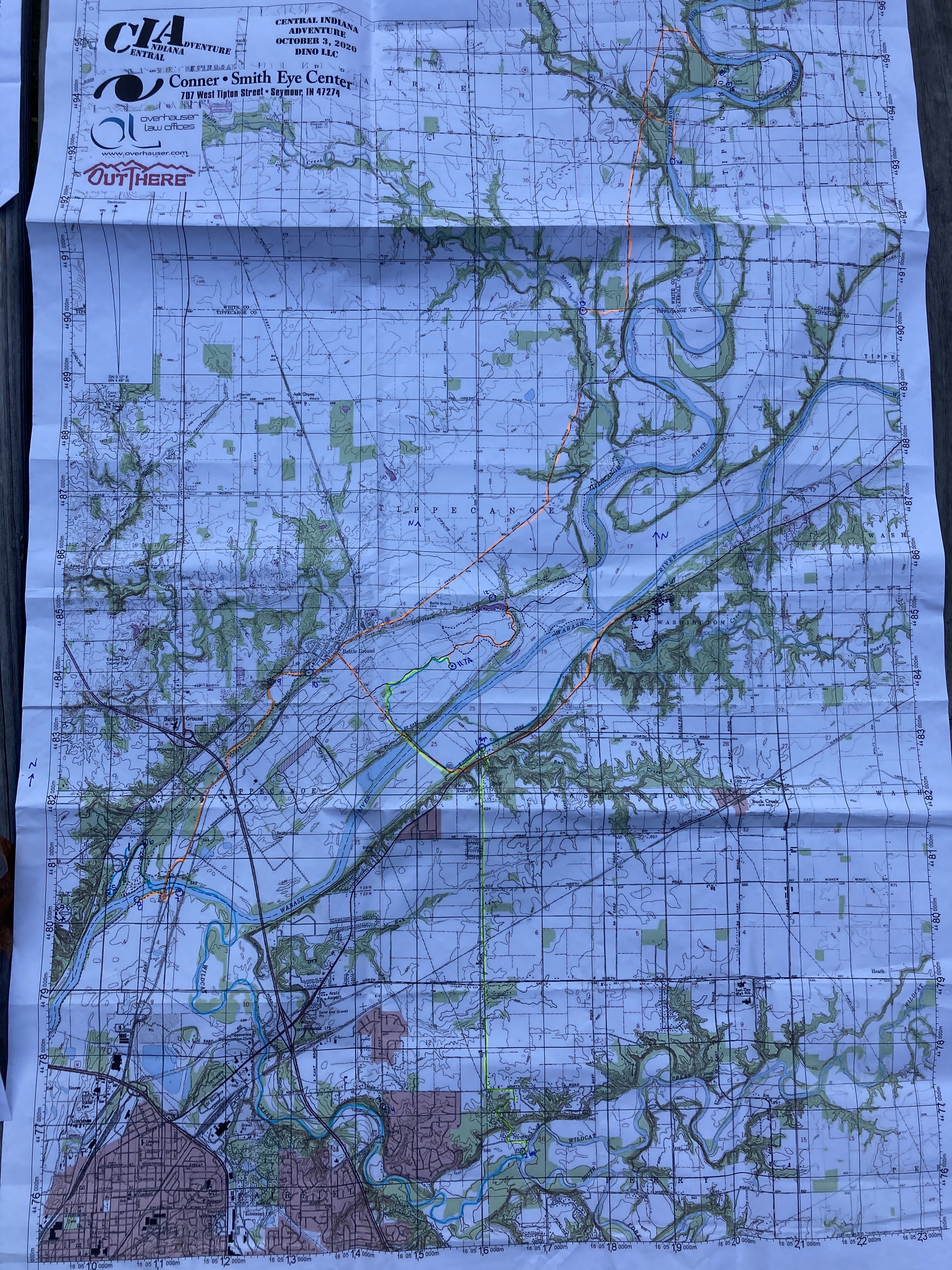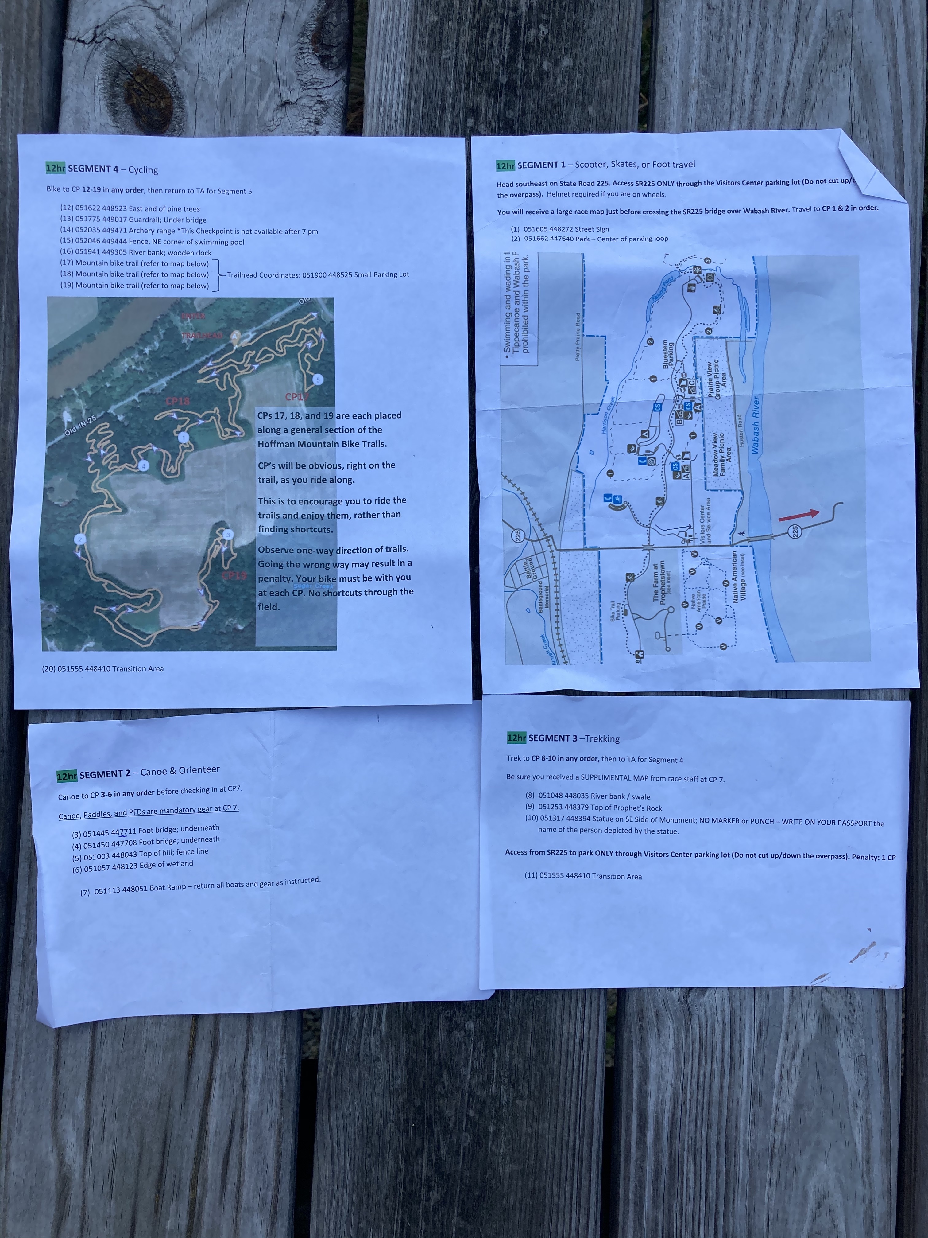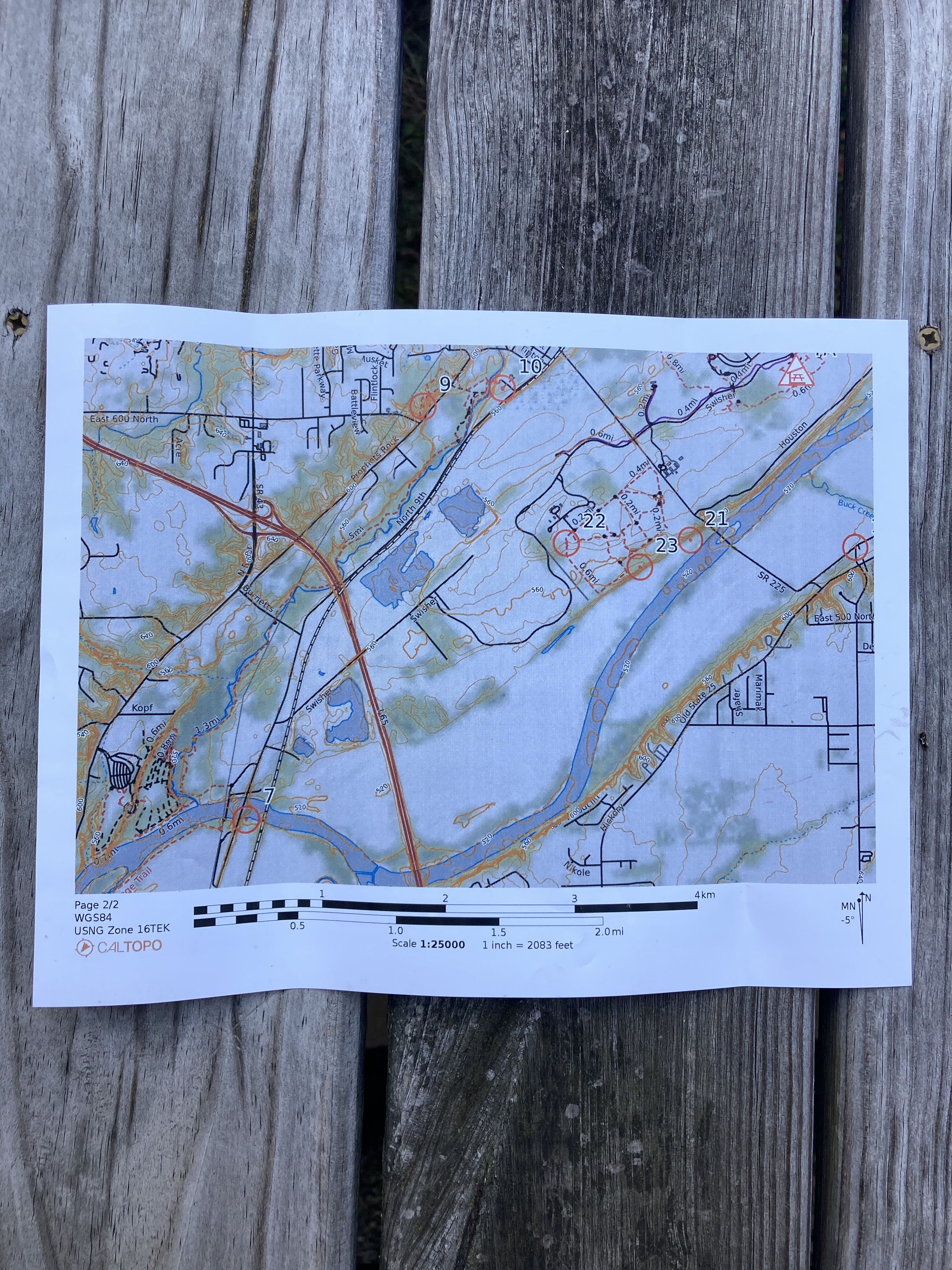 Back in the kayak for a much longer paddle, with many more drags, until we hit the Wabash river. The next trek had a clear mark of where to get off the river so I beached and headed into the bush. I knew there should be a trail to my left, so cut across and was pleased to find it! I was thumbing the map, looking at the compass, and trying to get my soaking wet feet to warm up so I could jog. Everything seemed to be going so well…. The map we had showed 2 trails, and I was looking for sharp corner as my landmark. I guess I got onto the middle trail instead of the outermost one, then I bushwhacked over, completely missing my sharp corner. From there, chaos ensued. I basically did the thing where I ran around randomly for a bit, then said screw it, go find the other point and then at least I’d know where I was. I went up the amphitheater and had a short sit down in the sun, unfolded the map to get a bigger picture, and then still didn’t know where I was. This happened at the last race as well. It’s like my brain just goes NOPE, I will not help you with this task. I did see a big field, and I did see other races crossing it so I followed and yep, there was point #5. From there I was able to make sense of the map and hiked back to get #6. This time paying super close attention to the trail directions and sticking to the outside. A quick jog back to the water and then this leg was done!