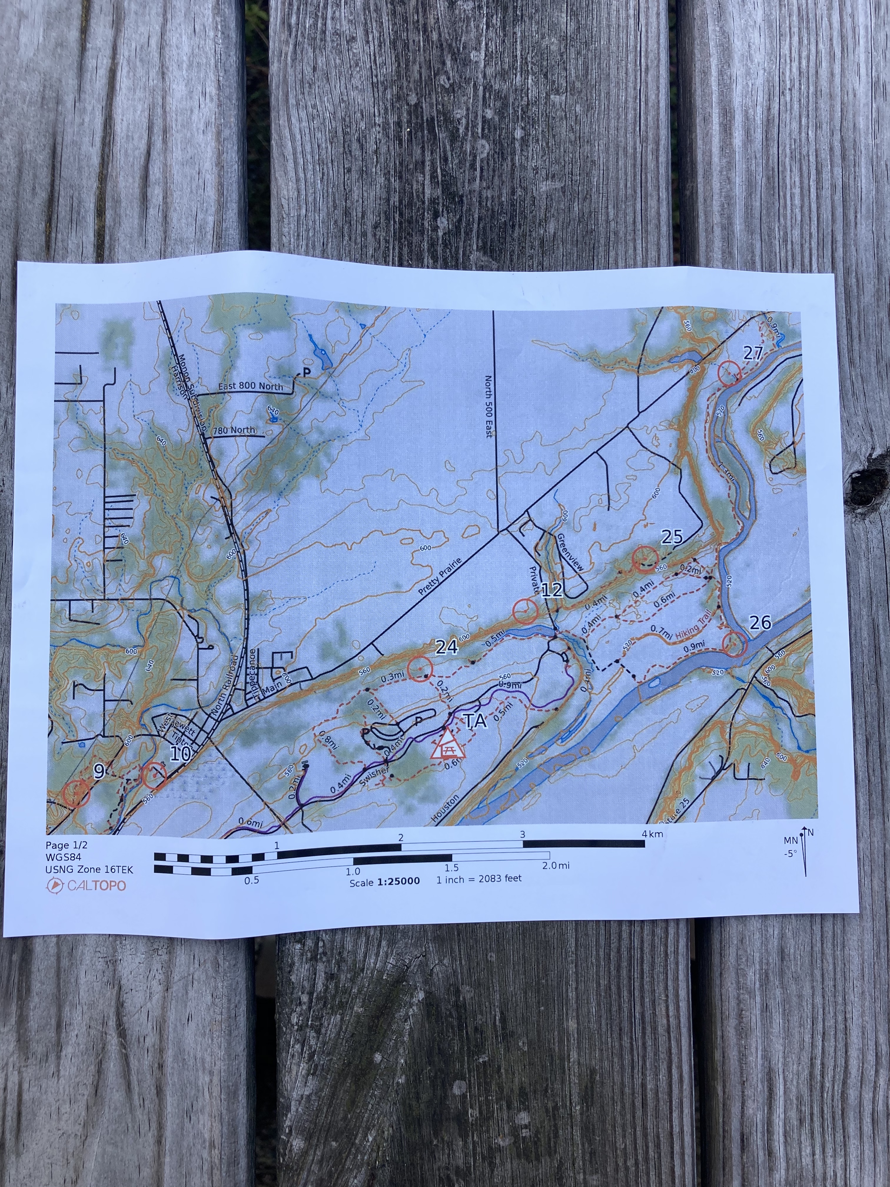 Scooter Leg: 3,2,1 – GO!! I put myself in the mid back pack to start since my scooter skills are not great. I was pleased to see how much easier the large wheels did than the smaller ones and I slowly made up some space. My right glute probably grew 2” during this segment since I wasn’t able to alternate pushing legs very well! We scootered to the Visitors Center and were given our large map and had 2 points to plot. This was my first time plotting solo so I was slow at it but the points made sense so I went with it. Back on the scooter and off to the one lane bridge. Just across the bridge, my stupid compass lanyard closure failed (really a bad design) and my compass fell off. I heard it and immediately stopped. Luckily there was a kind rollerblader behind me who almost crashed rescuing my compass from the truck that was barreling down on us! The truck wheel was perfectly in line to crush my compass! Thank you unknown racer! Checkpoint 1 was a road sign, easy to find! From there it was a big uphill and then a straight shot down a very long road. I wasn’t sure how I’d feel after a 7 mile scooter but I can confirm that if I had run it, I would have been hurting a lot more! At the end of the straight shot, we turned left and then into a housing division. Some fun downhills and then out to the park where we switched to the canoe/kayak leg.
