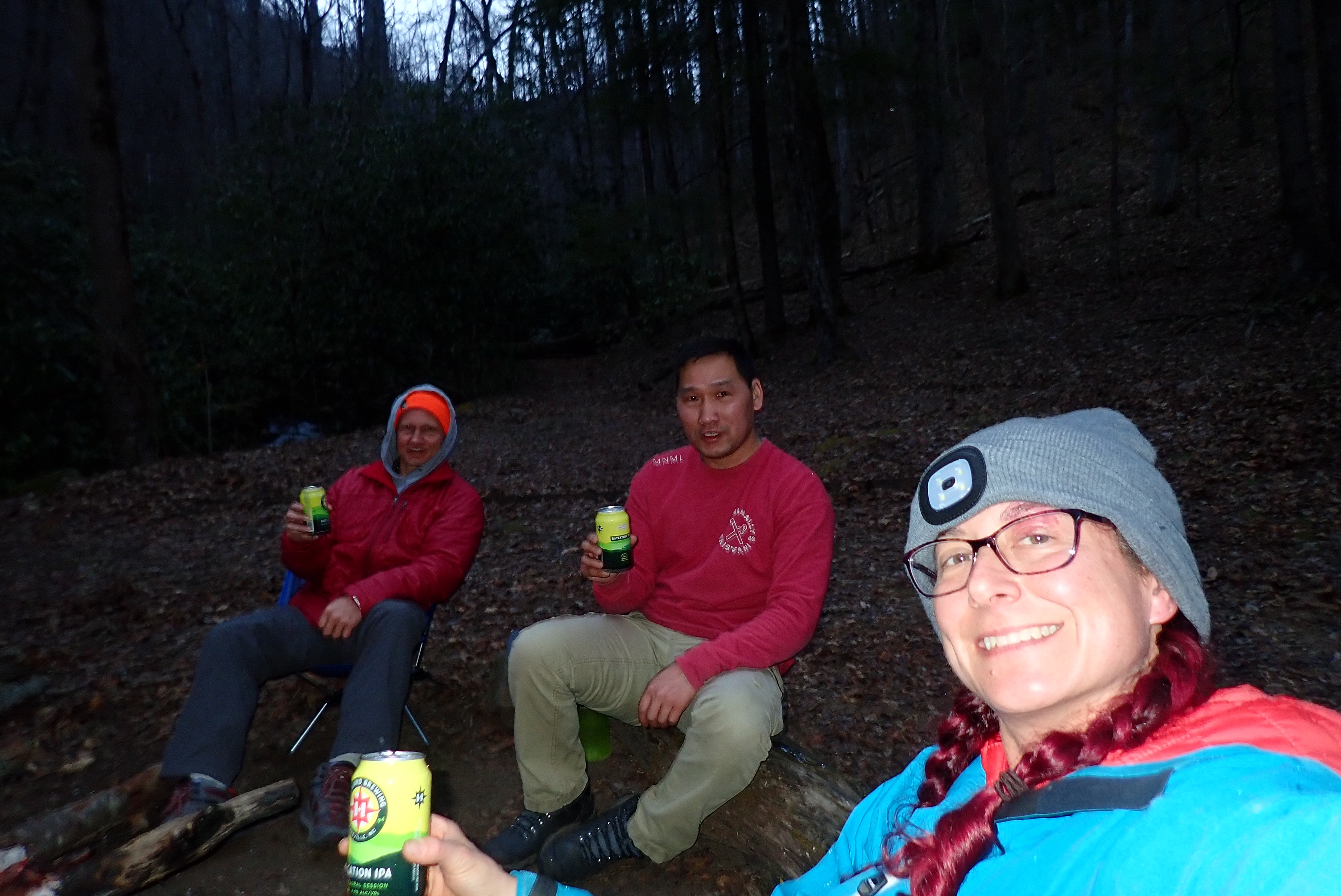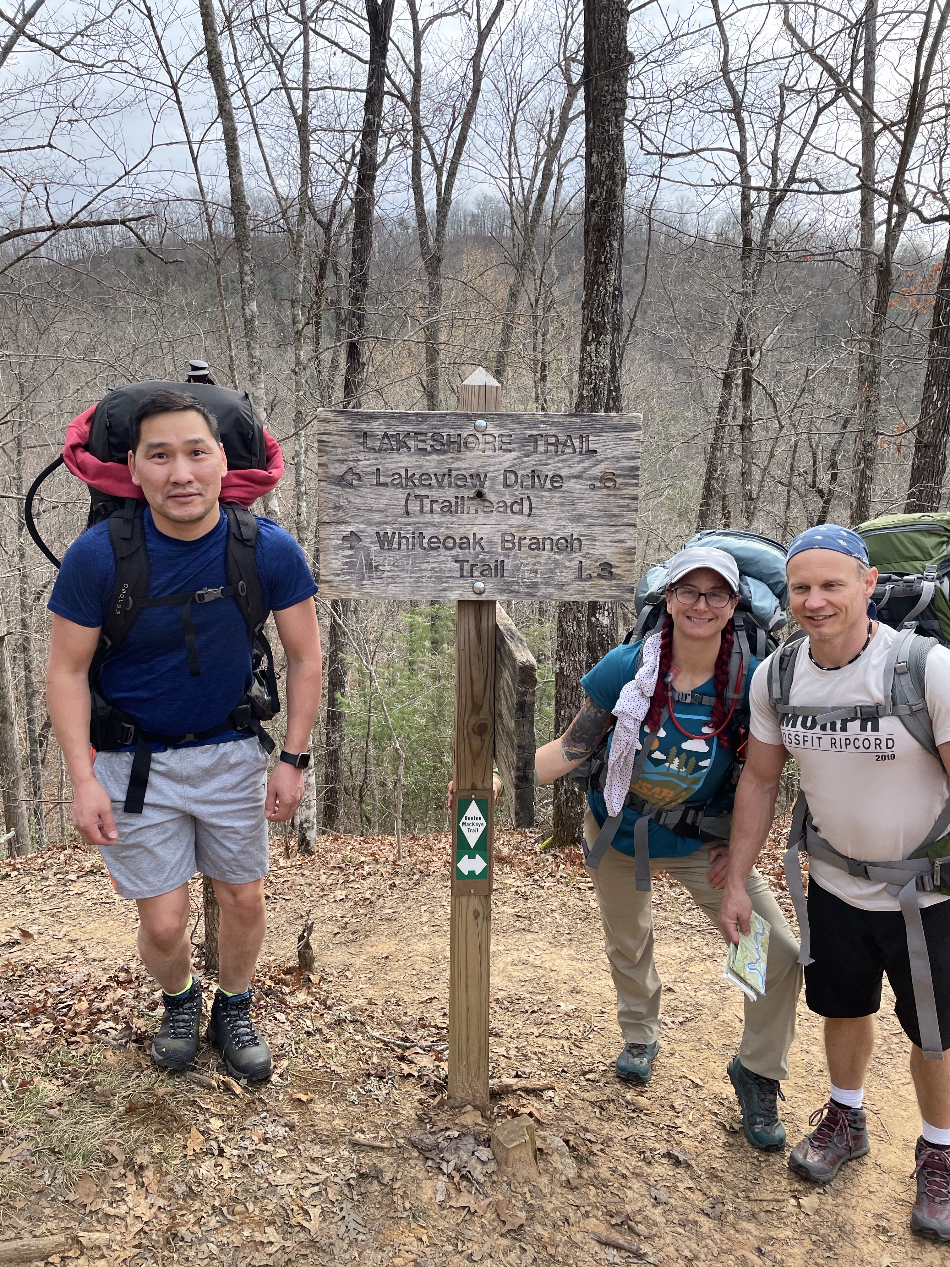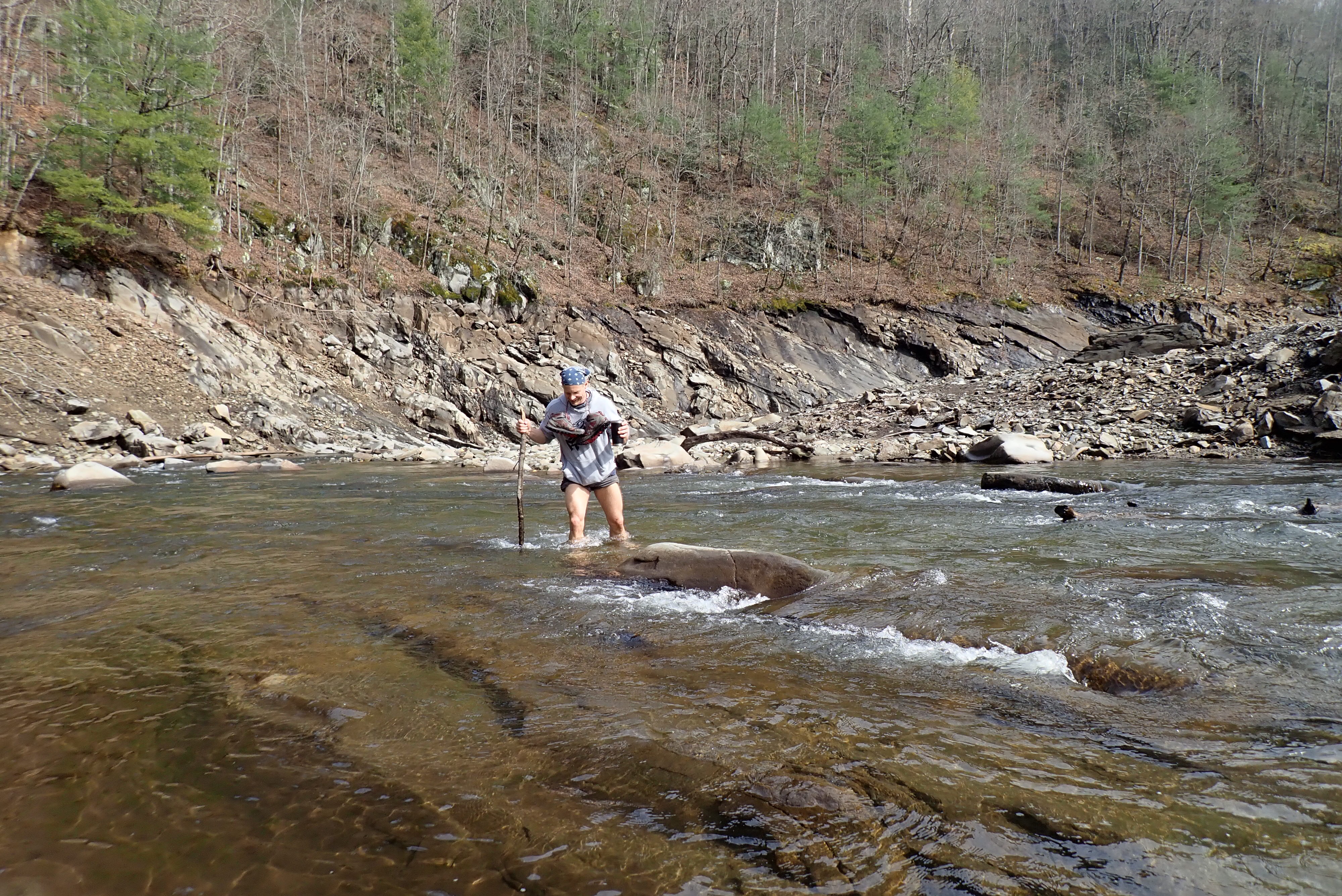 Monday March 15 – Day 1 of hiking: Bill drove us the the trailhead for the start of our hike. We began at the Tunnel to Nowhere and continued on the Lakeshore Trail. Day 1 was about 6 miles to our campsite. The trail was wide open and we made good time. We missed one turn and headed down to the lake shore instead of skirting around the cove. This was fine but it did result in our first creek crossing since the trail we needed was on the other side! The water was swift and cold but thanks to Tserka’s hiking poles (I’ll be buying a pair for myself!) and my Crocs, the crossing was a piece of cake! From there we made camp with light to spare and got everything set up. The guys had hiked in 3 beers so after chilling them in creek we enjoyed a tasty beverage in a dry (for now) camp!