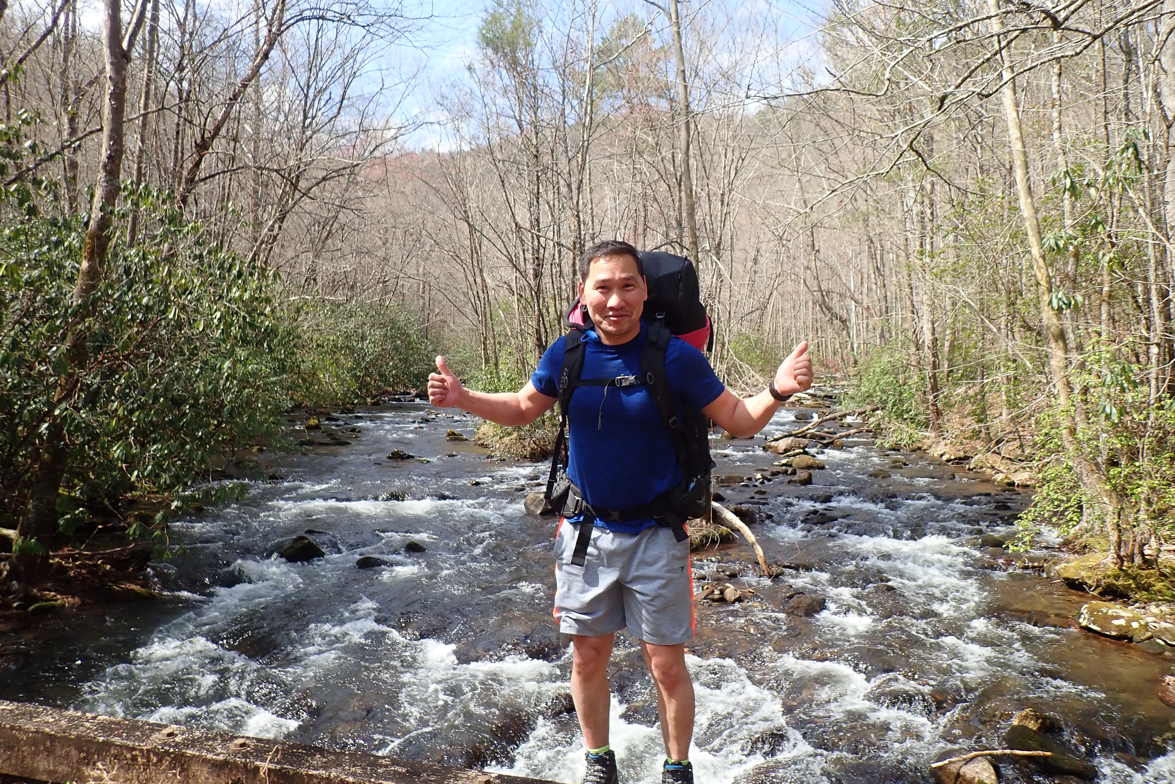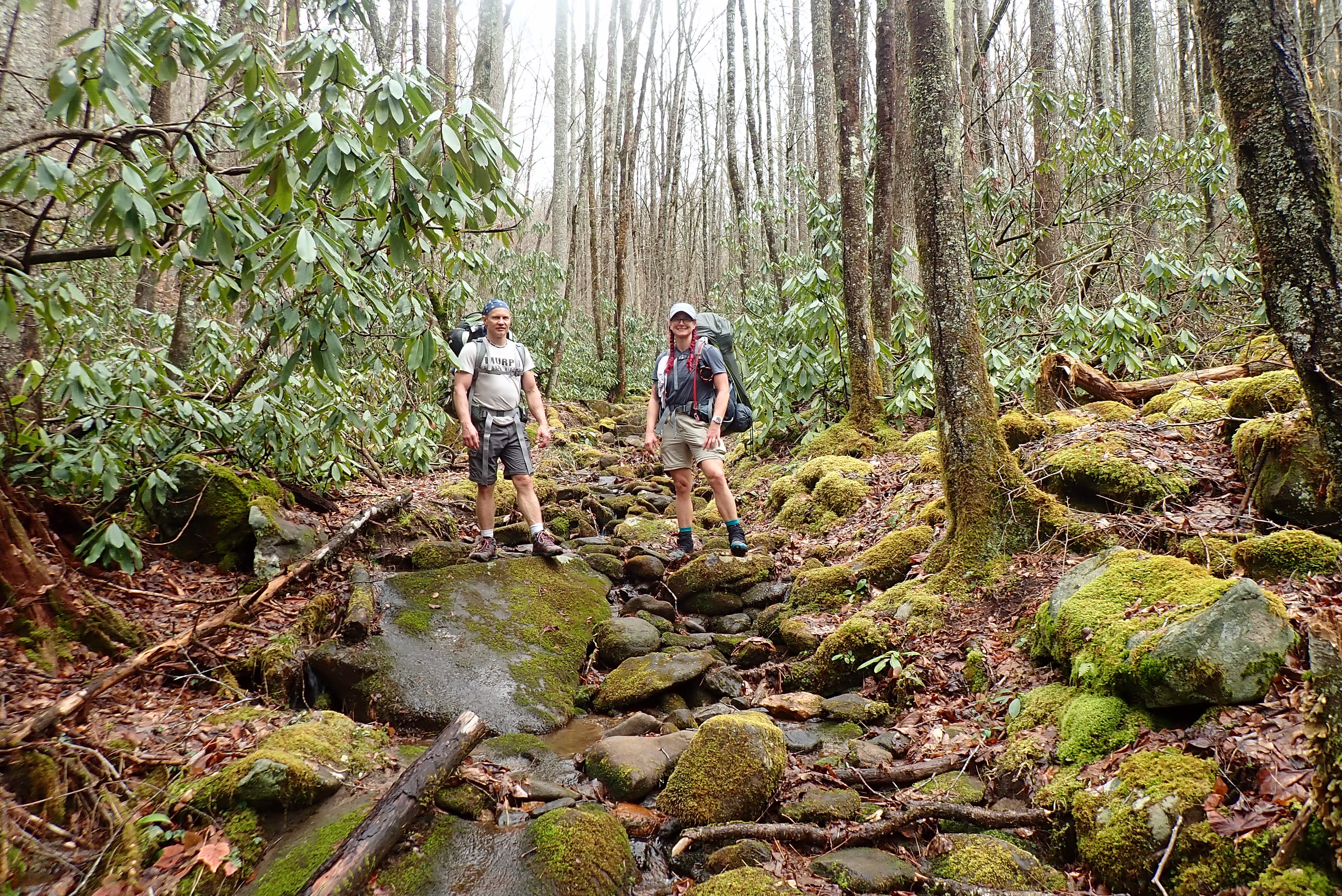 The last 2/3 of the hike was mostly downhill, which should have been much easier. The only issue is that most of the time the trail was just the creek bed, so lots of large rocks, slick mud, and beautiful moss. If the ups were all hammies and glutes, the downs were all quads. We got to Hazel Creek crossing, which was marked on the map as a high water crossing. The patented Crocs and pole method served me well again! We rolled into another empty campsite with just enough light to spare to get the tarp strung up and the tent under the tarp, in case of rain. Dinner was Beef Pasta Primavera from PeakRefuel and it was delicious! No rain, a nice fire, another day well done!