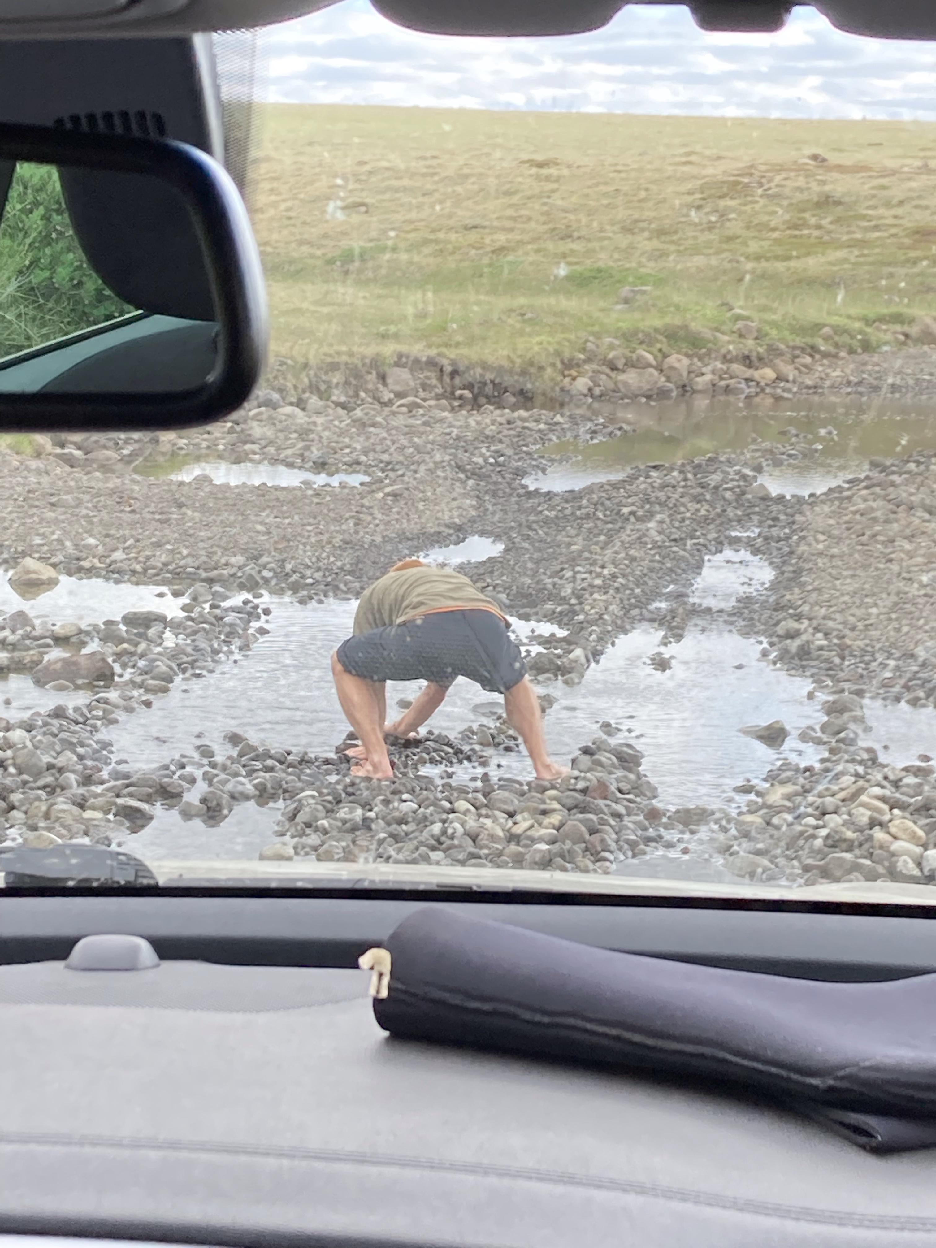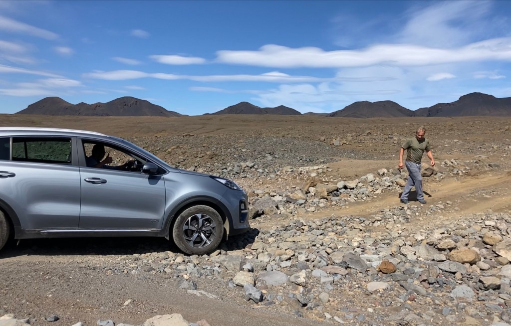 Our first day and “night” were spent at the Hagavatn cabin area, accessed by our first and roughest F road, F335. This was every bit of 9 miles of rough road, taking us about an hour and fifteen minutes to travel. Can it be done in a Sportage? Yes… Should it be? Probably not, unless you’ve also brought along your own road crew. We’ll see what the damages are when we return it! Steve had looked over lots of resources and was prepared for one big river crossing that he didn’t think our car could do. When we got there we found it bone dry.
