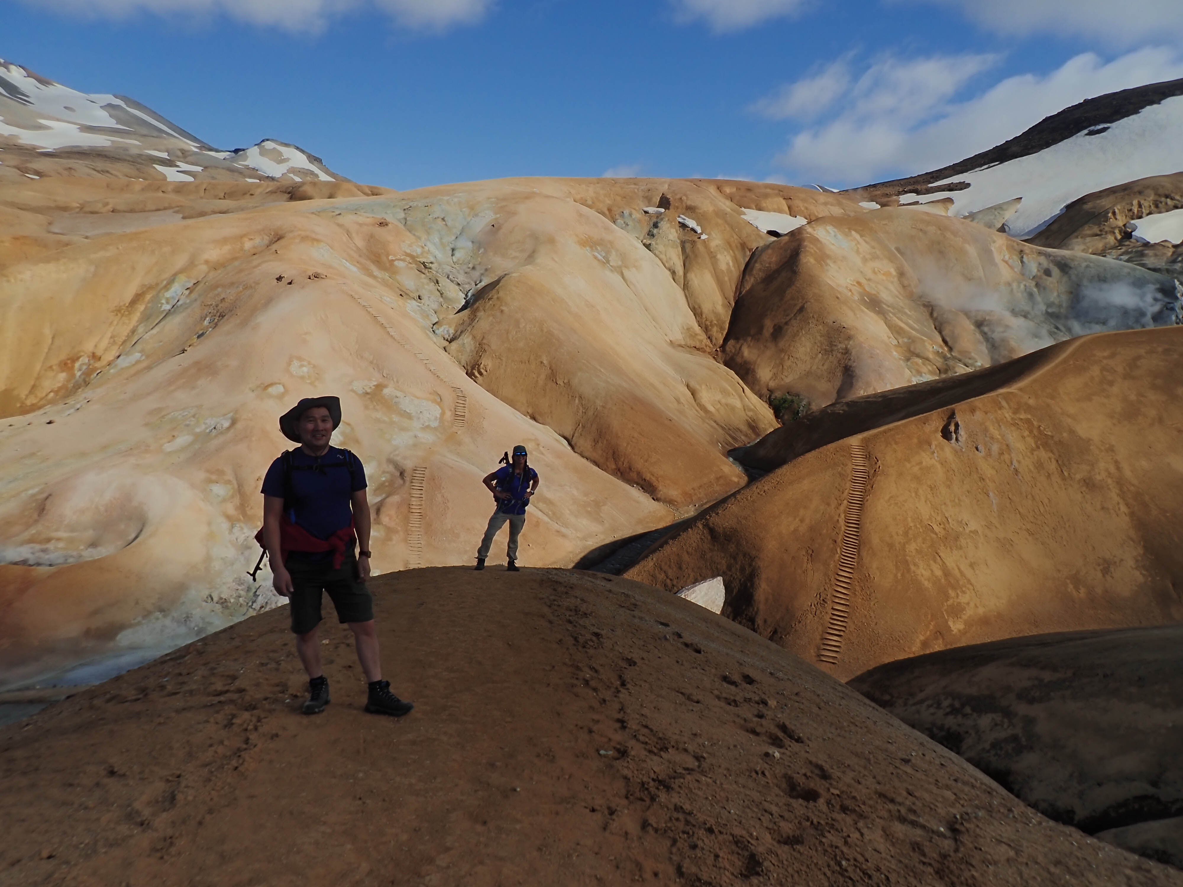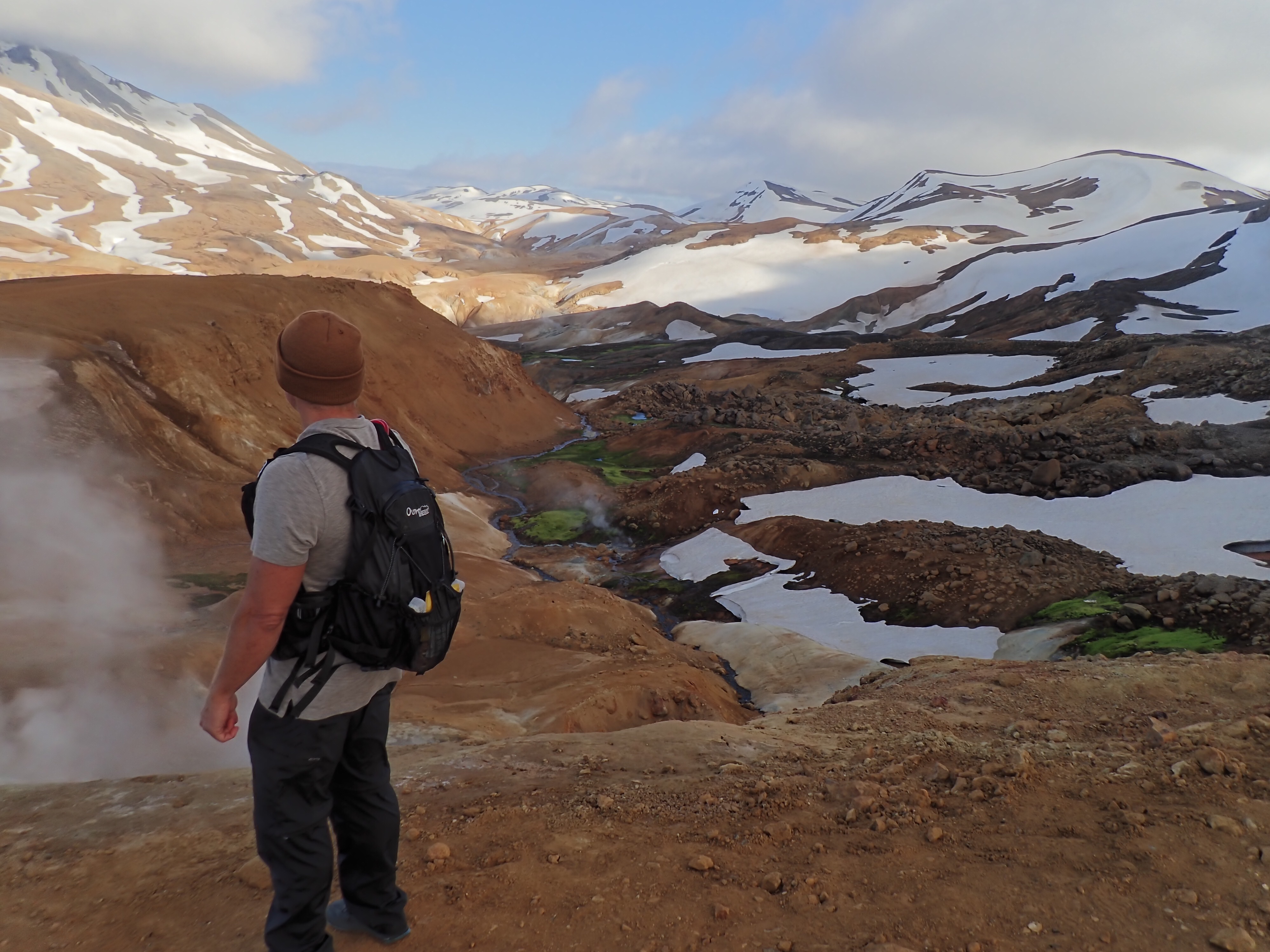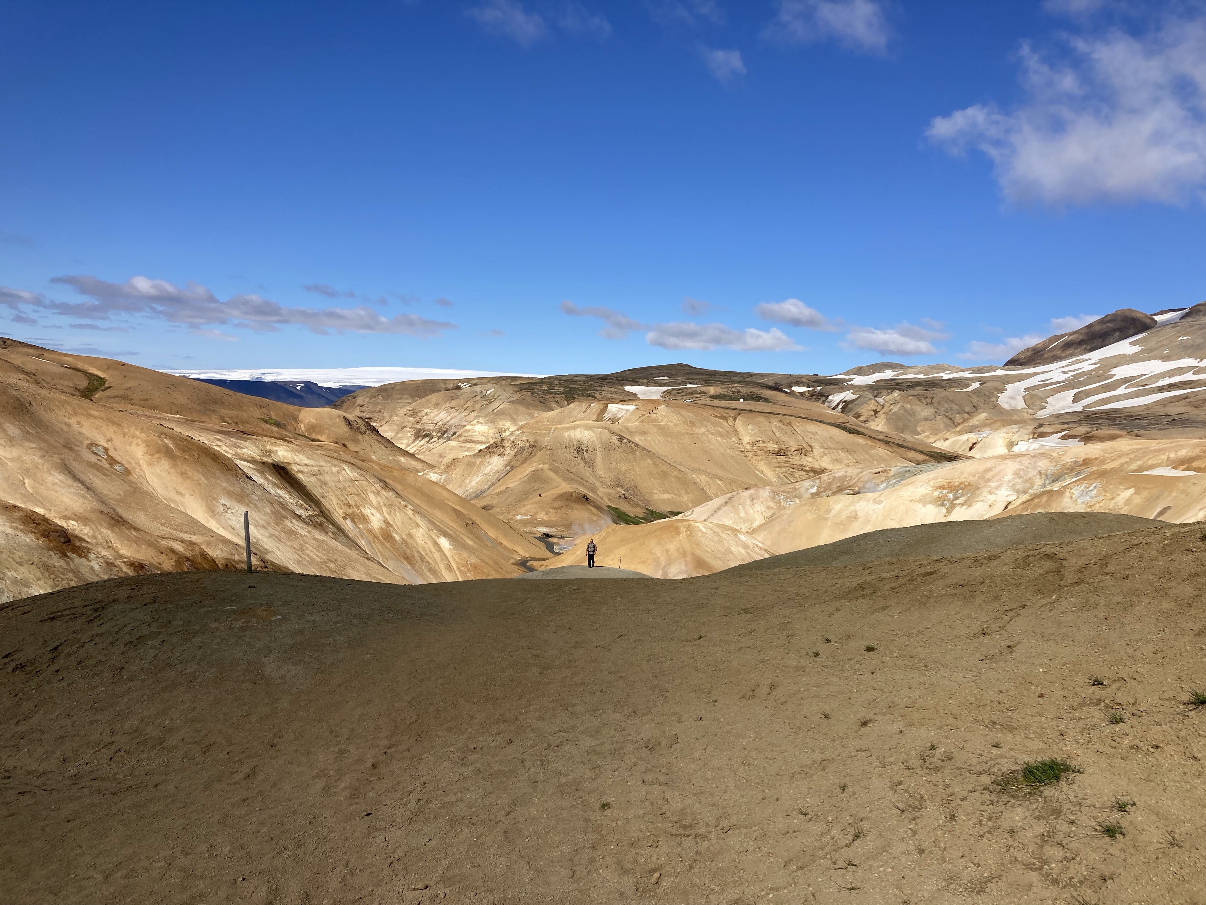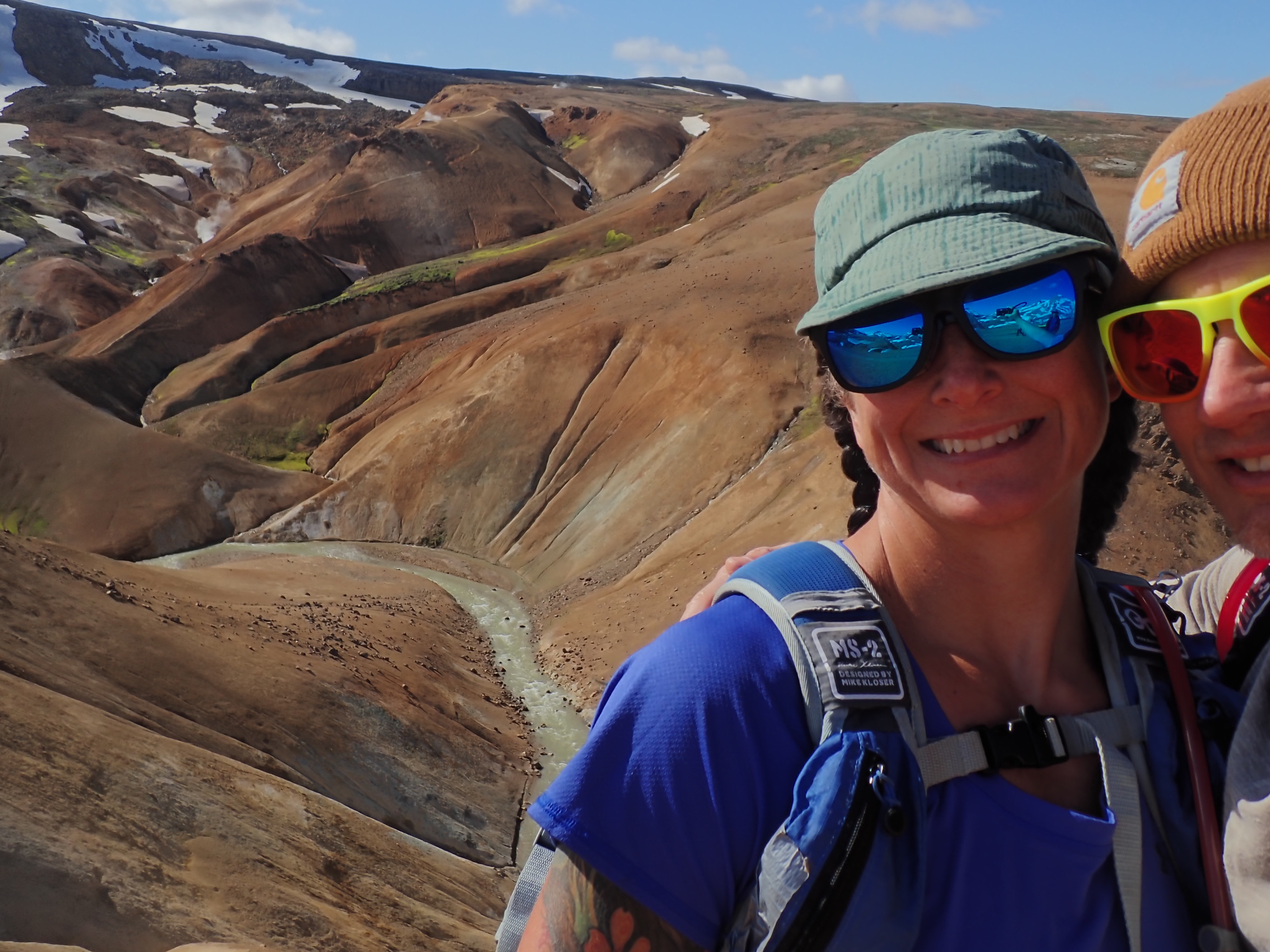 The Kerlingarfjoll Mountain resort was a lovely set of huts nestled in a valley. The camping fee included showers, and a kitchen hut. The big draw for this resort was it backed up to the Hveradalir Geothermal Site and that is had a hot spring a short hike away. Our plan was to do a big hike around the mountains and then a short loop around the geothermal area. We had a later start than planned so by the time we got started for the hike, the sun was out but clouds were moving in. We nixed the big mountain hike since by the time we made it to the top it would be completely clouded over and instead did a bigger loop in the geothermal area. This was a great choice! Such a cool area with tons of thermal activity! There are no hot springs you can sit in here but the views make up for it! We tootled around for 2.5 miles and took way too many cool pictures!