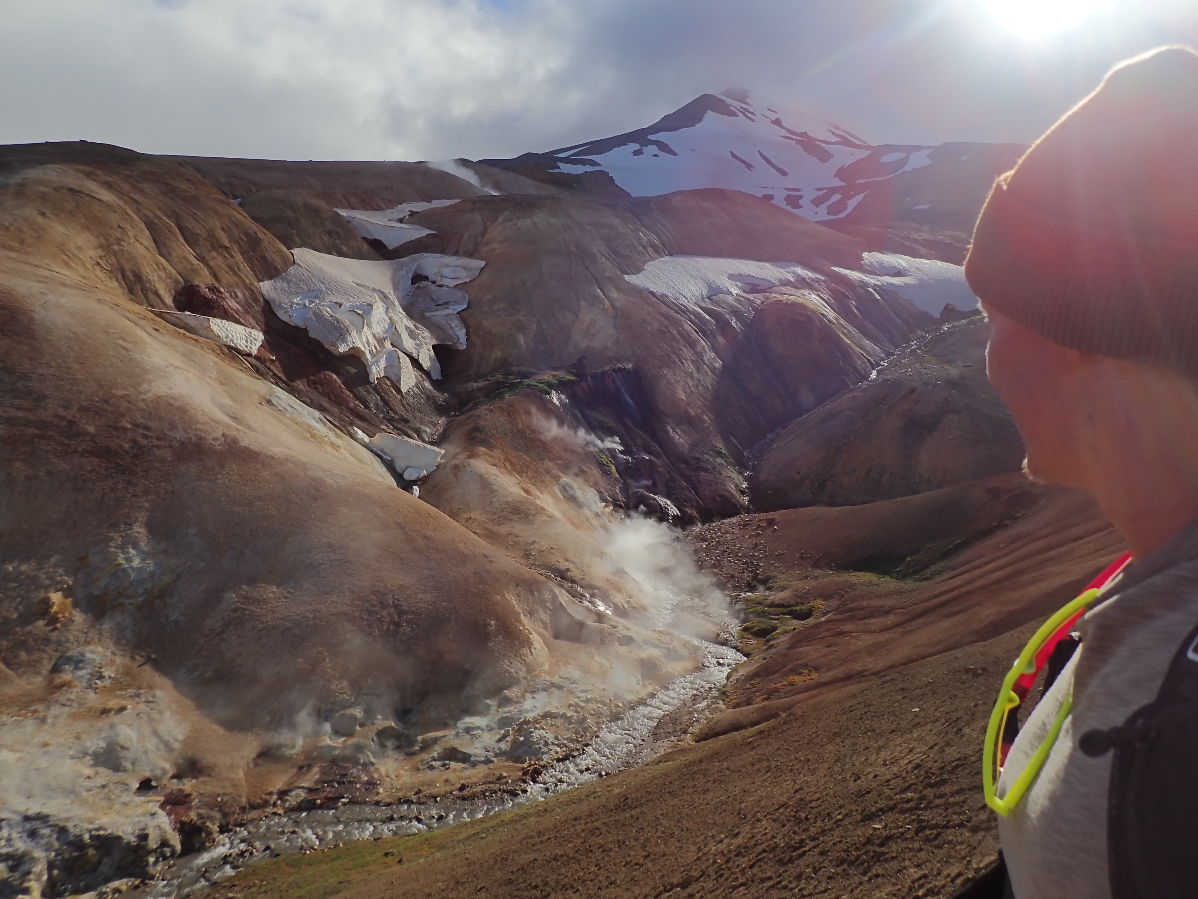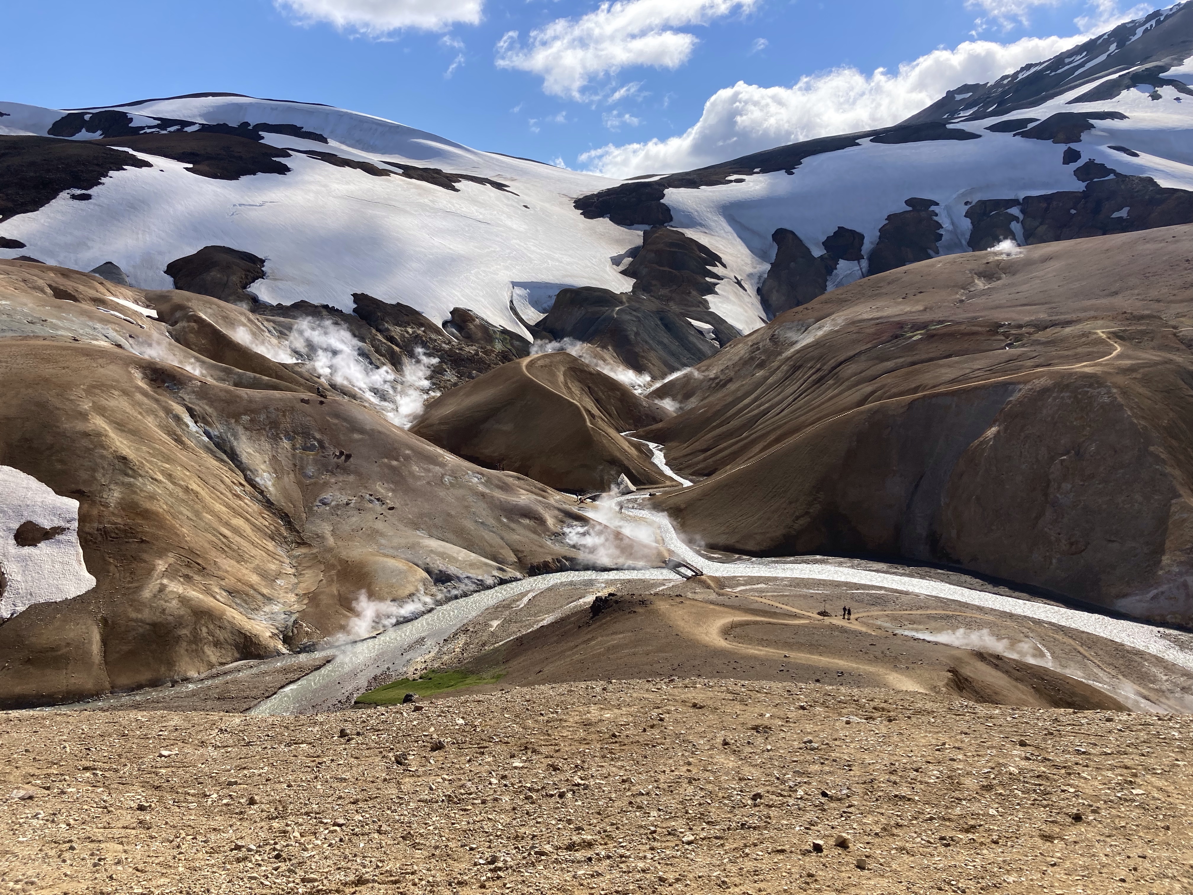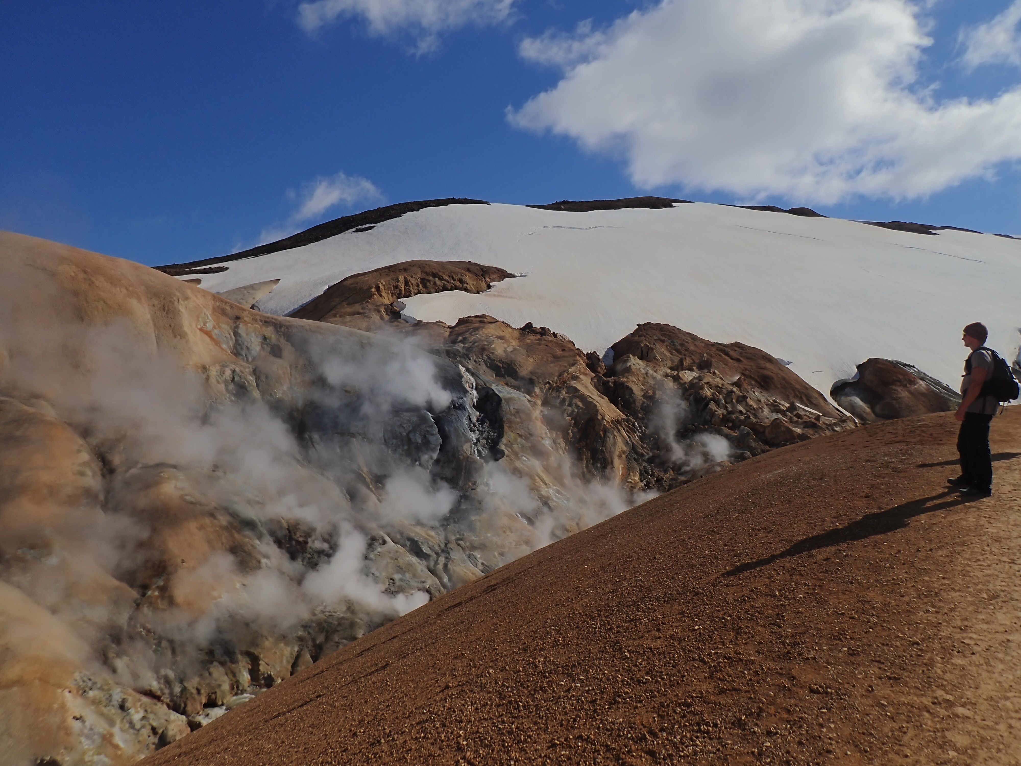 The Kerlingarfjoll Mountain resort was a lovely set of huts nestled in a valley. The camping fee included showers, and a kitchen hut. The big draw for this resort was it backed up to the Hveradalir Geothermal Site and that is had a hot spring a short hike away. Our plan was to do a big hike around the mountains and then a short loop around the geothermal area. We had a later start than planned so by the time we got started for the hike, the sun was out but clouds were moving in. We nixed the big mountain hike since by the time we made it to the top it would be completely clouded over and instead did a bigger loop in the geothermal area. This was a great choice! Such a cool area with tons of thermal activity! There are no hot springs you can sit in here but the views make up for it! We tootled around for 2.5 miles and took way too many cool pictures!