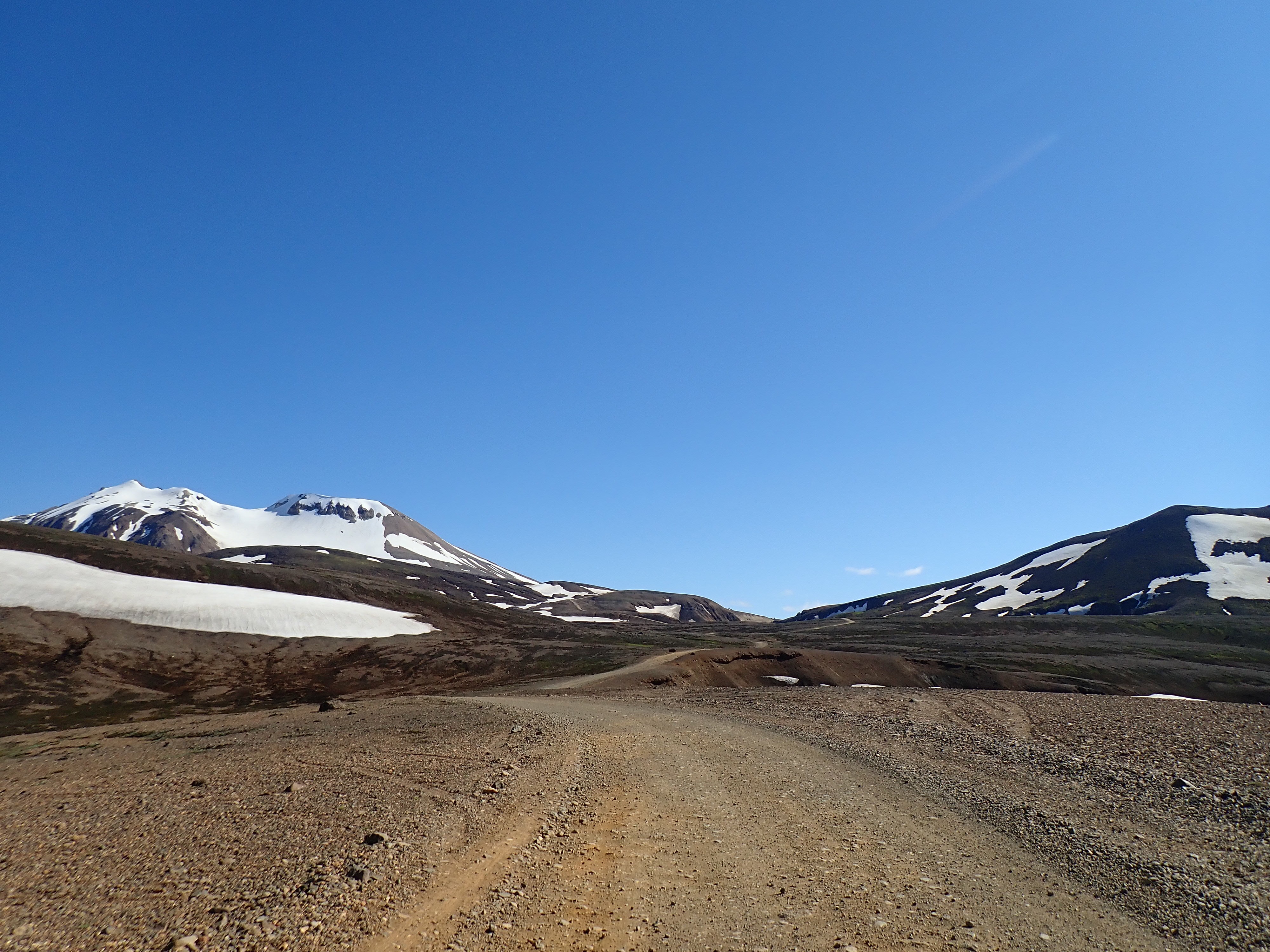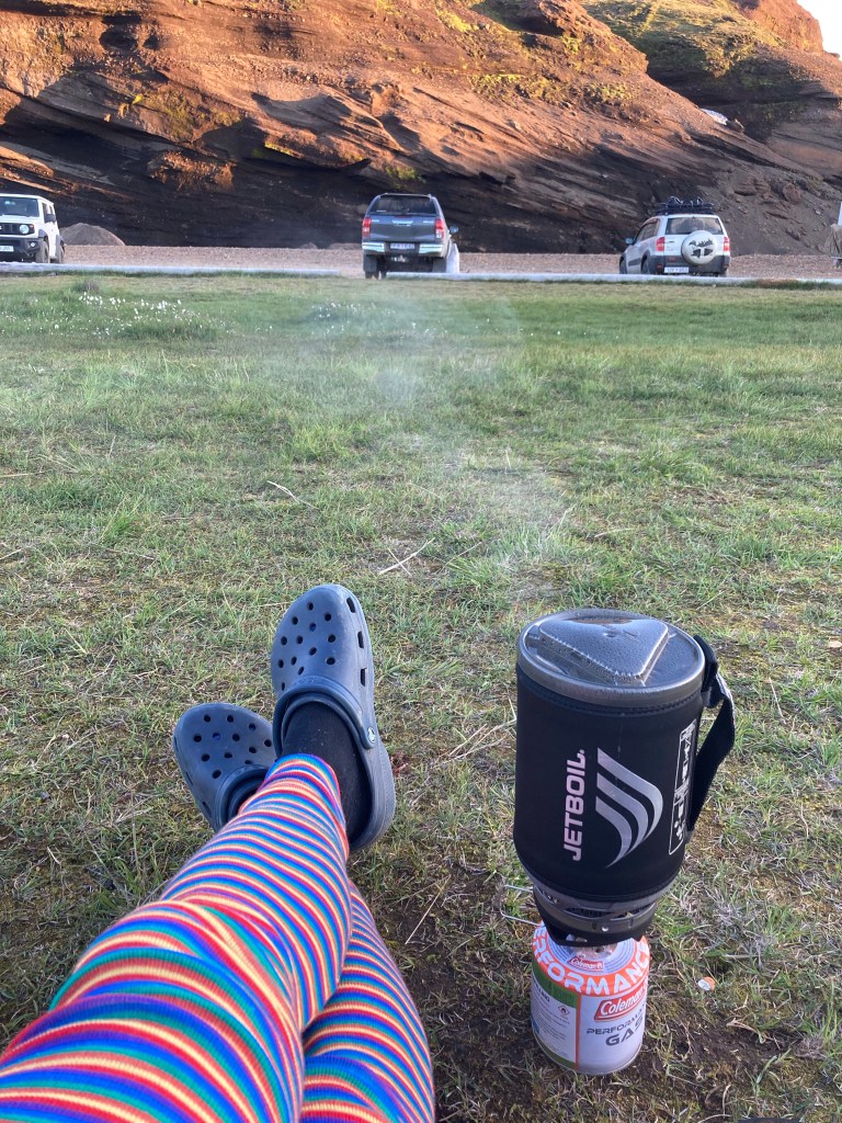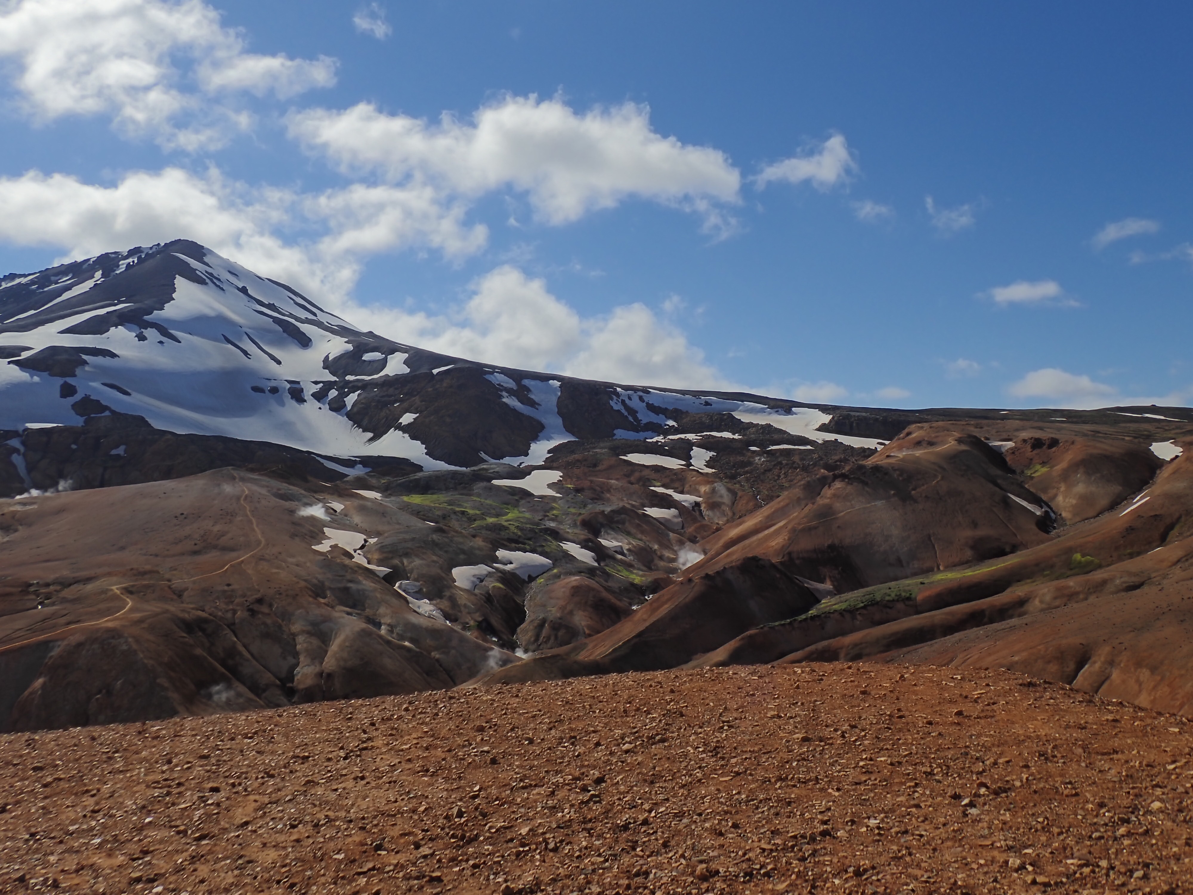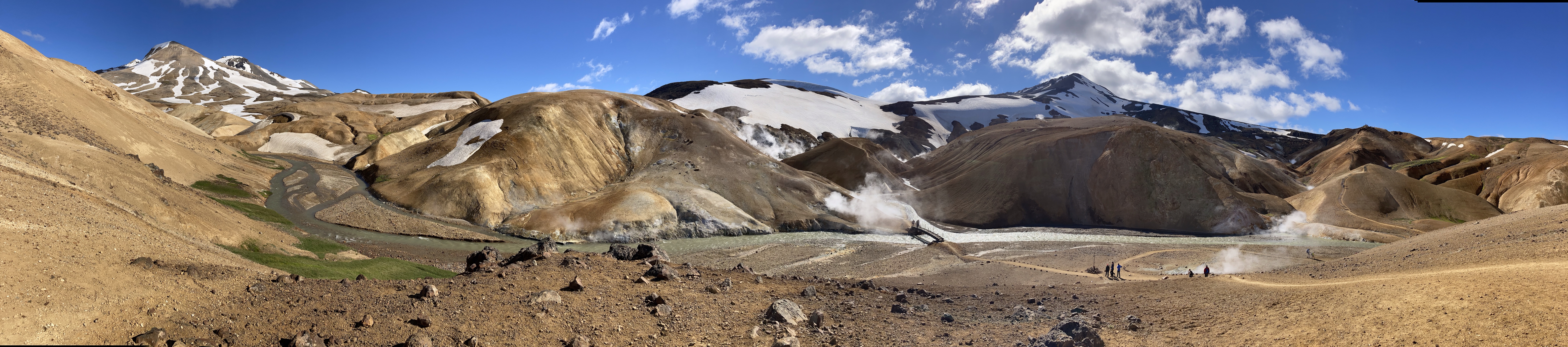 The Kerlingarfjoll Mountain resort was a lovely set of huts nestled in a valley. The camping fee included showers, and a kitchen hut. The big draw for this resort was it backed up to the Hveradalir Geothermal Site and that is had a hot spring a short hike away. Our plan was to do a big hike around the mountains and then a short loop around the geothermal area. We had a later start than planned so by the time we got started for the hike, the sun was out but clouds were moving in. We nixed the big mountain hike since by the time we made it to the top it would be completely clouded over and instead did a bigger loop in the geothermal area. This was a great choice! Such a cool area with tons of thermal activity! There are no hot springs you can sit in here but the views make up for it! We tootled around for 2.5 miles and took way too many cool pictures!