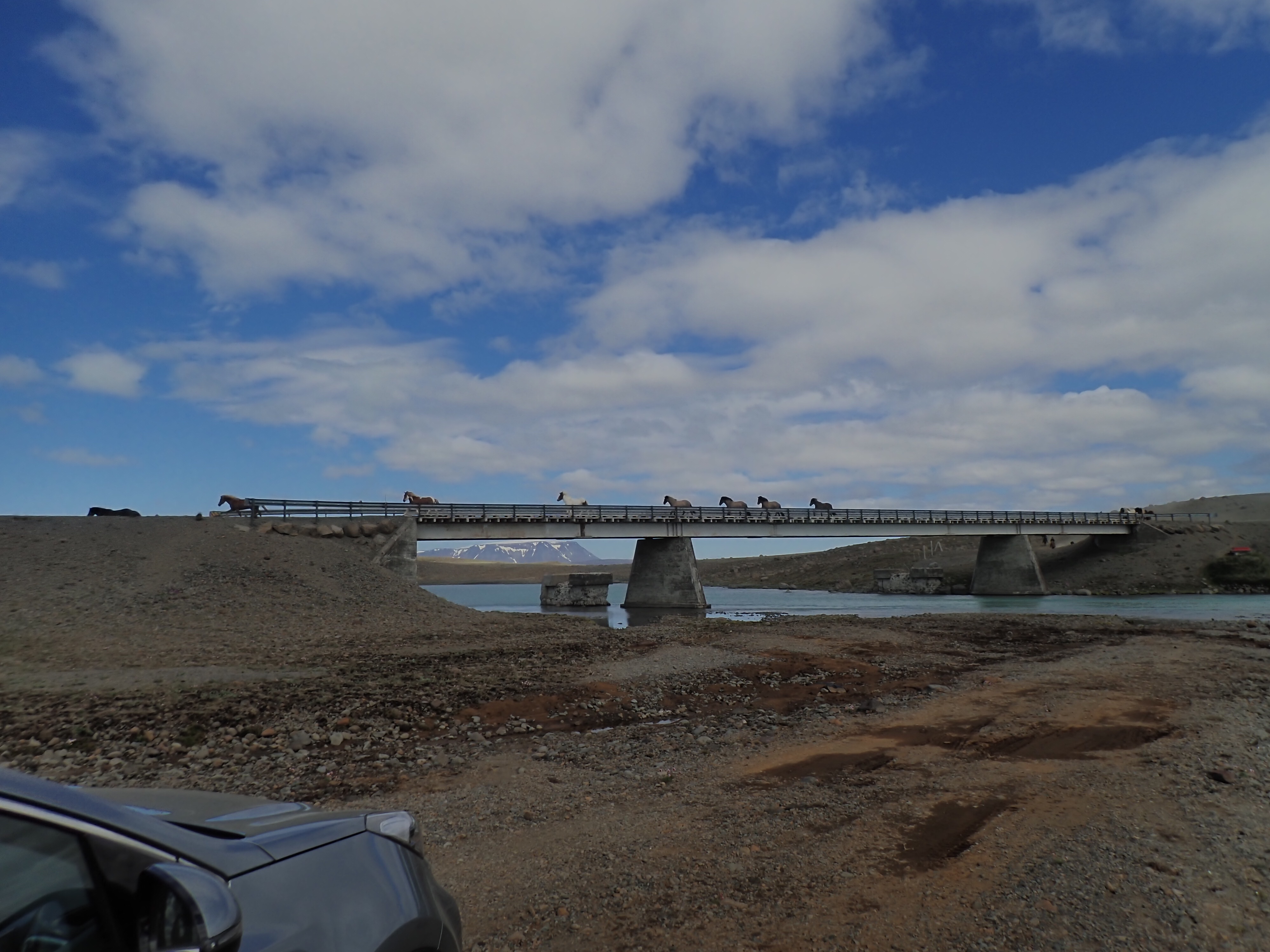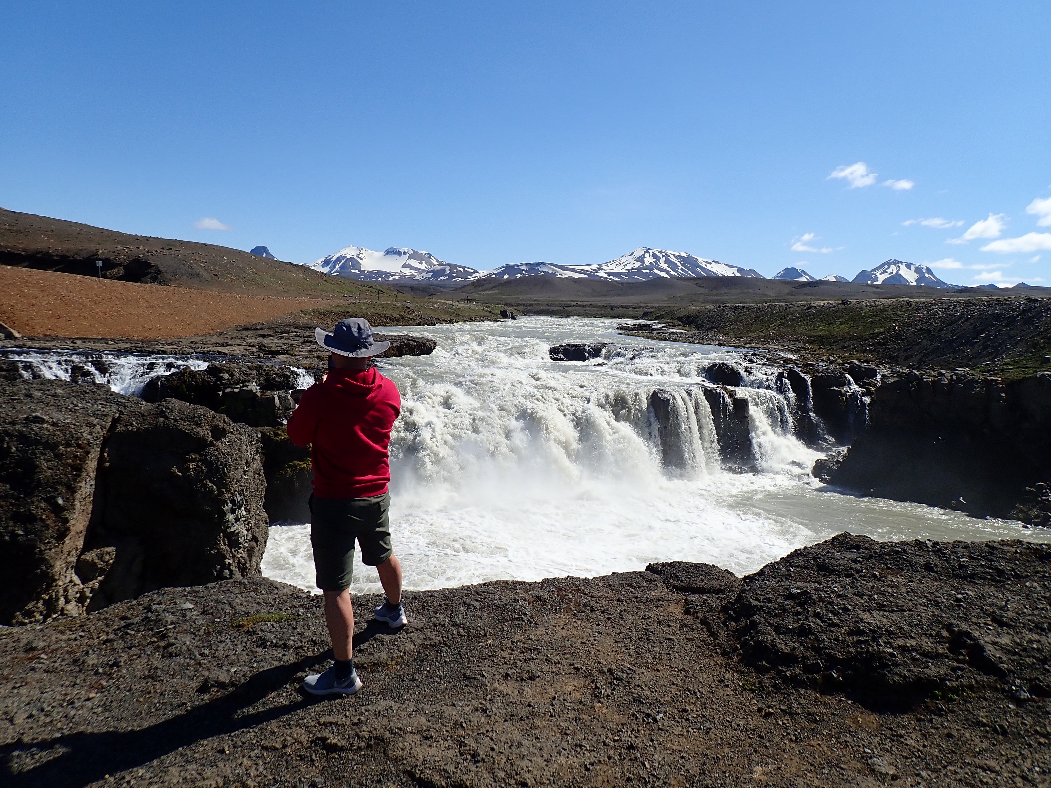 Our next stop was a 2 hr drive up to the Kerlingarfjoll Mountain resort, a fancy little place that also had camping. The road up took us between the two large inland glaciers of Iceland. The land is so rocky and stark, cut through with glacier streams. We stopped for some roadside coffee when we found a clear stream and got to sort of chat with a local! He was an older sheep farmer who was out hunting foxes. He had either killed 60 so far, or the foxes had killed 60 of his sheep, it was really hard to understand! I love listening to the Icelandic language and I feel bad butchering the pronunciation of places so bad! As we were finishing up our coffee we saw a herd of horses being driven across the bridge. I said after our last visit that I really wished we’d done a horse tour, and yet we didn’t plan one for this trip either! Guess I’ll just have to come back!
