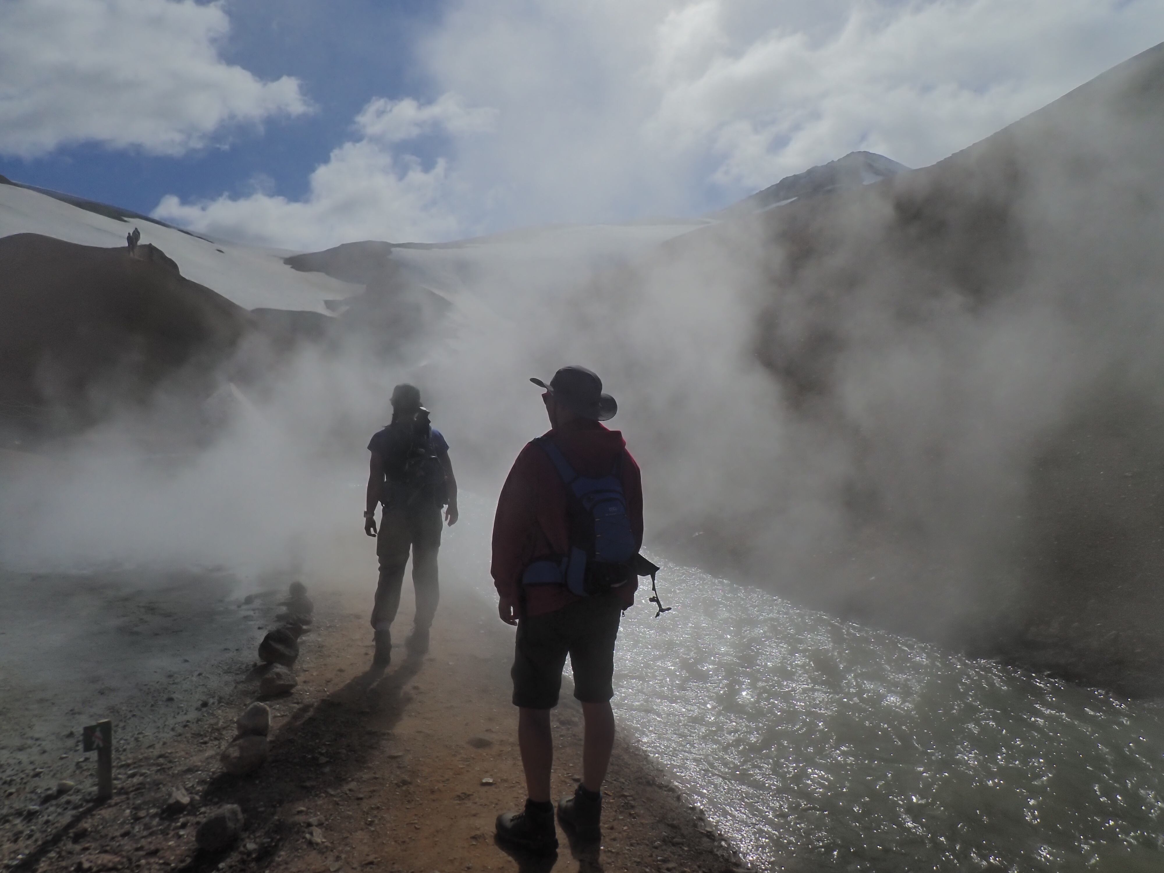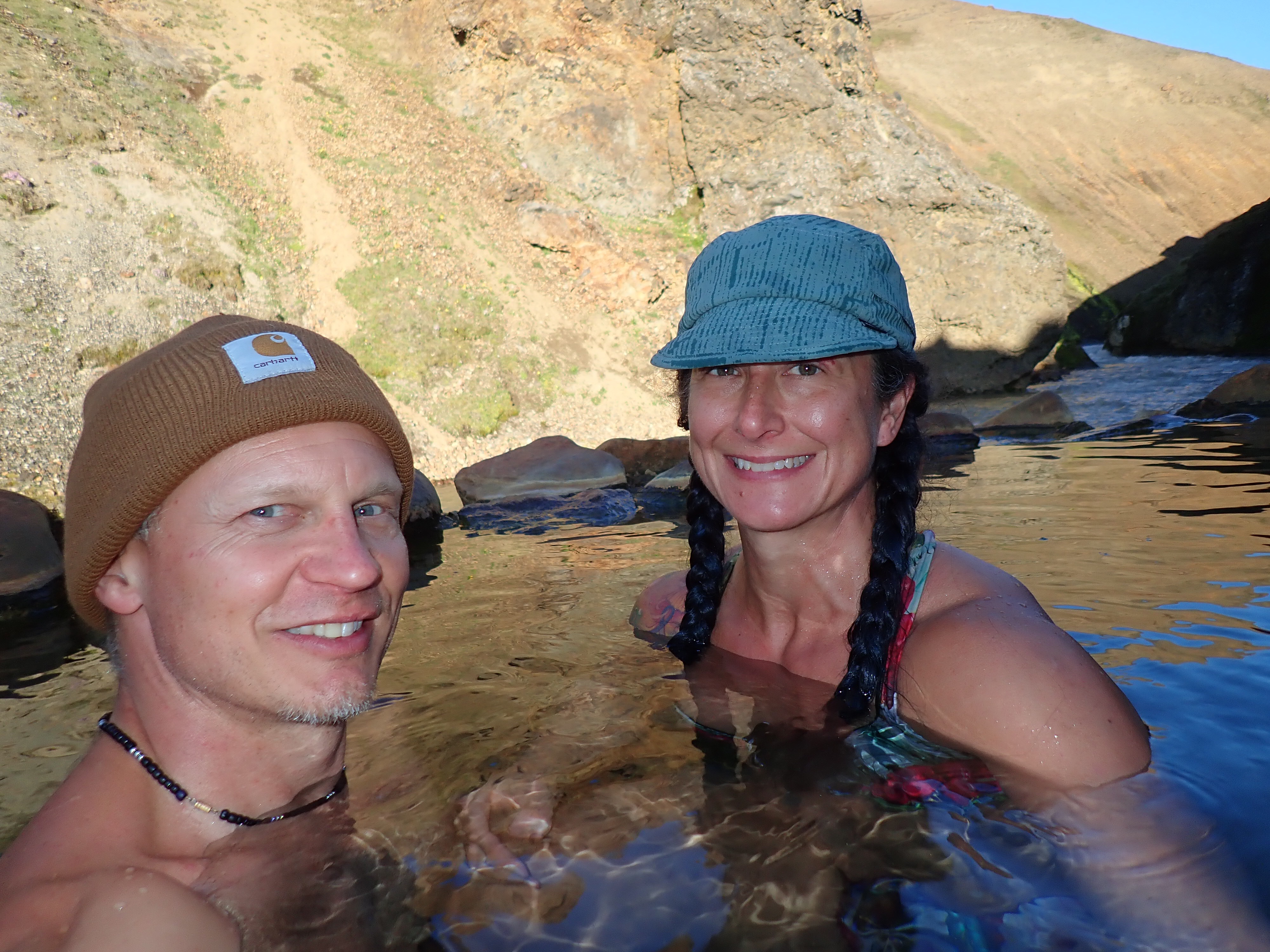 After figuring out the hot spring we wanted to sit in was off of the trail back at the campsite, Tserka decided to hike the 4 km back to camp while we picked up the car and drove back. The hot spring was a short 0.6 mile hike down along the river. Steve was concerned that it was very small but we were happy to find that is was larger than expected and not super crowded. It was a little cooler temp wise than I’d hoped for but still, wild hot water just can’t be beat!