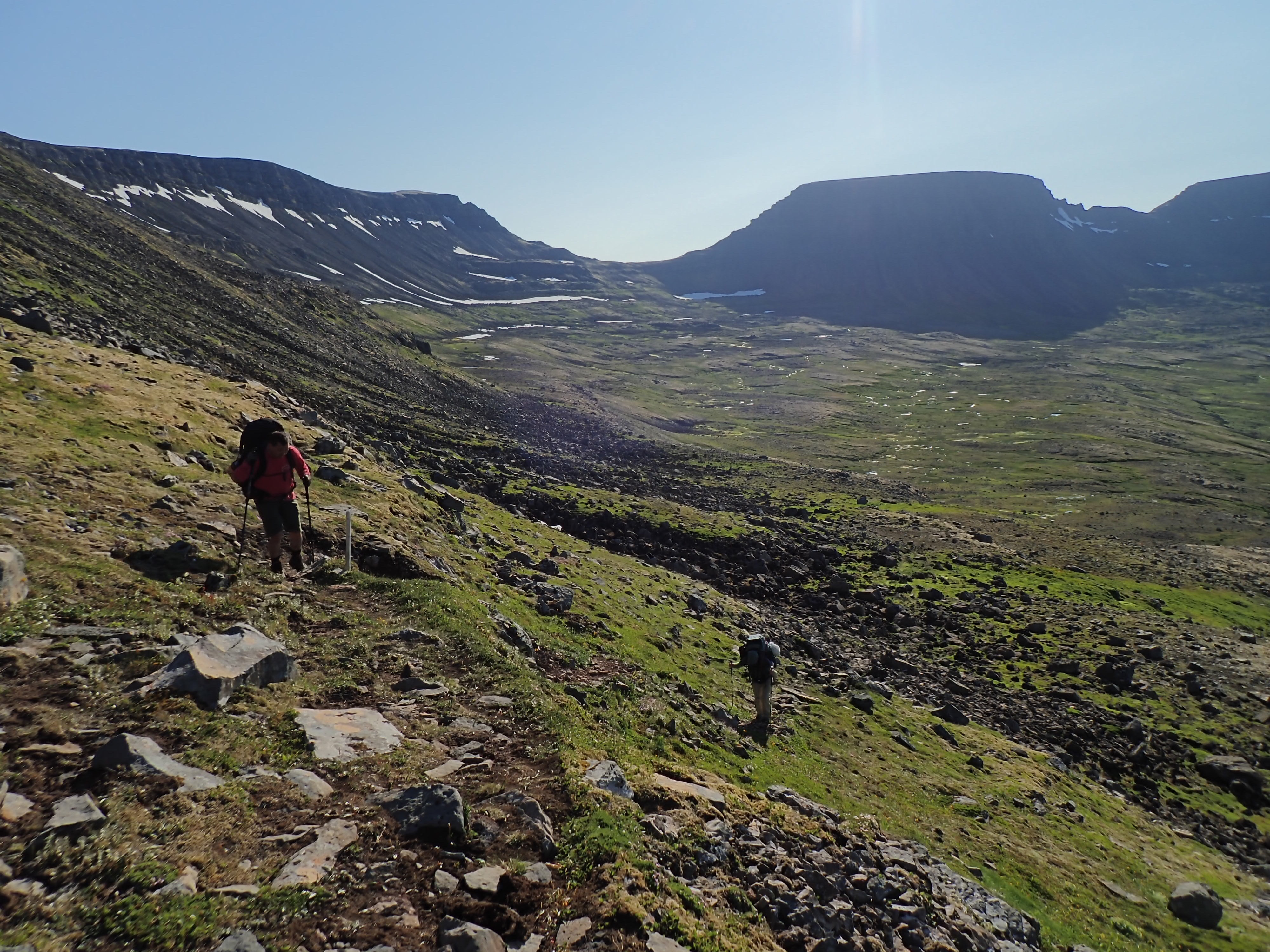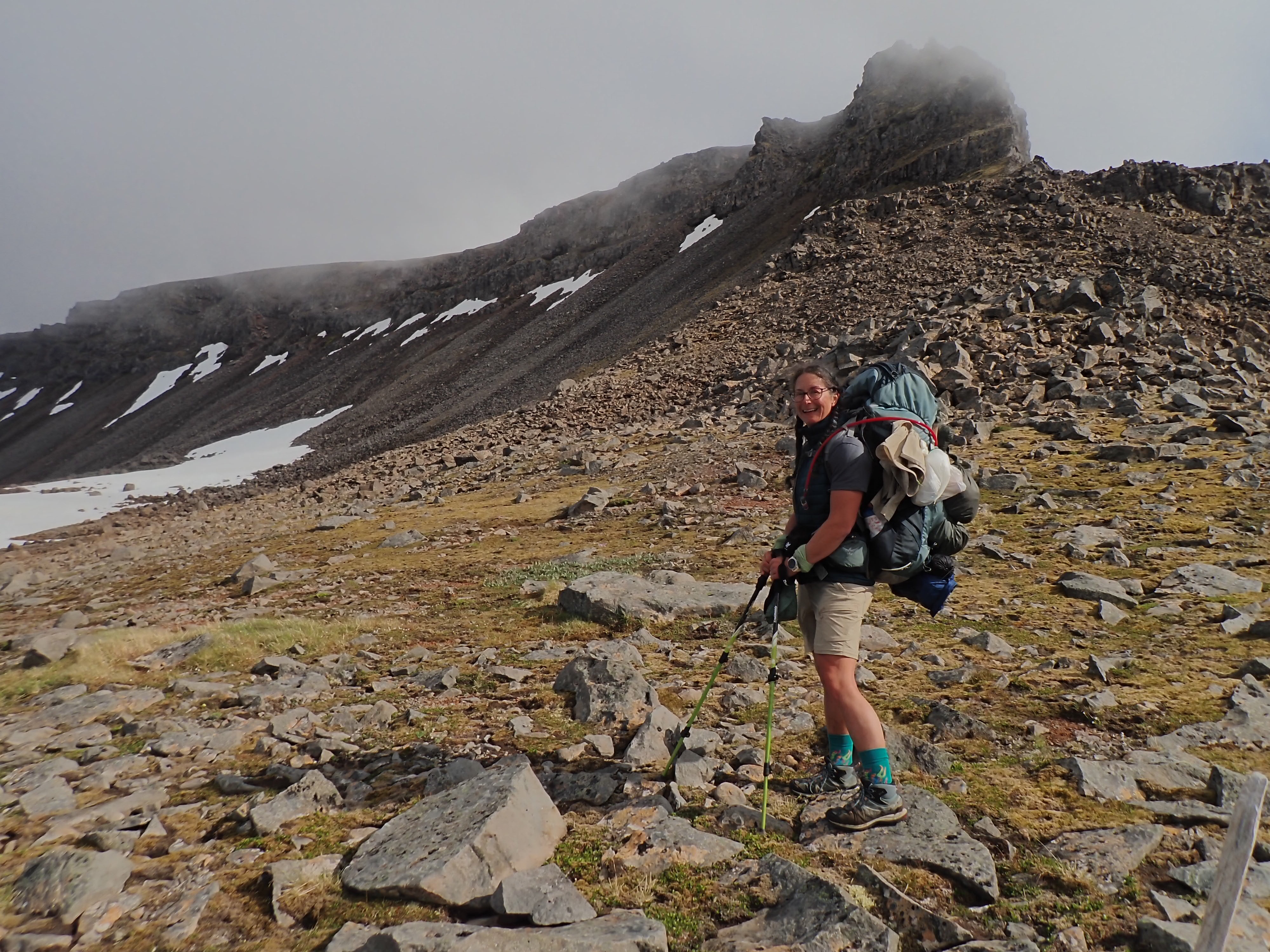 We made our own way up to the ridge line and eventually found some markers. They seemed to be leading us up to a dang near impassable ridge. Sure enough, that was what we had to do, up and over! Up is always easier for me, I don’t mind the exertion of climbing, albeit is slowly. We gained the top and the wind and the view was enough to knock us off our feet! As with the theme of this trip, going up means coming back down. Part way down we had our late afternoon ramen snack. A fox smelled the food and came around for a look. I thought we’d see more of them but the campsites so far have been in areas where summer houses are. After snack time we continued down and around the bowl, occasionally getting blown over by the wind gusts.