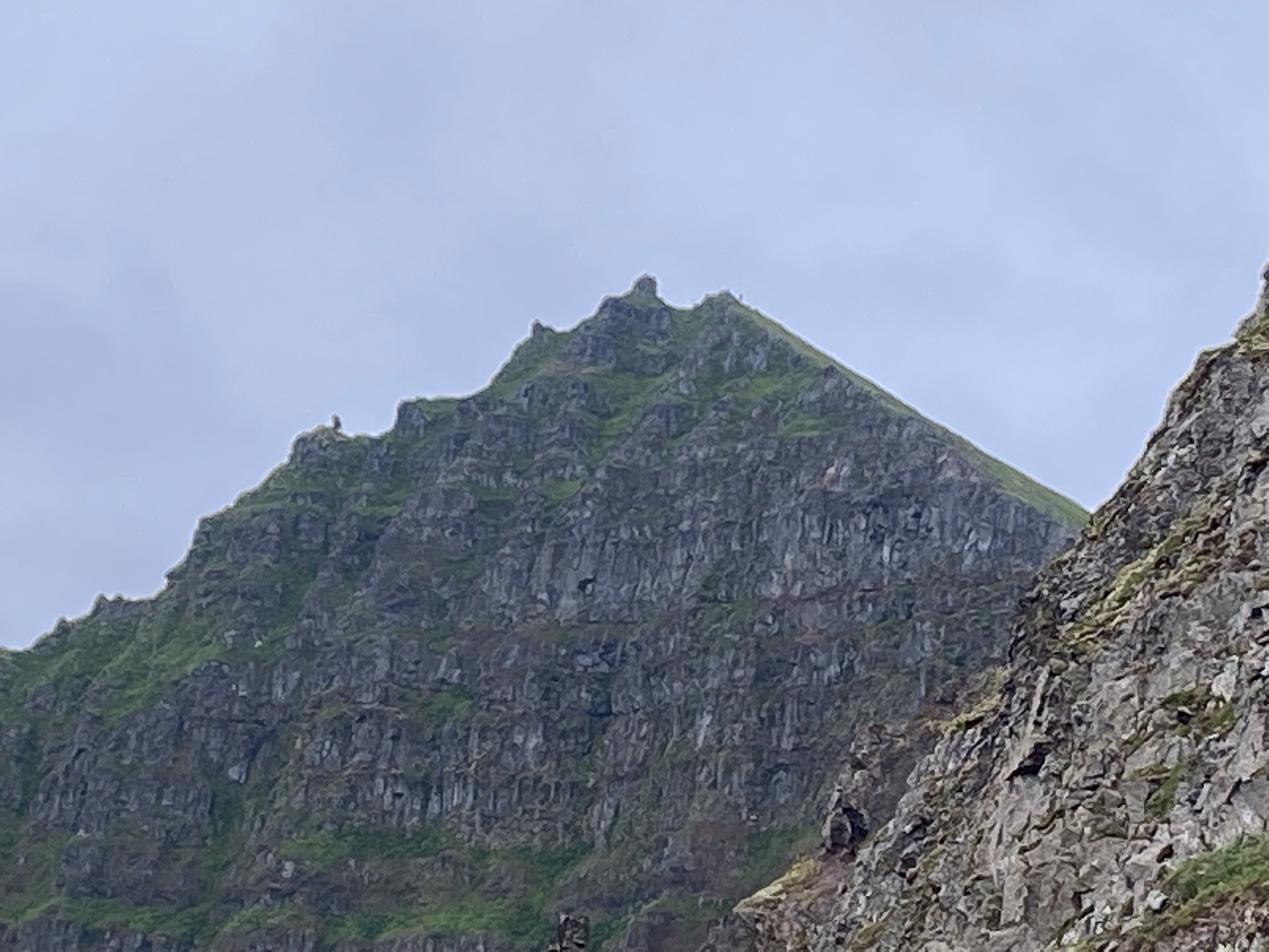 The guys decided to summit Kálfātindar, the highest point on the cliffs. Steve and I made it up part way last time but then lost the route in the clouds. I opted out of this adventure since today was challenge by choice and not challenge by necessity. They made it up and back with about 20 mins of pictures at the top, in around an hour and fifteen minutes. I did manage to snag a picture of them at the top by chance!