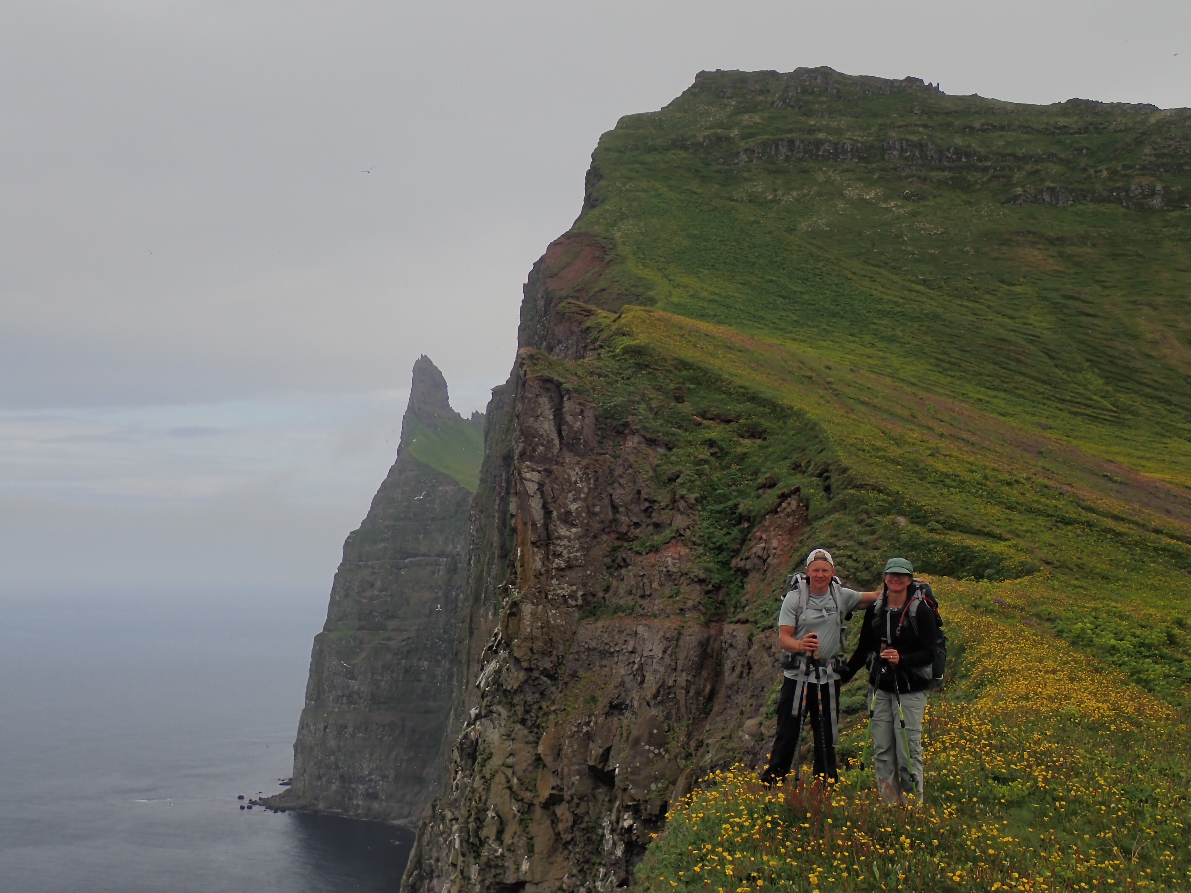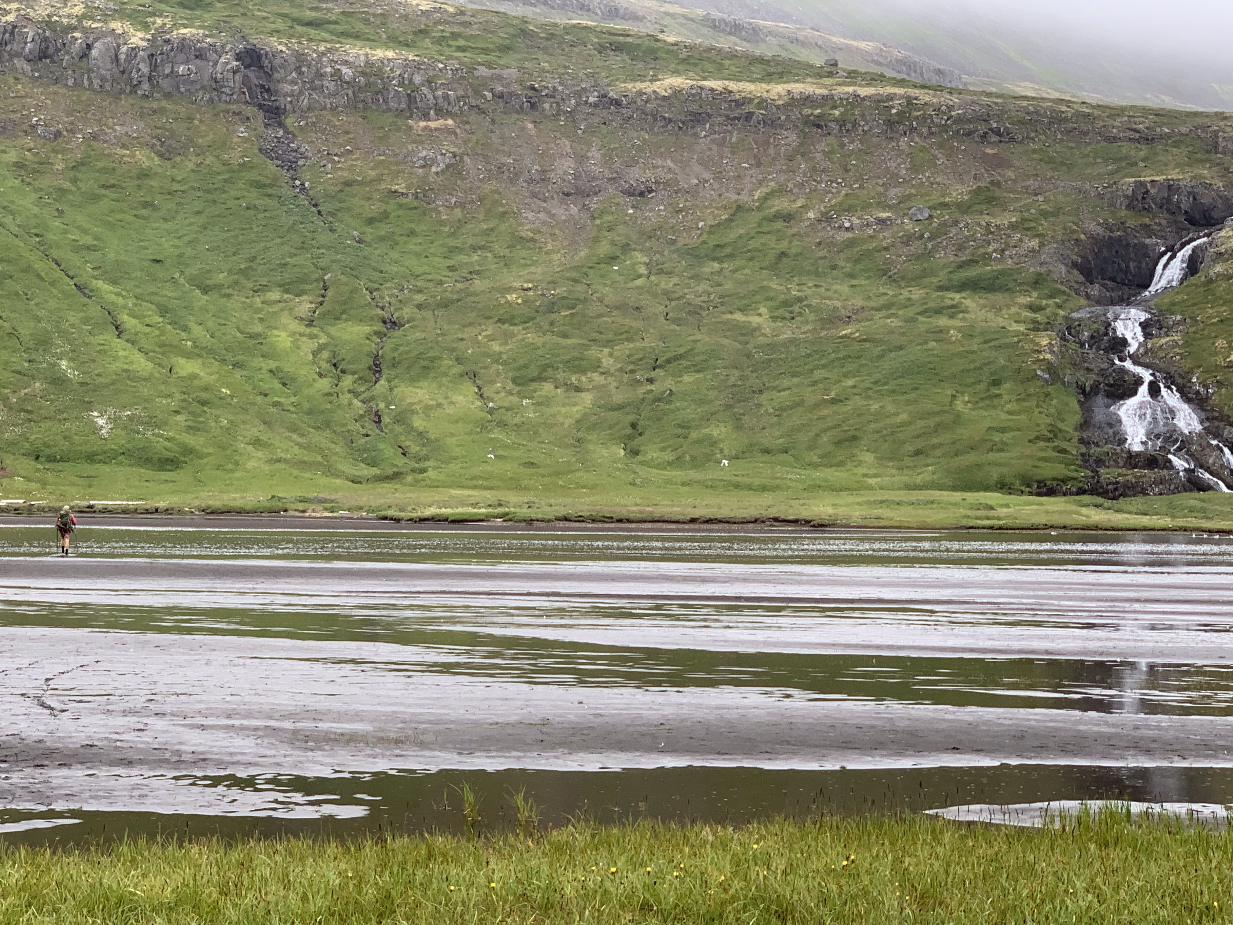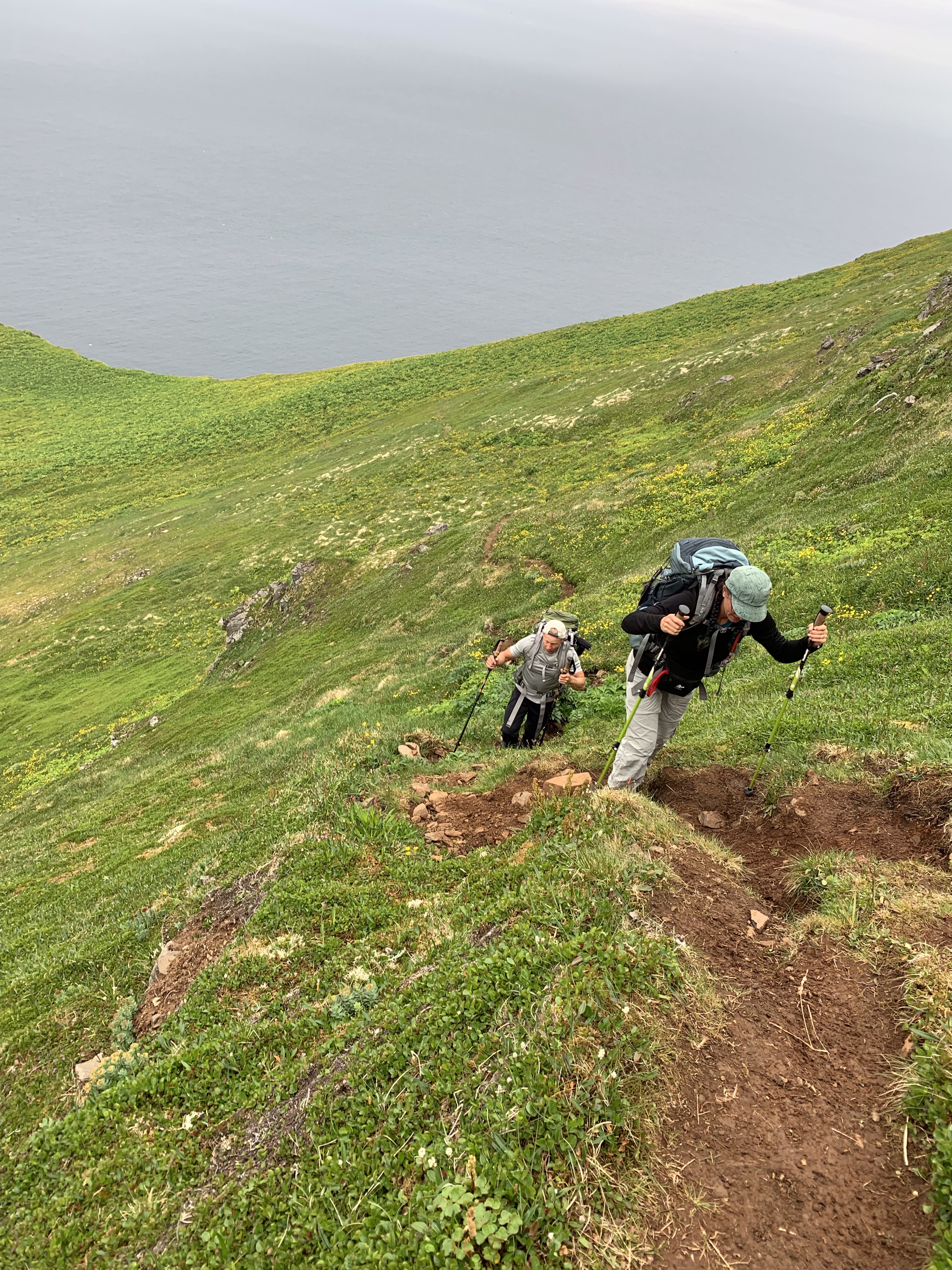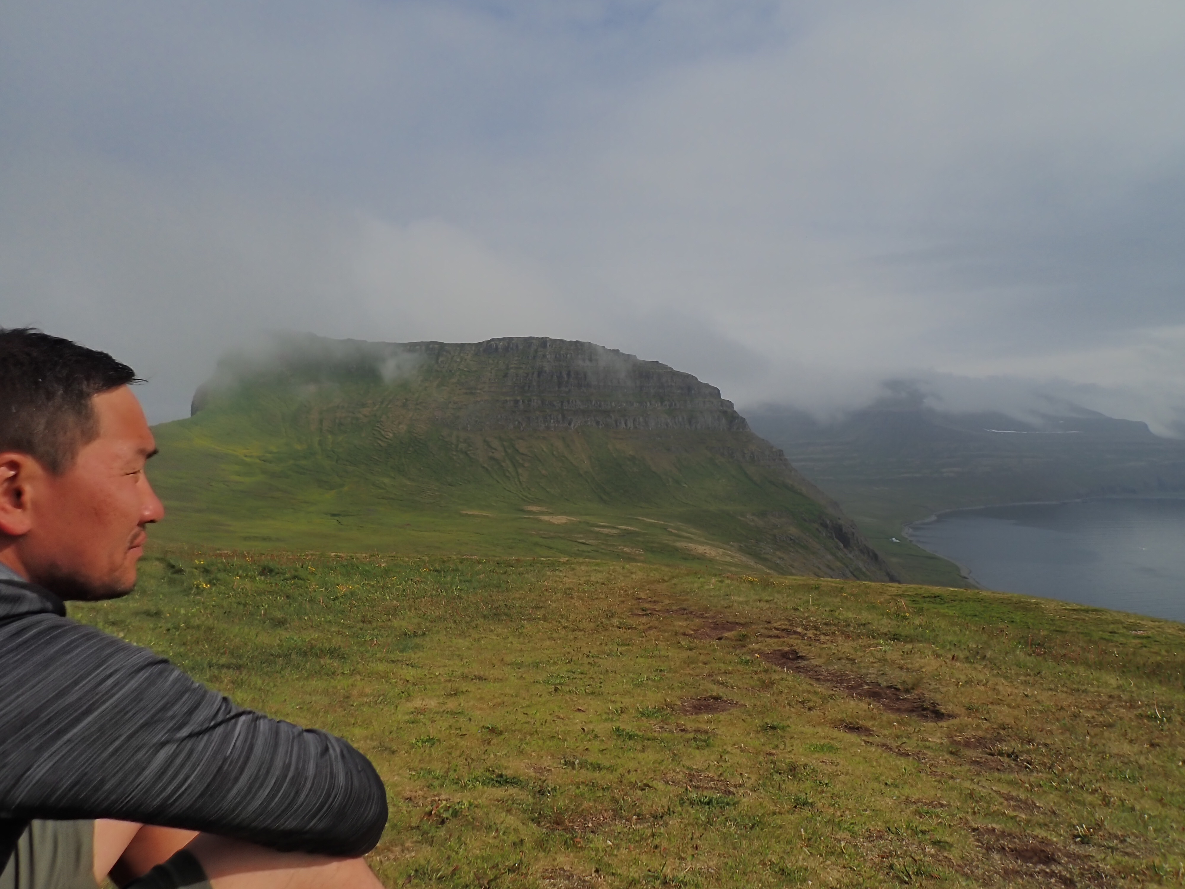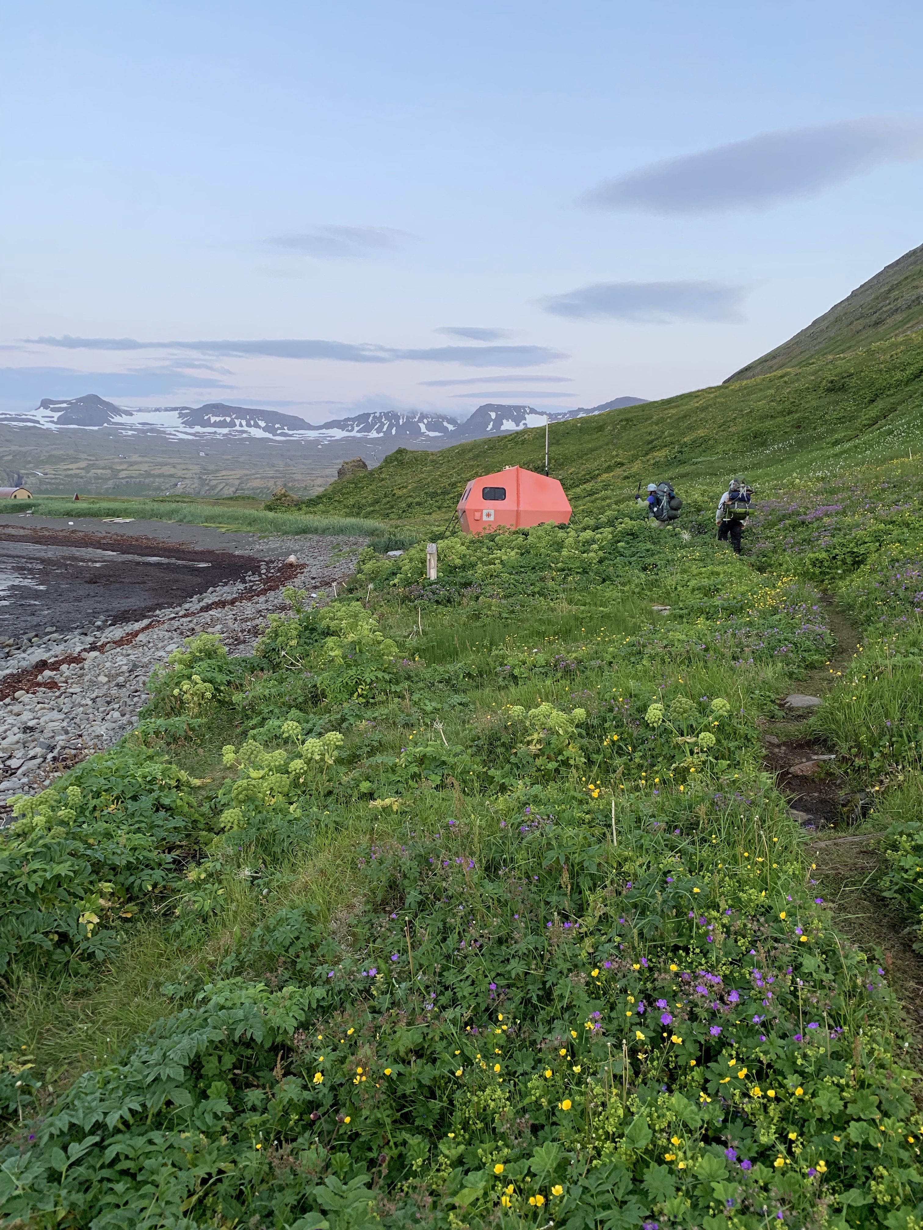 We woke up to overcast skies but no rain. This campsite is the largest and most crowded on the entire Hornstrandir. The ranger came over to get our info, no charge for camping (yet) but they want to know where home is and where you hiked in from. We commented on how the chain and ladder caught us by surprise the first day and he said oh, yeah we’ve removed that trail from our maps … well, we found it on ours!