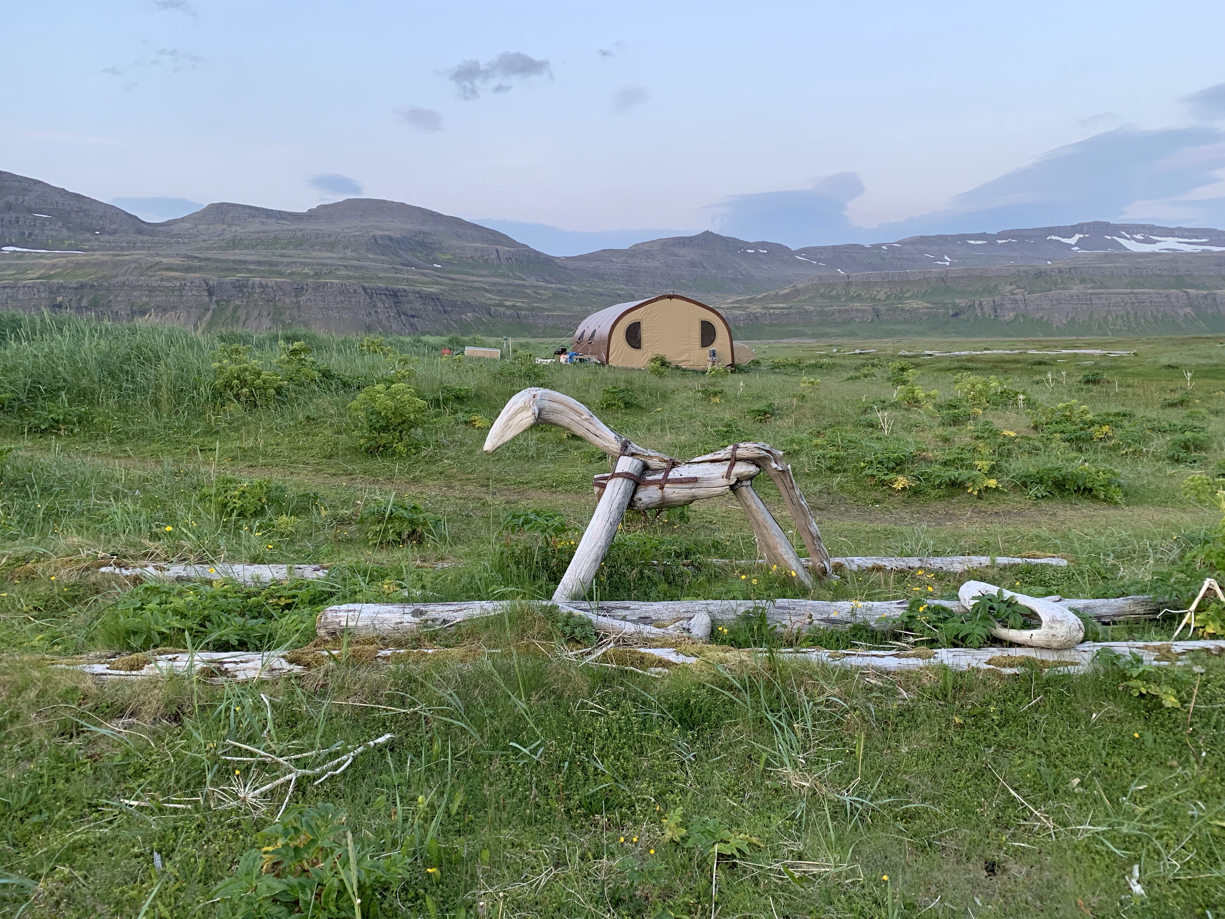 Driftwood art and Borea Adventures tent