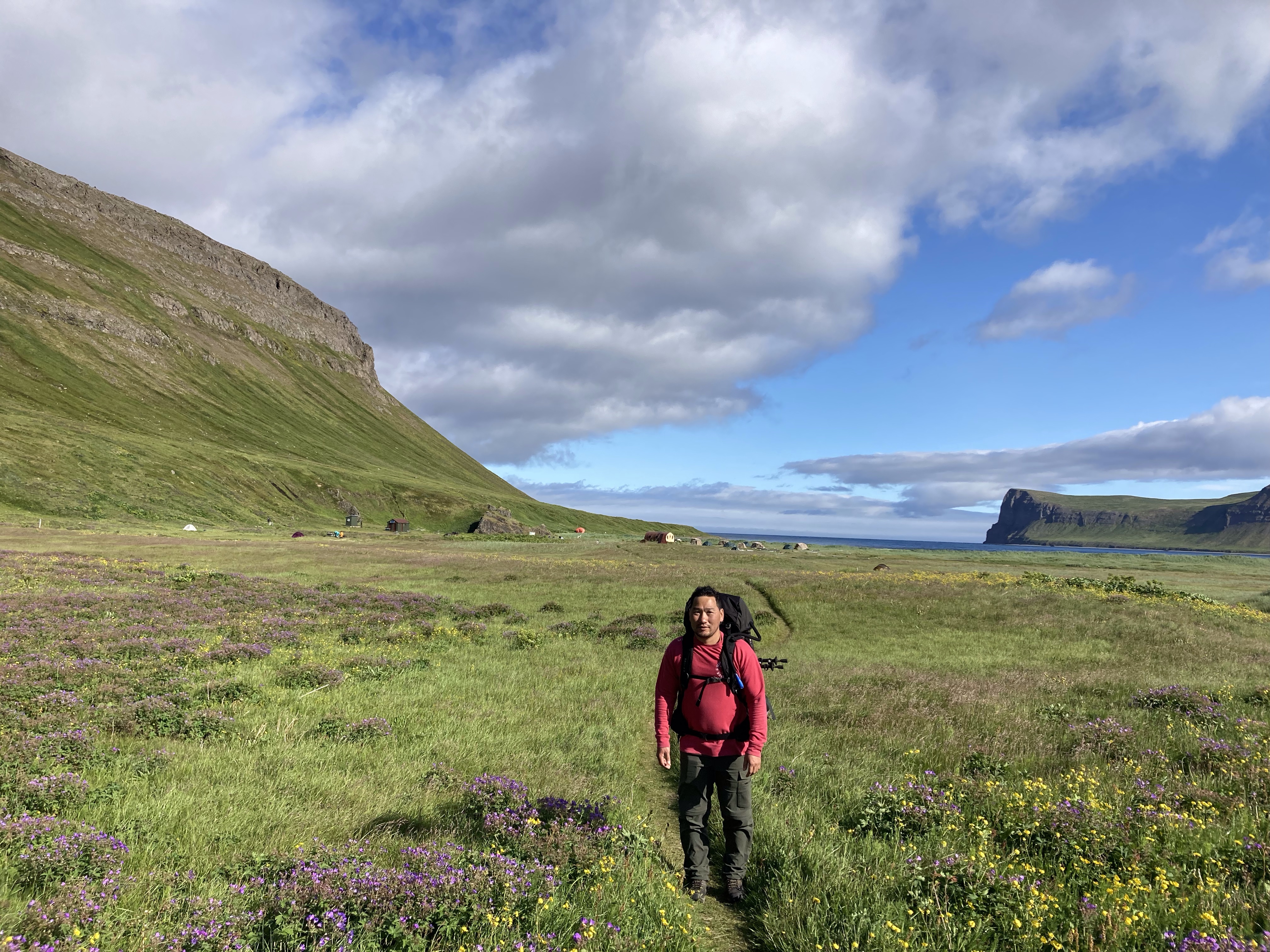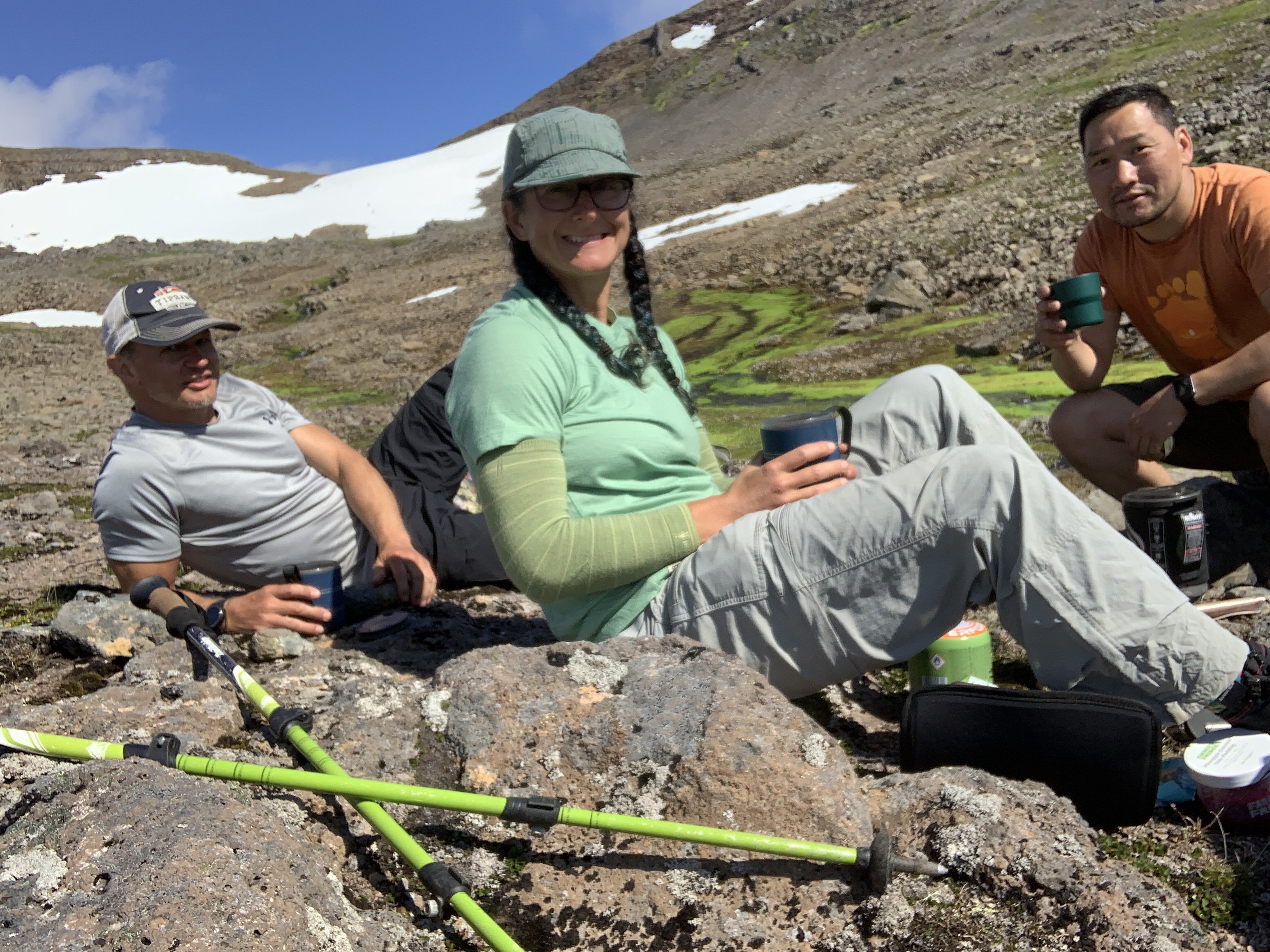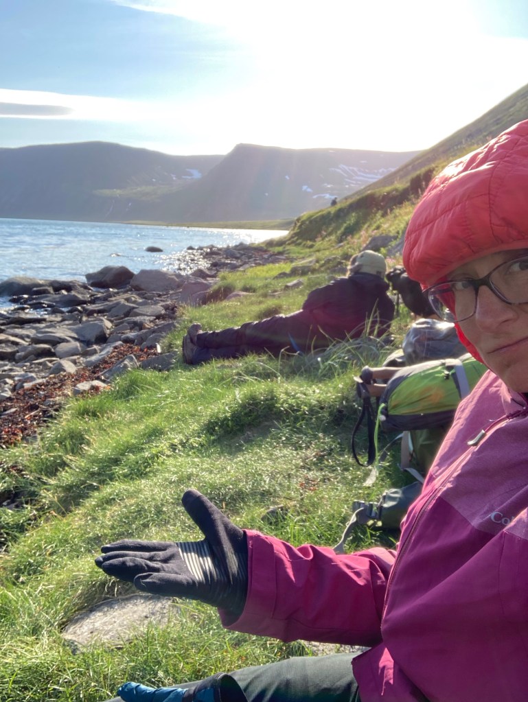 We decided that after 5 hours, he just wasn’t coming. Tserka had managed to hike partway up the mountain and activate his international cell service but the signal was super weak. The wind had really picked up as the evening wore on. I was freezing at this point, so we put up the tents. Steve managed to get a call to our guy and what we heard was that the winds were too high to make it in his boat. Well crap. We decided to go to bed with no dinner since we each had one package of ramen or rice left and we didn’t know how long we’d be stuck. That night sleep was pretty much nonexistent. The wind whipped wildly through the valley and we’d not secured the tent very well. Plus we were on a downhill slope, so I’d slide to the bottom of the tent, then inch my way back up. Morning came and we scrounged a mini cliff bar for each of us for breakfast. The bigger issue was no coffee! I did have a dirty chai tea latte pack for each of us though, so that was something! I hiked up to the magic cell service point and texted our captain. We heard nothing from him then, and now almost a week later, still nothing. I got a call to go through to Borea Adventures and asked if they were coming to this location today. They said yes and that they’d heard we were stranded, and they had room for us on board! Yay! We celebrated by cooking our final meal and then watching for the ferry again.