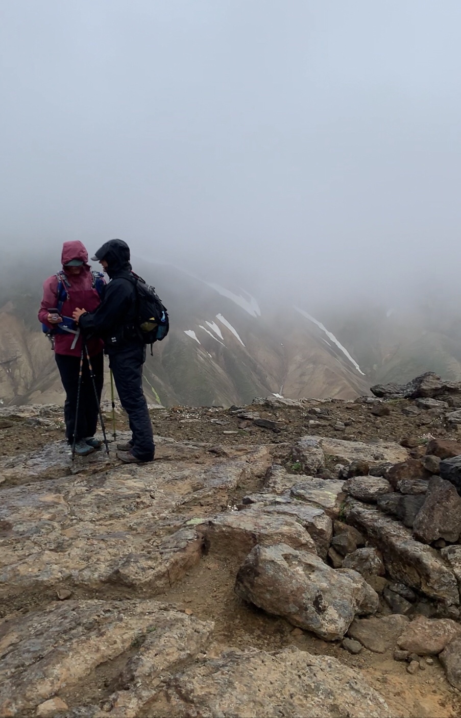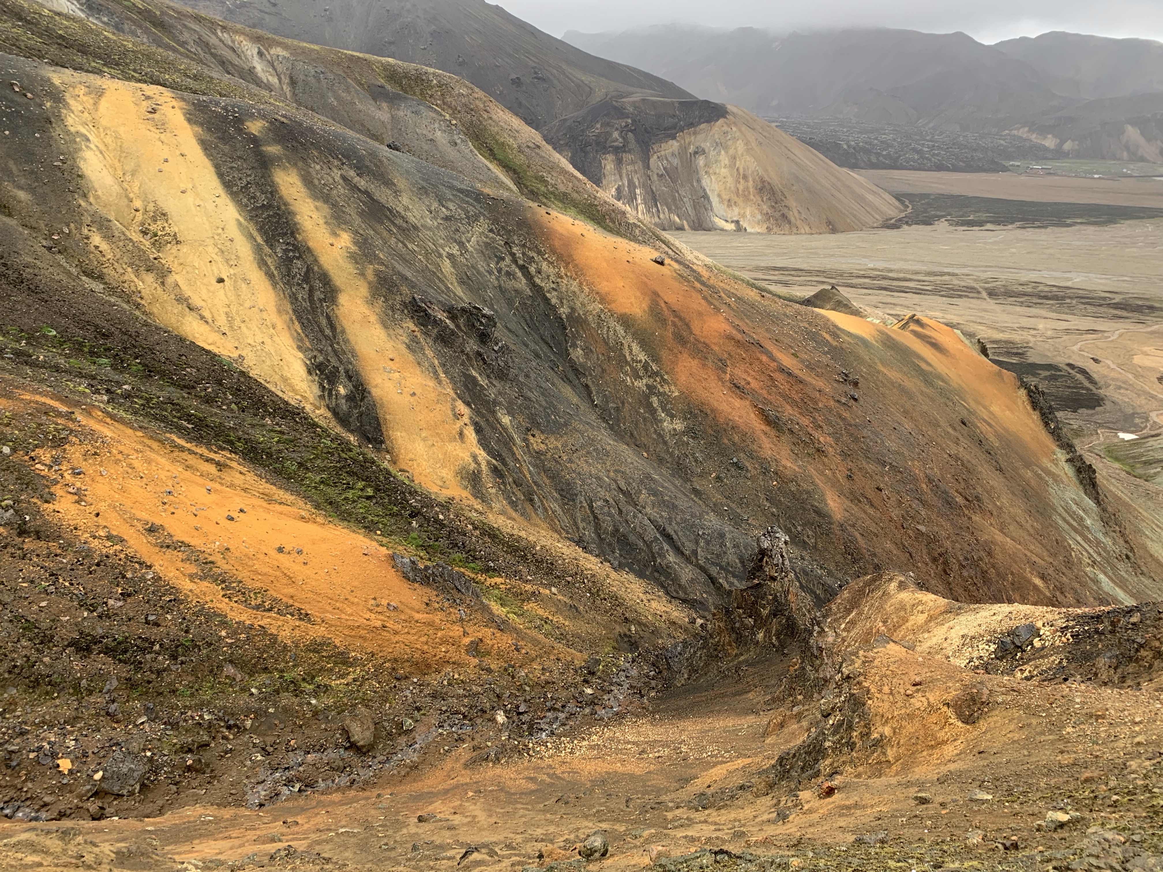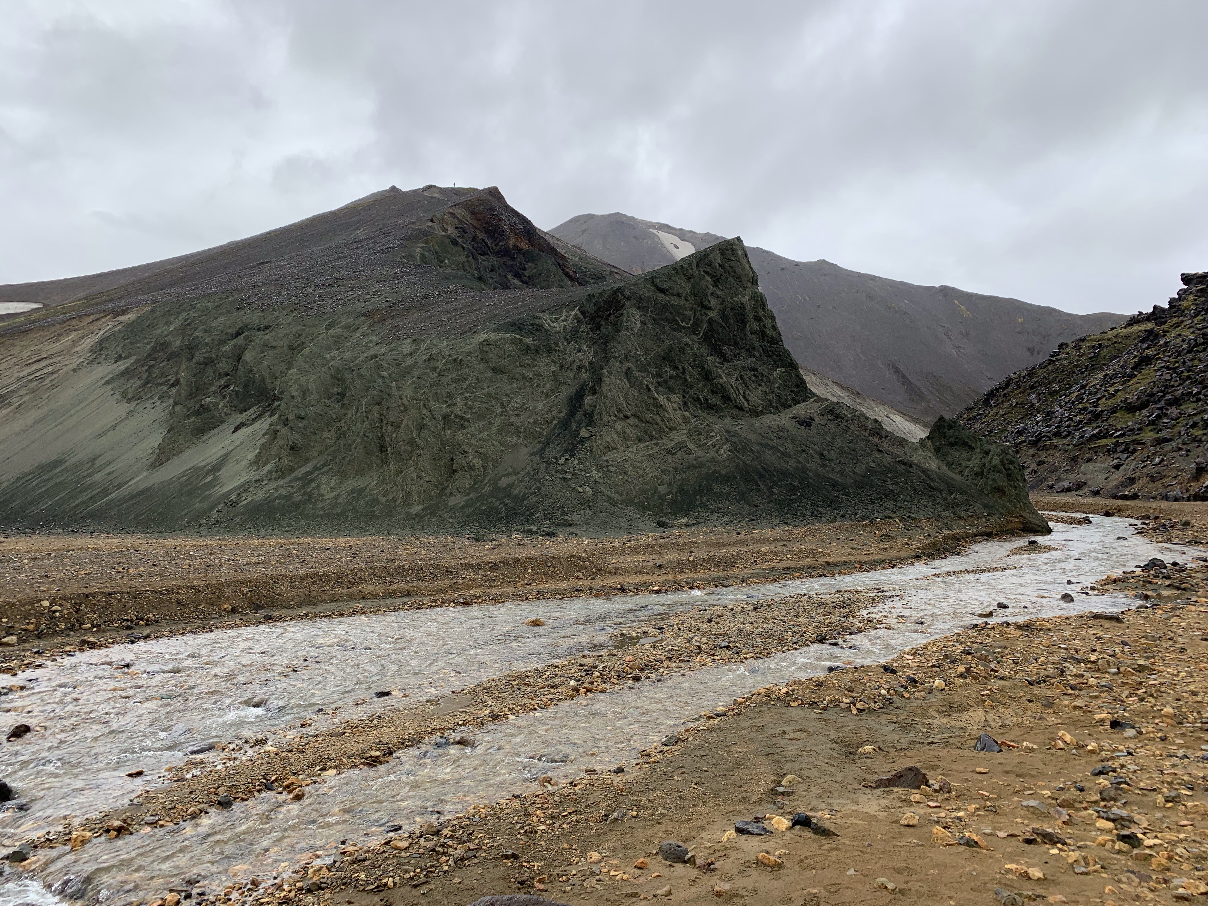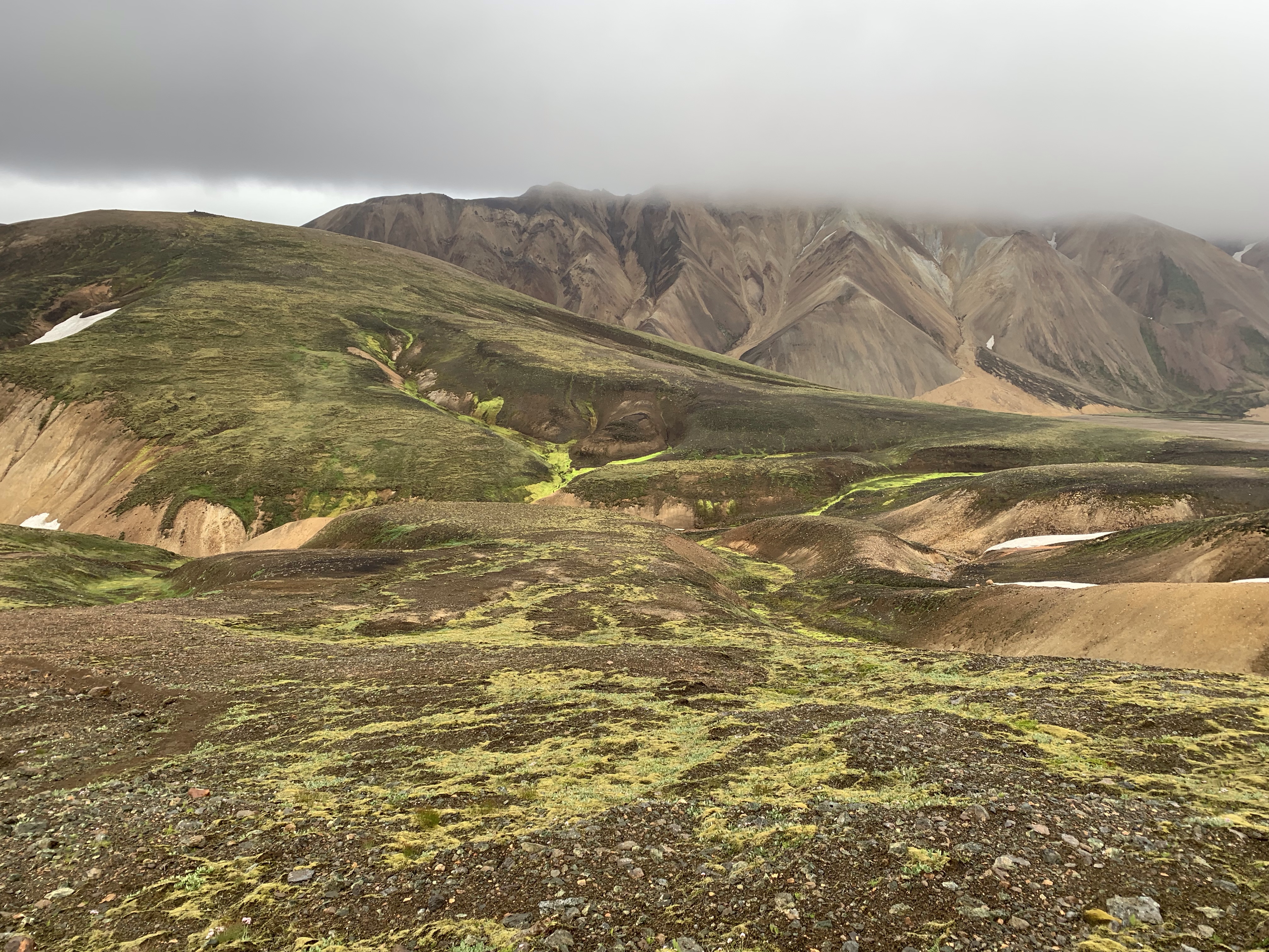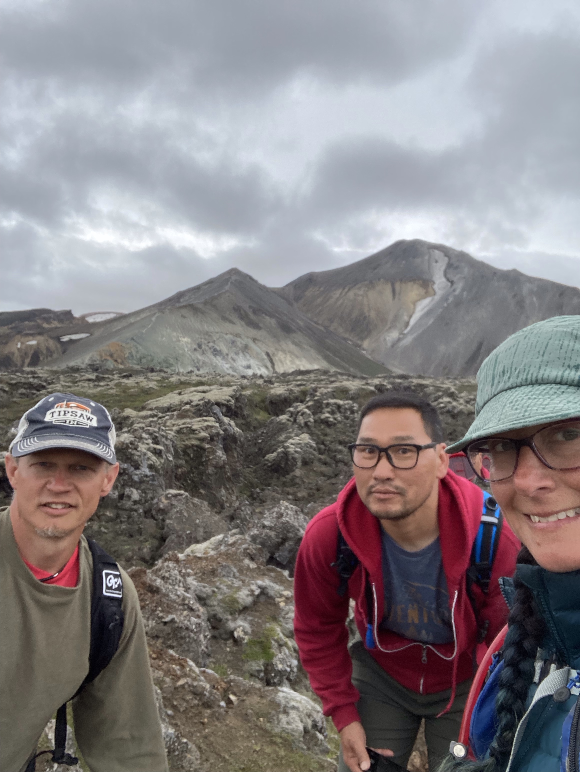 The five hours of sleep at the b&b was glorious! This is a hidden gem of a place and I really wish we had been able to take full advantage of it. We did enjoy the heck out of the breakfast toast and coffee. The day was looking to be pretty overcast and rainy but it was our only day to visit Landmannalaugar. This is one of the best known and most visited areas in Iceland, when you can get to it! The roads leading in are F roads and last time we were here, none of them were open yet. This time we had a clear shot on all of them but chose the one that was longer but did not have any water crossings. The plan was to do an 11 mile hike, about half of it sort of backcountry and not well marked. Due to the late start of the day and several false starts at finding the correct trail, we didn’t really get started hiking until about 3 pm. Given our best possible pace of 2 miles per hour that still allowed for site seeing and such, we decided to hike up to the top of the first area and see how it looked. The clouds kept moving in and once again we found ourselves hiking in a cloud. This area is know for the amazing views and varied colors of the landscape, but we just weren’t going to get lucky with the weather to see that. I think we were all feeling a bit beat up from the late drive and poor food choices we’d made since coming back to the mainland (gas station food since we missed the grocery store). Rather than continuing to fall behind on our schedule and have another super late night arrival at our hostel, we cut the hike short, doing only 5.25 miles. Spending that extra night and half day out due to the dang ferry really screwed up our timeline.