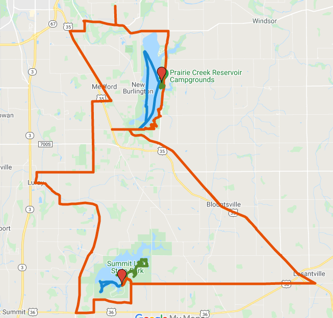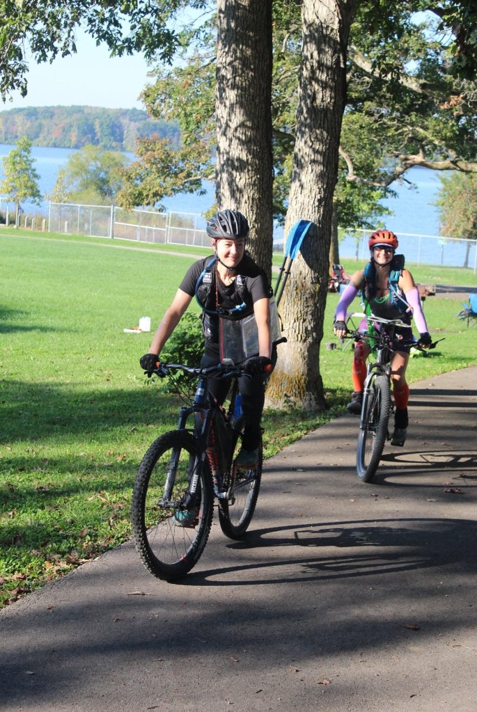 The bike leg started with a short trail section on a spaghetti bowl of trails! Karen let me do the nav for this race since I need the practice. This section didn’t have plotted points, just highlighted sections on a supplemental map so we could ride the trails and find the points. I actually really love this method for including points in a trail bike section! It allows the races to enjoy the flow of the trails and still pick up points. Bike nav for me means I have to slow waaaay down when we have to watch topography super close. I did mess up one intersection because I was confused on trail color but after that it was pretty quick work! We jumped onto the road instead of staying on the trail and that might have cost us some time since I missed the Greenway intersection… well, we rode right under it but I didn’t put it together until we were at the next road junction! Back to the Greenway and then up and out for a smooth sailing section. The rail to trail program up here is really nice! We went straight to Losantville and then headed due west to Summit Lake Reservoir. At the park we had to jump into the foot section since all of the boats were in use at the time.