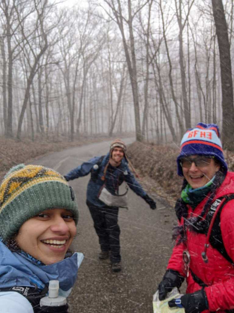 For my 47th birthday I wanted to do the 24 hr version but I didn’t want to go solo for that long. I wasn’t able to convince anyone else that it would be super fun so I had to be happy with a 12 hr race! I was joined by Zac and Shubhangi, Zac having done a couple of races and Shubhangi doing her first. The weather dawned cold and trended colder for the morning. This was the third race I’d done in the last month where the week before had wonderful weather but the day of the race was much colder! The maps were pre-plotted with 64 CP’s! Knowing there was no way we’d even come close to clearing the course, we planned a rough circular route that stuck to the northern CP’s. We also didn’t realize that a rogaine race is scored differently and that the CP number was the amount of points earned. So, had we realized this during the planning phase, we might have made a different route choice! We headed out from the boyscout camp just as a short lived snow squall rolled in.