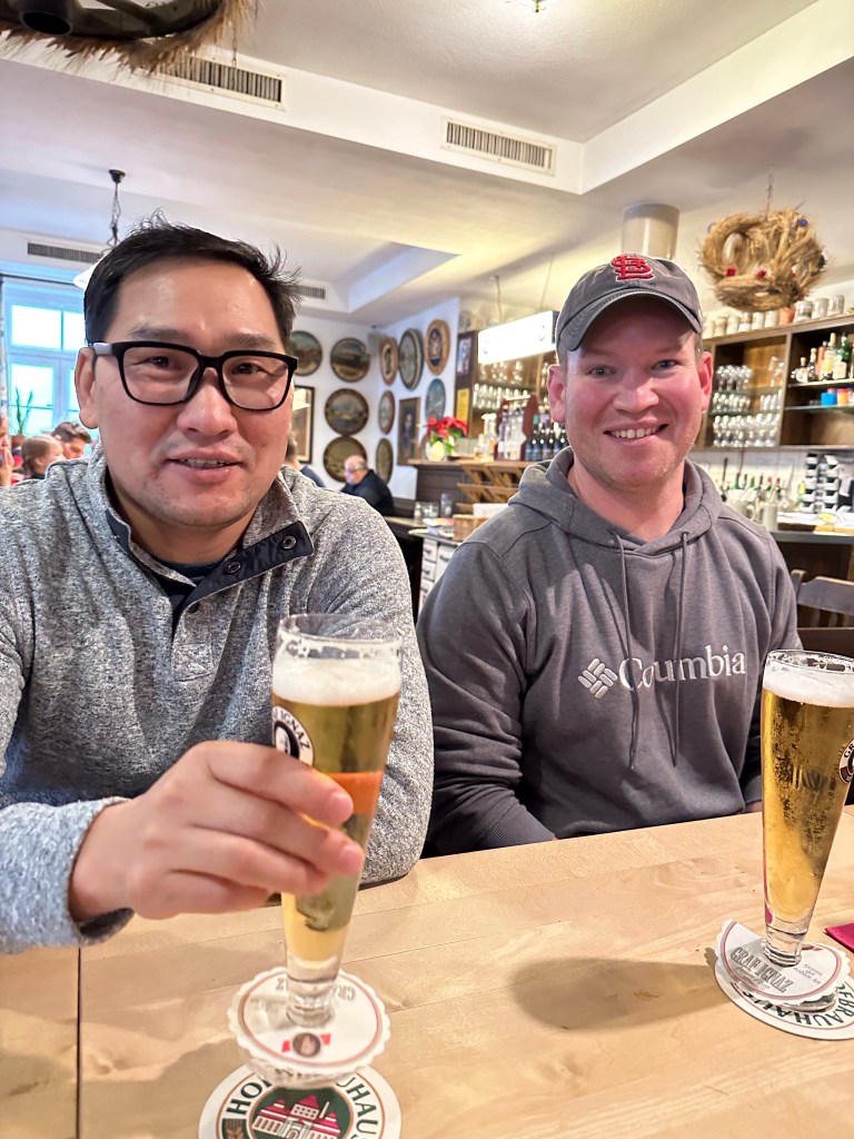 Let me set the stage for the continued sh@t show that ensued once we landed. Since our original flight was into Munich but this one was into Frankfort with a Lufthansa connecting flight to Munich. We landed 20 mins early and had a 2 hr layover. I had gate checked my carryon since the flight was full and asked if I had to pick it up and if so where. One person told me yes, you must pick up all baggage and go through customs. So we headed to baggage claim. We waited until all bags were unloaded and nope, none of ours were there. Crap. Now things were getting tight to clear security and get to our gate for Munich. We asked another person, what do we do since our bags aren’t here. She said, no, the bags are checked through to Munich. Ok, race to security and find an epic line! Tserka had stayed behind to make sure the bags didn’t show up and we really feared he wouldn’t make it! At the gate, I ask a 3rd person to clarify that our bags were going to Munich. I showed him a bag ticket and he said, yep, all bags are good to go. Phew! We make a back up plan in case Tserka can’t make it (there are flights every 2 hrs to Munich), and board our plane. Tserka boards just a bit after us, I have no idea how he managed it! He is sitting more mid plane and on the right side, we are in the dead last row on the left. The pilot comes on and says we will be delayed a bit because they have to remove some bags of people who chose to not take this flight. Ok, no big deal. Tserka comes back a bit later and says he sees our bags on the tarmac. We assume it is because they offloaded everything and that they would be put back on. Well dear reader, they were NOT put back on! We arrived in Munich and again waited until all bags were unloaded and the only one that made it was my gate checked carry on. It was now around 11 am and to say we were getting cranky is an understatement. The lost baggage people of Lufthansa were very helpful but the biggest issue was no one knew which bag numbers were correct since they had been retagged in Charlotte due to the missed flight. So for 3 bags we had 6 numbers and no clue which was which. They took all of our info and also inferred it was our fault because we were supposed to show ALL of the bag tags to the gate person. It’s a little infuriating in that the reason we couldn’t get on the original flight was because our bags were NOT on the plane and this time we made the plane but our bags didn’t. Next up was the rental car counter. Josh had used his gold member (anyone want a smoke and a pancake??) status to reserve any car that was available on the lot. Since we were behind schedule he had called and told them we’d be picking it up a day late and they guy said sure, no issue. When we got to the counter the rep asks how the day was going and Steve jokingly replies “it could only get worse if you tell us that the only thing left to choose is a bicycle”. The rep visibly takes a deep breath and then tells us that we do not have a car reserved! At this point I give up and go sit down. Josh works whatever magic he can and about an hour later we leave with just our carry ones, but we at least leave the freaking airport! Given that the bags had all of our adventure gear and spare clothes, we elected to stay the night in Freising and hope that our bags showed up. We found a brew pub for lunch and a hotel just up the road. After strolling around to buy toothbrushes and toothpaste, I think I managed to stay awake until maybe 7:30 pm.