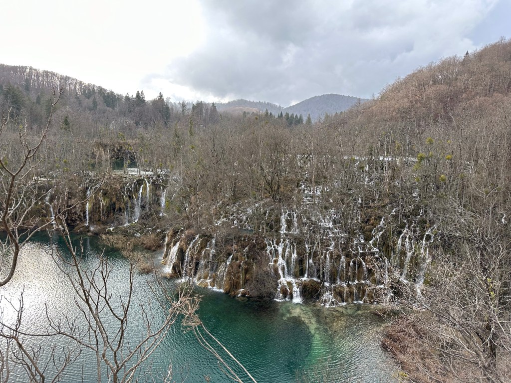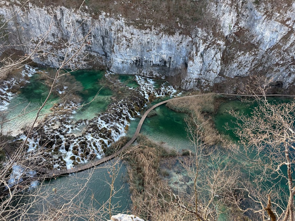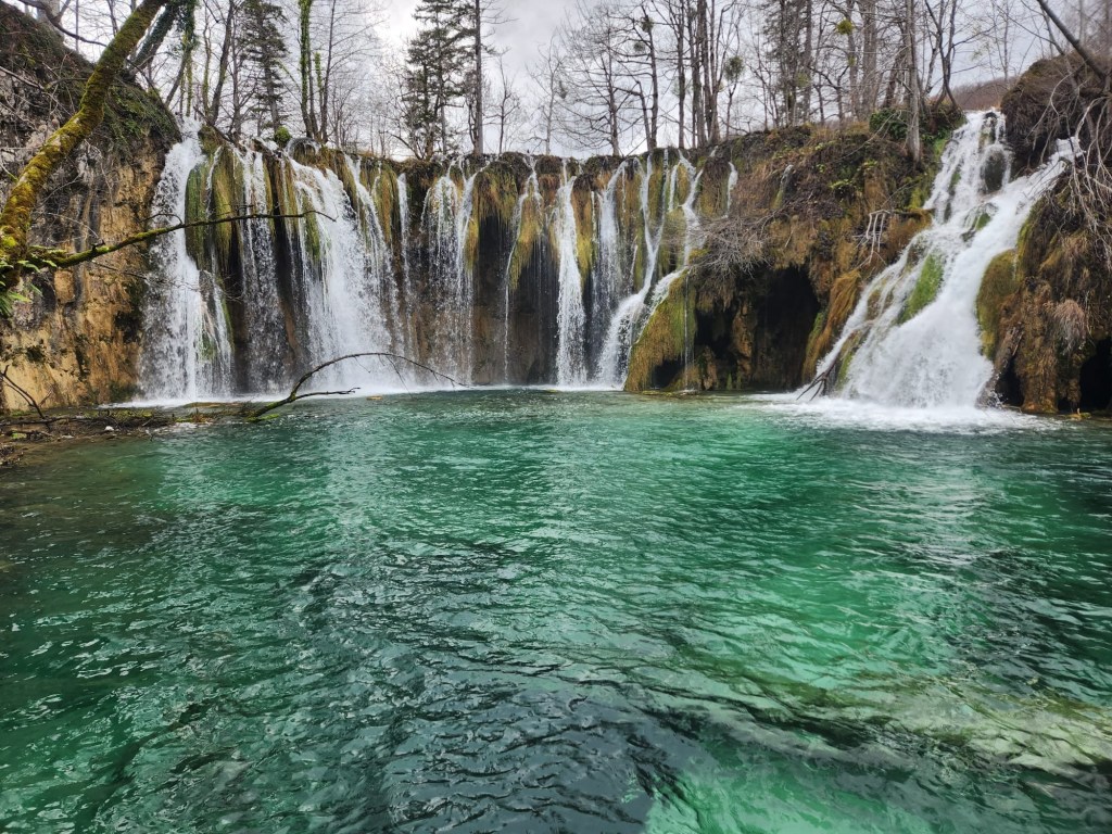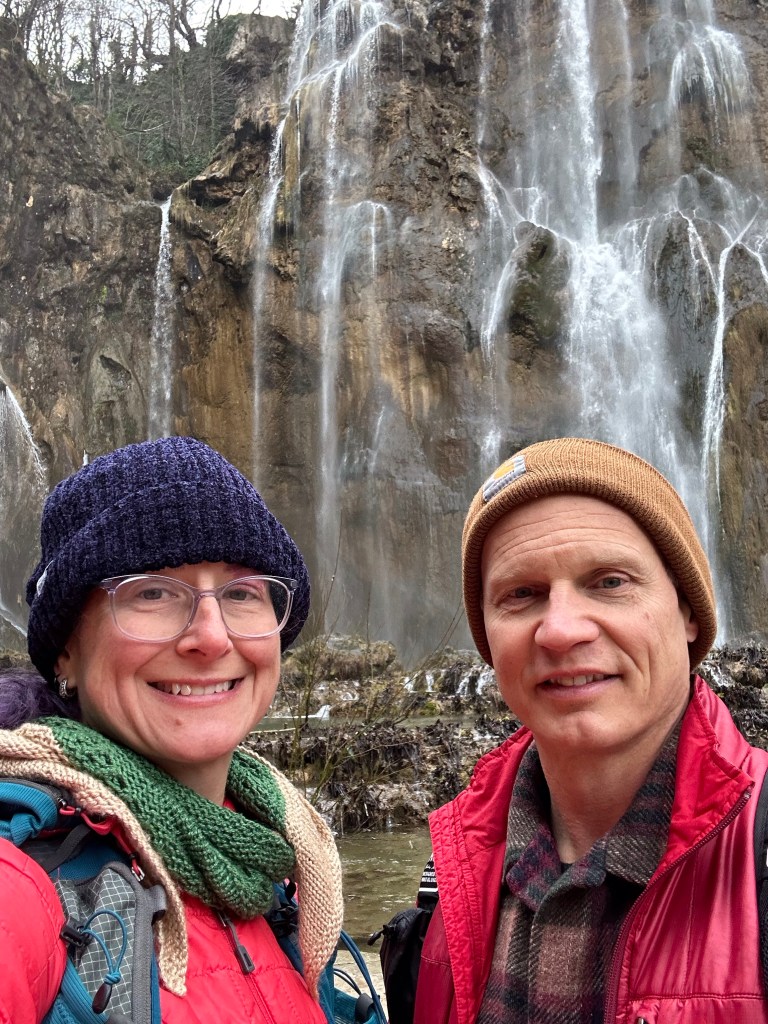 We kept to our intended wake up and leave at 4:30 am schedule but it wasn’t easy! Josh, being the non coffee drinker took the first leg of driving since there wasn’t any coffee to be had at the point! We started our 3 1/2 hour drive down to Plitvice Lakes National park. The “fast” way was a windy, snaky mountain road that I feel added an hour to our drive! Somehow leaving 3 hrs earlier than we had planned gained us absolutely nothing time wise and that was with no wait at the border! We had tickets to enter the park at 11 am and we walked to the gate at exactly 11 am. Of course on the way down, we did stop at 2 gas stations, had to add air to the tires, ate breakfast and had 2nd coffee at another station, so some time was lost. The Plitvice area is astounding! Granted the crowd can be a bit much, similar to the crowds you see at the Grand Canyon, but we were able to get ahead of some tour groups and make decent time. We planned on doing the K trail loop which was the longest but once we reached the trailhead it was closed due to flooding. We decided to take the ferry to the next trailhead and pick up there, but the tour group caught up with us and the ferry dropped us at the other pier. We then decided to take the other ferry across, it is a very short distance, swimmable even, if they would let you! After sitting on the boat waiting for a few mins, we changed the plan and then ran up the hill to the tram station. Well, the tram rolled right past us without stopping so that messed up that plan! Back down the hill to the pier, back on the short ferry boat, and finally back to hiking!