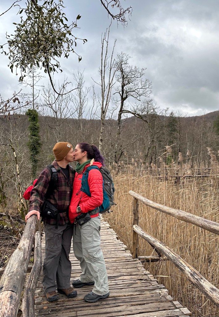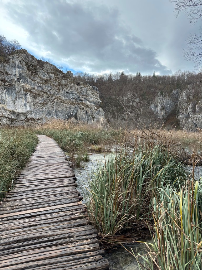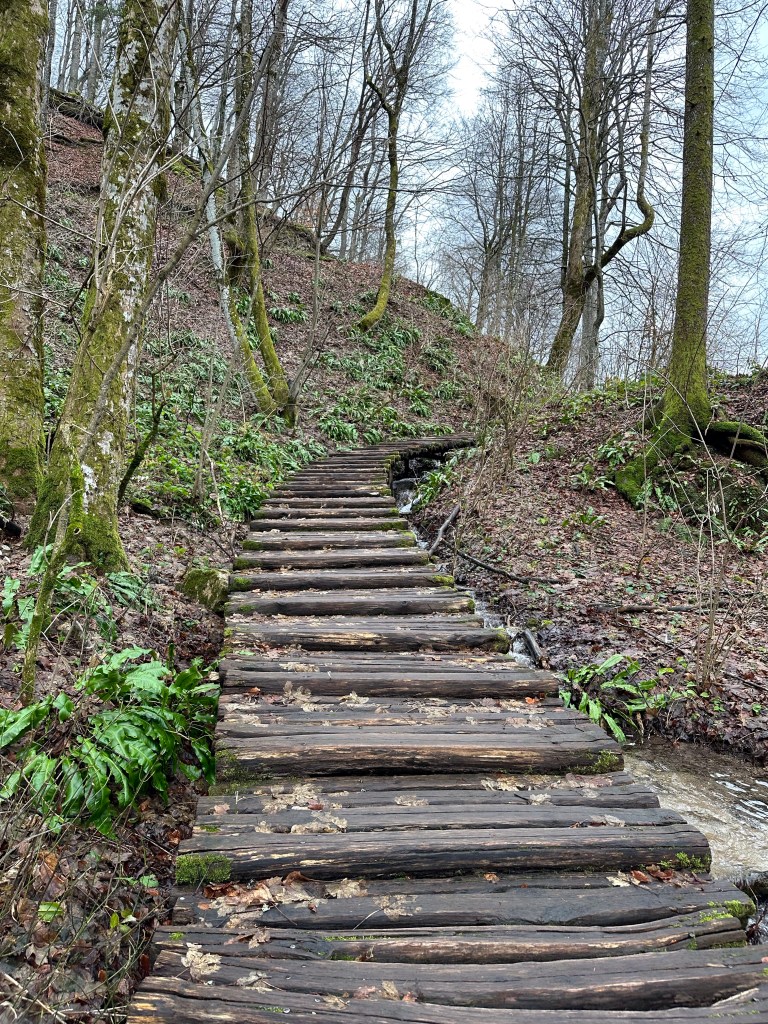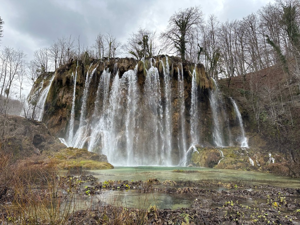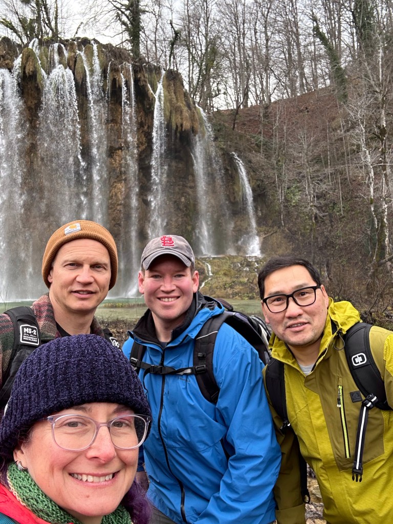 We kept to our intended wake up and leave at 4:30 am schedule but it wasn’t easy! Josh, being the non coffee drinker took the first leg of driving since there wasn’t any coffee to be had at the point! We started our 3 1/2 hour drive down to Plitvice Lakes National park. The “fast” way was a windy, snaky mountain road that I feel added an hour to our drive! Somehow leaving 3 hrs earlier than we had planned gained us absolutely nothing time wise and that was with no wait at the border! We had tickets to enter the park at 11 am and we walked to the gate at exactly 11 am. Of course on the way down, we did stop at 2 gas stations, had to add air to the tires, ate breakfast and had 2nd coffee at another station, so some time was lost. The Plitvice area is astounding! Granted the crowd can be a bit much, similar to the crowds you see at the Grand Canyon, but we were able to get ahead of some tour groups and make decent time. We planned on doing the K trail loop which was the longest but once we reached the trailhead it was closed due to flooding. We decided to take the ferry to the next trailhead and pick up there, but the tour group caught up with us and the ferry dropped us at the other pier. We then decided to take the other ferry across, it is a very short distance, swimmable even, if they would let you! After sitting on the boat waiting for a few mins, we changed the plan and then ran up the hill to the tram station. Well, the tram rolled right past us without stopping so that messed up that plan! Back down the hill to the pier, back on the short ferry boat, and finally back to hiking!
