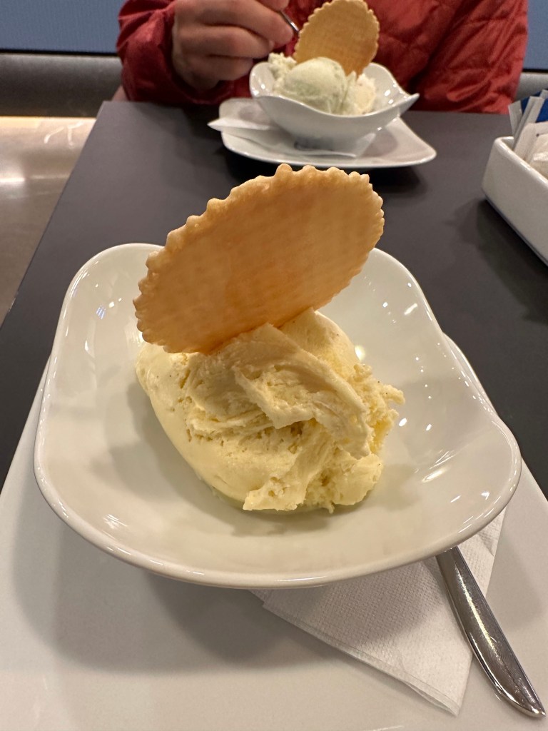 Up next was the challenge of finding dinner. It was the magic hours between 3 – 6, when most of the local eateries closed their kitchens and only offered drinks. We finally found a kebab place that was open and the food was quite good! This is one of the faster food options that I wish we had more available in Indiana. After food, it was back on the road to our hotel, driving deeper into the fancy little ski towns. Josh had picked a hotel that was on the outskirts of the main resort area and even then, it was noticeable that we were the odd ones out! Fancy cars, fancy dress, and us rolling in with our rental car and hiking clothes. After checking in, we walked the town and checked out the few places that were open. One fancy gear store came with our own lady who followed us around staying no more than four feet away! Like I said, we stood out from the other customers! Josh and Tserka found the magnets they wanted and then we found a gelato shop. Since we had missed the ice cream in Slovenia, we didn’t want to make the same mistake here and opted for an appetizer of delicious gelato! They even had dairy free versions, which was a nice surprise.
