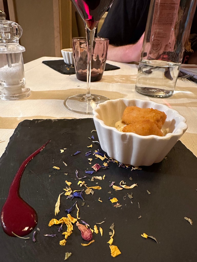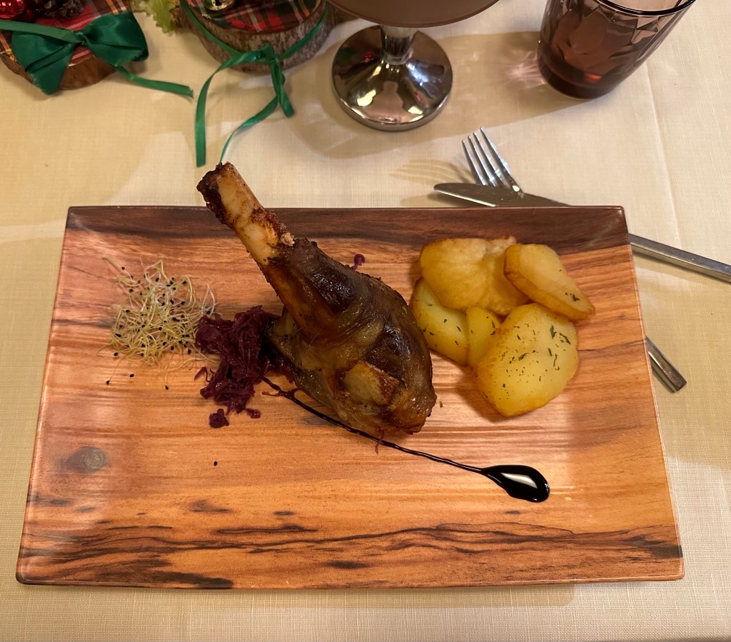 Post gelato, we headed back and made reservations for dinner at the hotel we were staying in. That should have been our first clue but it wouldn’t have really changed anything since none of us were traveling with fancy clothes. The other diners were dressed much nicer, except for the kids across the way wearing lounge pants. The dinner menu was our second clue, it had sections for starters, first course, second course, then dessert. I took Hannah’s advice and just went with the house red wine and was not disappointed! We shared a starter charcuterie board, then three of us opted to have pasta which was a first course option, and Tserka went with the lamb shank, a second course dish. I’m not sure how one person would have eaten both the first and second course on their own! It was probably the fanciest place I’ve been to dinner in a very long time!