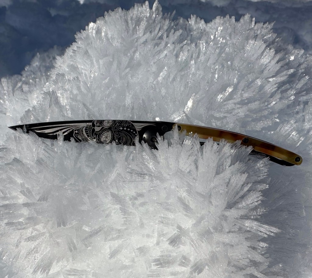 We had our sack lunch at the lake, a nice selection of meat sticks, cheese, breadsticks, and fruit for me! I’m sure the lodge offered a nice repast but being budget travelers we played it cheap! Steve did a photo shoot with his new favorite travel knife from Deejo. It is the lightest one on the market that meets the blade length requirement for most of the races we do!