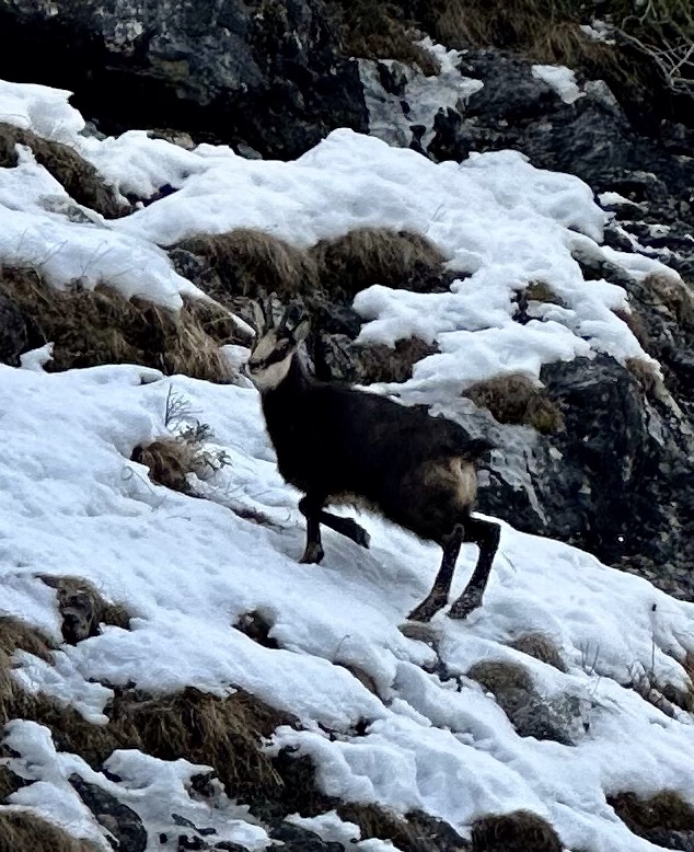 While Steve and I were standing there just enjoying the peace, we heard a clatter up the mountain. Not sure what was coming, I missed the first shots, but a chamois was coming down right towards us! It must have been scared up by Josh and Tserka hiking farther uphill and descended down to us. So cool to see!