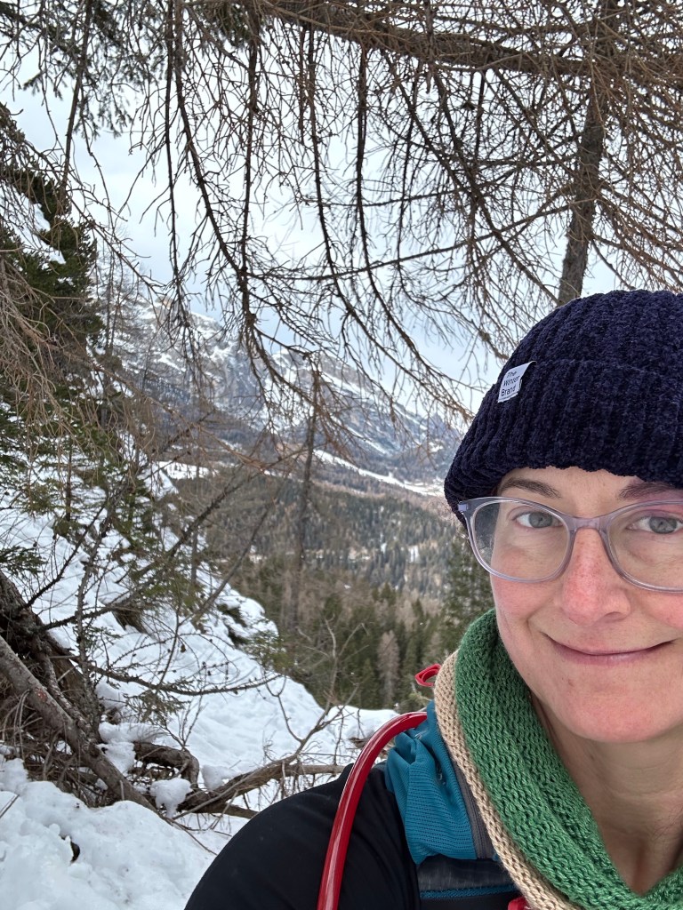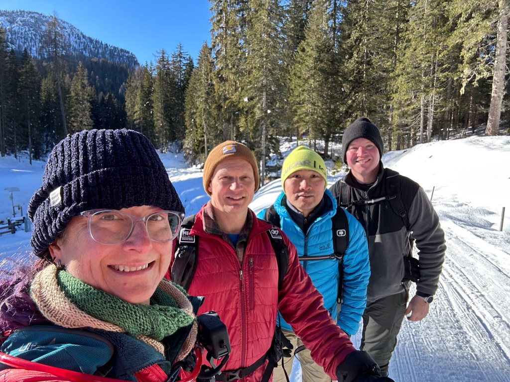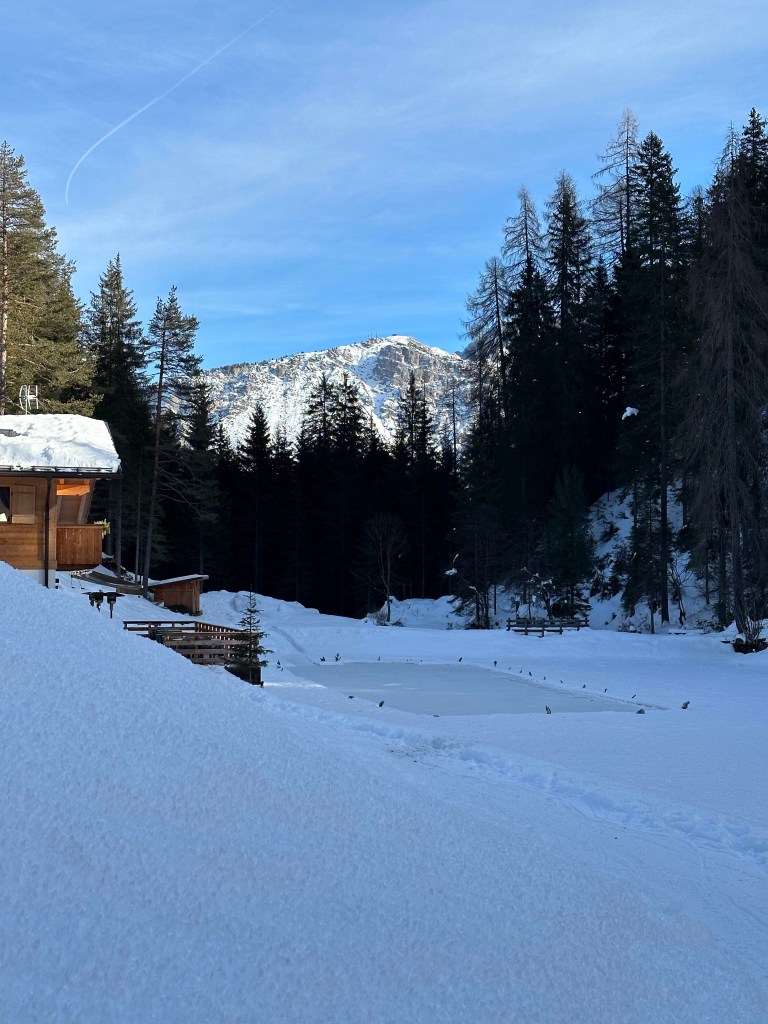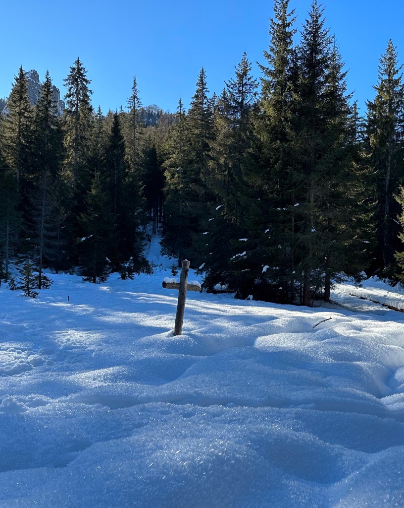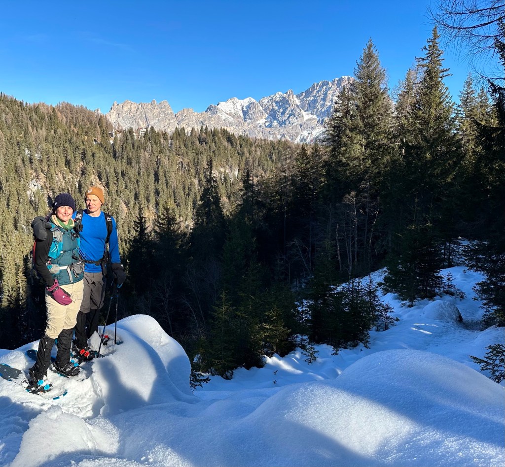 The plan was to drive about 30 mins to a trail Josh had picked out that had great views of the Dolomites while we hiked down and around a lake. Something we hadn’t considered was that this area was the main ski area of the Italian Alps and the roads were not able to handle the amount of traffic it was experiencing! Narrow roads made more narrow by cars parked on the side, winding through city centers, dodging hapless skiers who just walk out with no care, all combined to make a stressful driving experience! We made our way to the trailhead and then realized that the trail was only open to cross country skiers during the winter. Crap! New plan was to find a place to get some skis, which meant a back track to the town and then a drive back up. Ugh. A search on their website though solved our issue! As they also rent snowshoes, they had trail recommendations for hiking snowshoeing. The trail wasn’t as long as the original but is did take us through the woods and to a lake, then up to see some views!