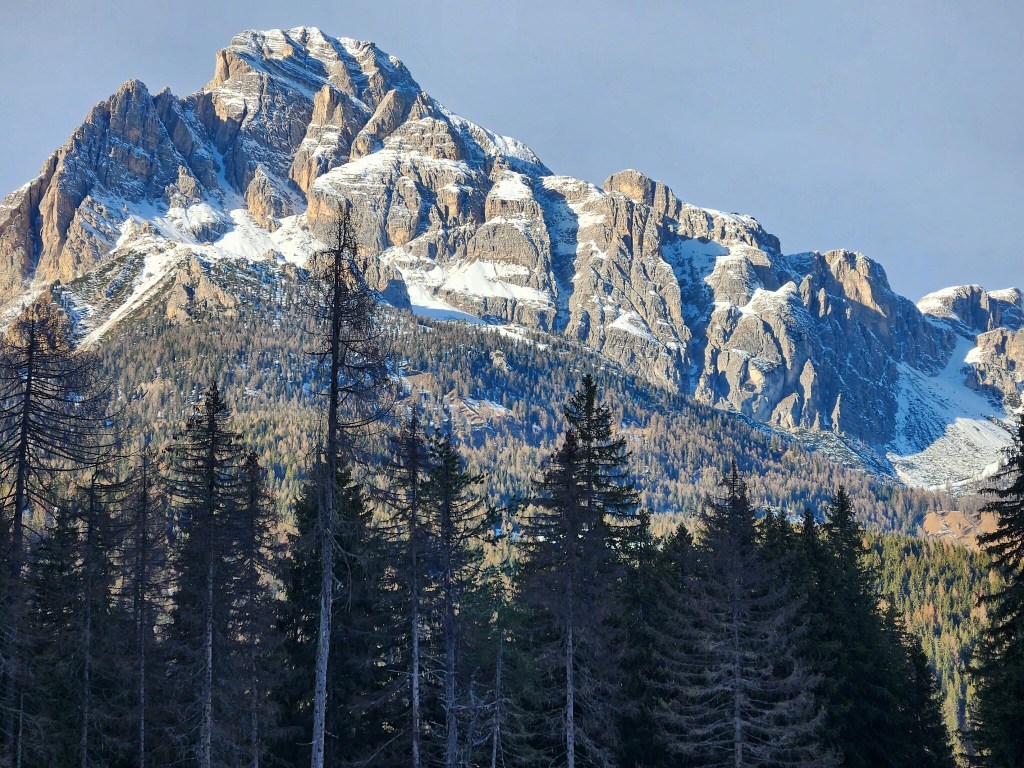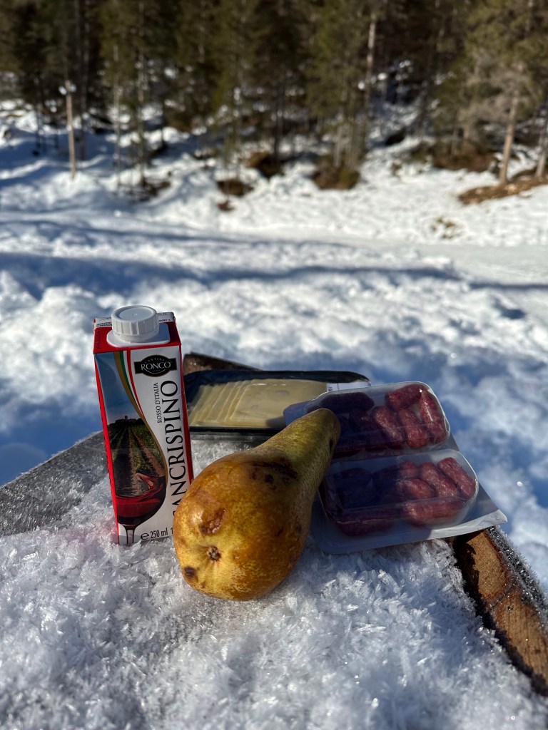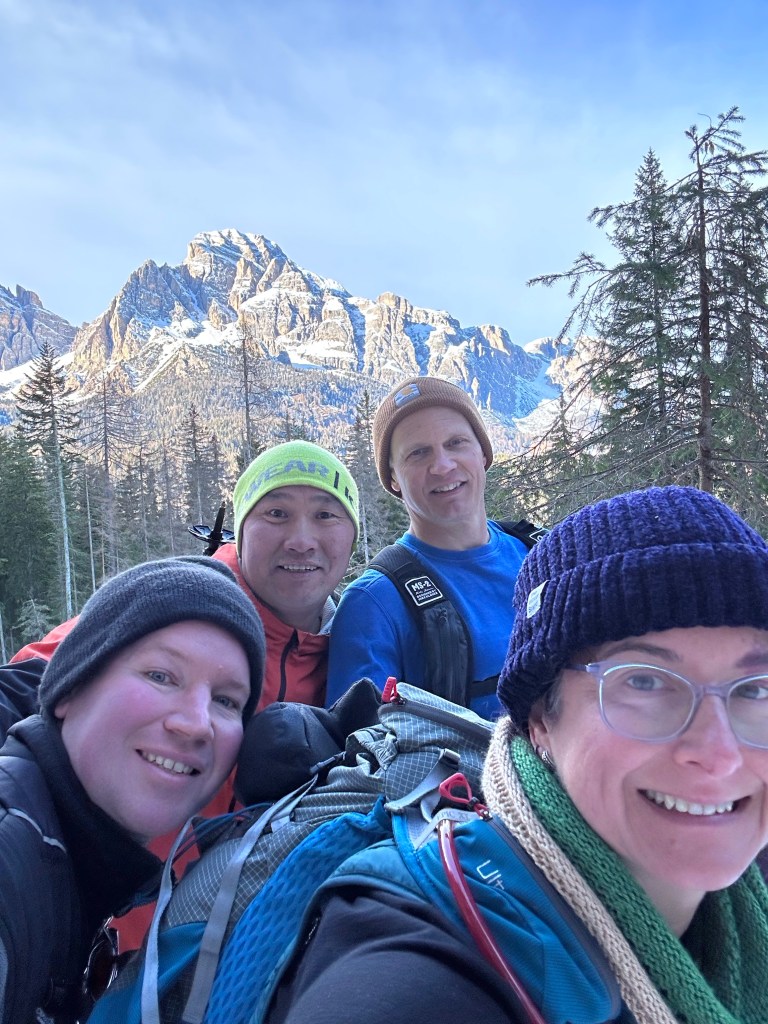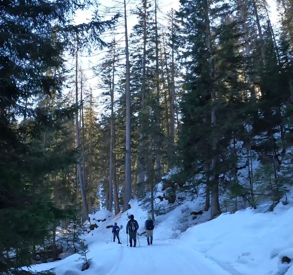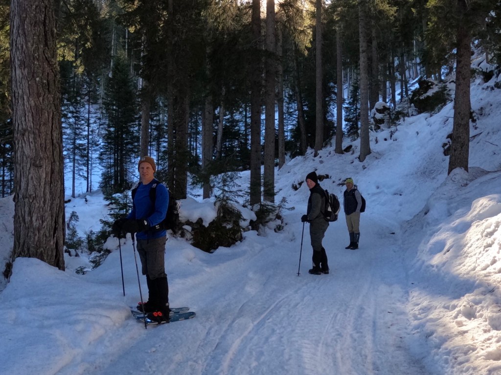 The plan was to drive about 30 mins to a trail Josh had picked out that had great views of the Dolomites while we hiked down and around a lake. Something we hadn’t considered was that this area was the main ski area of the Italian Alps and the roads were not able to handle the amount of traffic it was experiencing! Narrow roads made more narrow by cars parked on the side, winding through city centers, dodging hapless skiers who just walk out with no care, all combined to make a stressful driving experience! We made our way to the trailhead and then realized that the trail was only open to cross country skiers during the winter. Crap! New plan was to find a place to get some skis, which meant a back track to the town and then a drive back up. Ugh. A search on their website though solved our issue! As they also rent snowshoes, they had trail recommendations for hiking snowshoeing. The trail wasn’t as long as the original but is did take us through the woods and to a lake, then up to see some views!