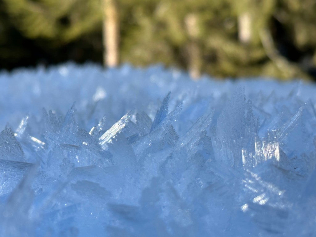 Leaving the cabin clearing we made our way up to the peak that shared the same name as the lake we had visited earlier. The hope was an open clearing to see the vistas of the far away mountains. We went up and up and up some more but we did find a nice view! Josh and Tserka went up a bit farther to check around the next bend while Steve and I stayed and played around with balancing on a log with snowshoes.