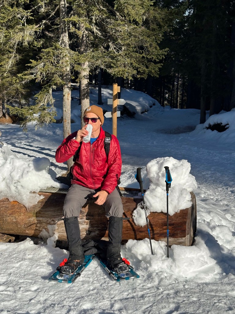 The hiking up to this point was on well groomed and packed trails, making the snowshoes not necessary but Steve and I hiked in them anyway. Leaving the lake we took a less travelled route back to the cabin with the cross were we enjoyed our trail beverages.