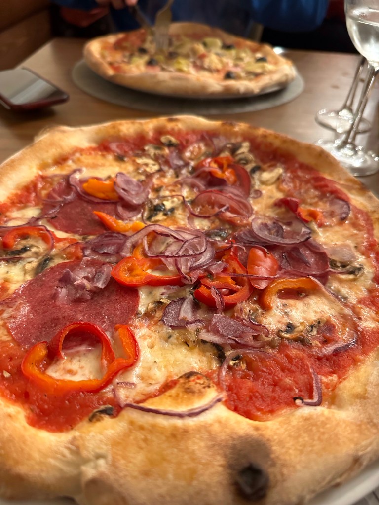 After hiking about 5.5 miles in a leisurely 4 hr 15 mins, we loaded up the car once again and started our 4 hour drive north to Munich. The drive took us up and over the pass, offering some majestic views for those not driving! The road was a twisty snake both up and down. We had hoped that our timing would let us make one last stop. The options were a stop at the Swarovski Crystal Museum or the water park at Aqua Dome Hotel. Unfortunately, the timing didn’t work out for either of these and we just drove straight back to Munich. Josh did get to try out the autobahn for real, pushing our rental car to its limits! Arriving in Munich, we had one last meal, which turned out to be pizza because that was all we could find! At least it was quality wood fired pizza!
