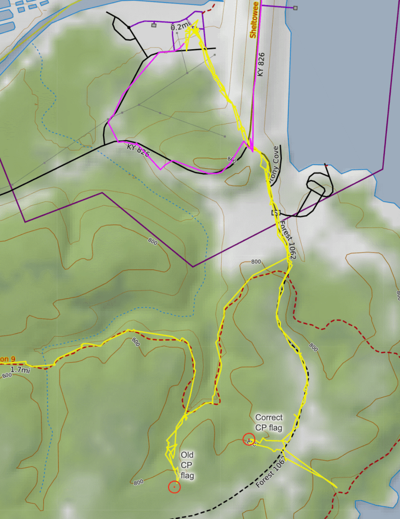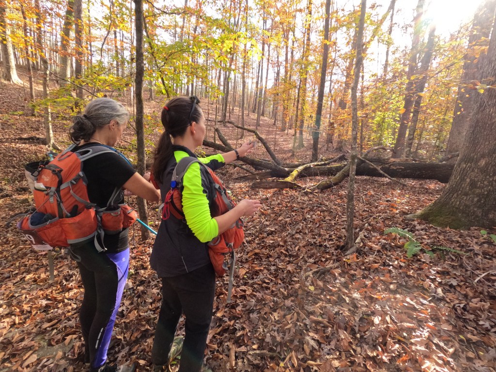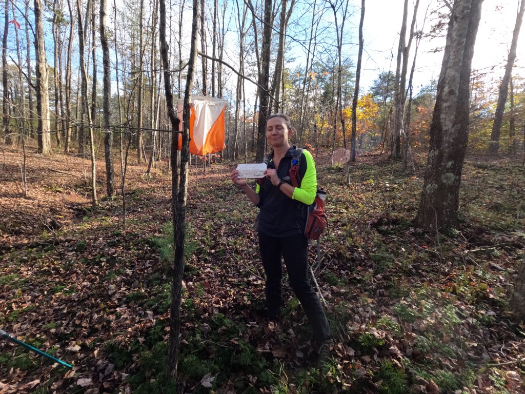 The Fig Cave Run Lake 12 hrs (43.4 miles) – I only have a few memories of this race, can’t even find the map for it! I did look at my Garmin trace and that helped to remind me. We started on the canoe at sunrise and it was beautiful! A smooth 9 mile paddle and then we headed out on the trek, which was about 27 miles and took us the bulk of the race time (8 hrs 5 mins). I recall some beautiful fall views, lots of climbing, and one major goof. On the last CP before the TA to the bike, we performed a fabulous example of a parallel error! What made this so special is that we did find a flag at the location but it was missing the punch. This happens occasionally in races, sometimes the punch gets broken or lost. We snapped a pic of Kristy at the CP and headed back out. We ran across another racer on our way in and commented that the punch was missing, he informed us nope, punch was there when he came through. Odd we thought since our timing was close to his but meh, no worries. We should have been worried… We reached the TA and told the people in charge that a punch was missing and that is when it was confirmed that we had found a CP flag from a race long ago! Well crap! Rather than miss the point we hiked ourselves back up the dam and out to get the correct CP. On a normal parallel error, there wouldn’t have been a rogue flag to find and we would have caught the mistake! From the TA, the bike was short and fast, only about 11.3 miles and mostly roads for the route back.
