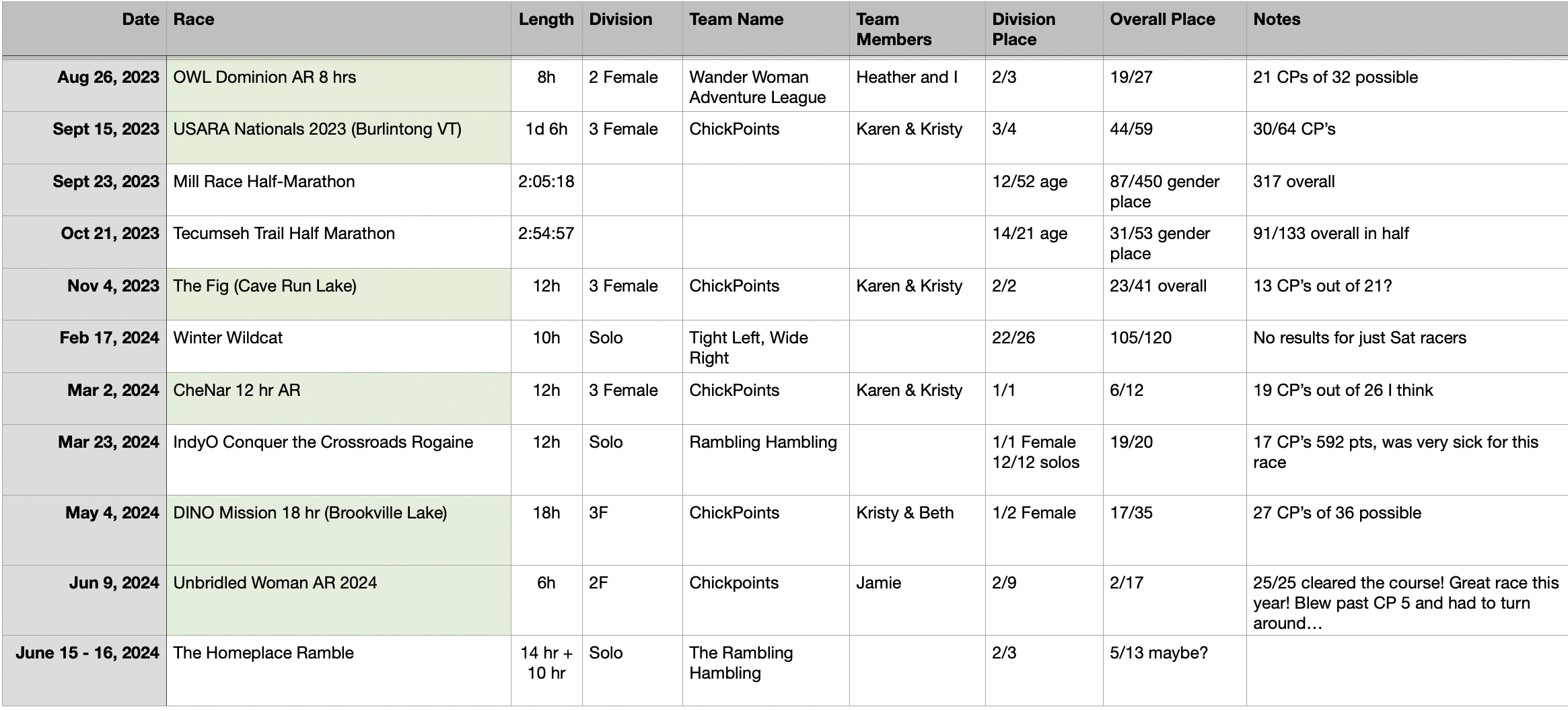 Looking back at the spreadsheet, there is no way I can remember enough of each race to warrant a full race report but I’ll see if I can bang together some highlights and take aways!