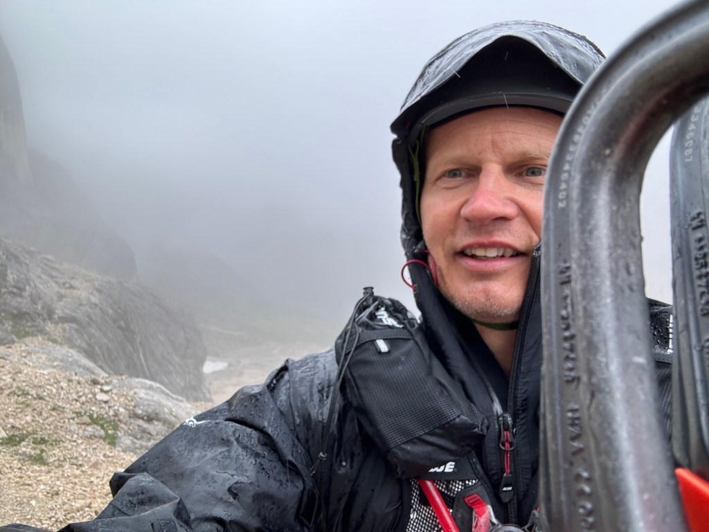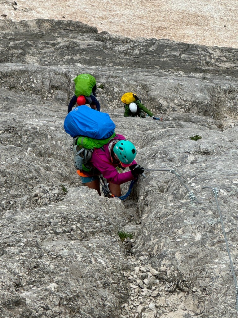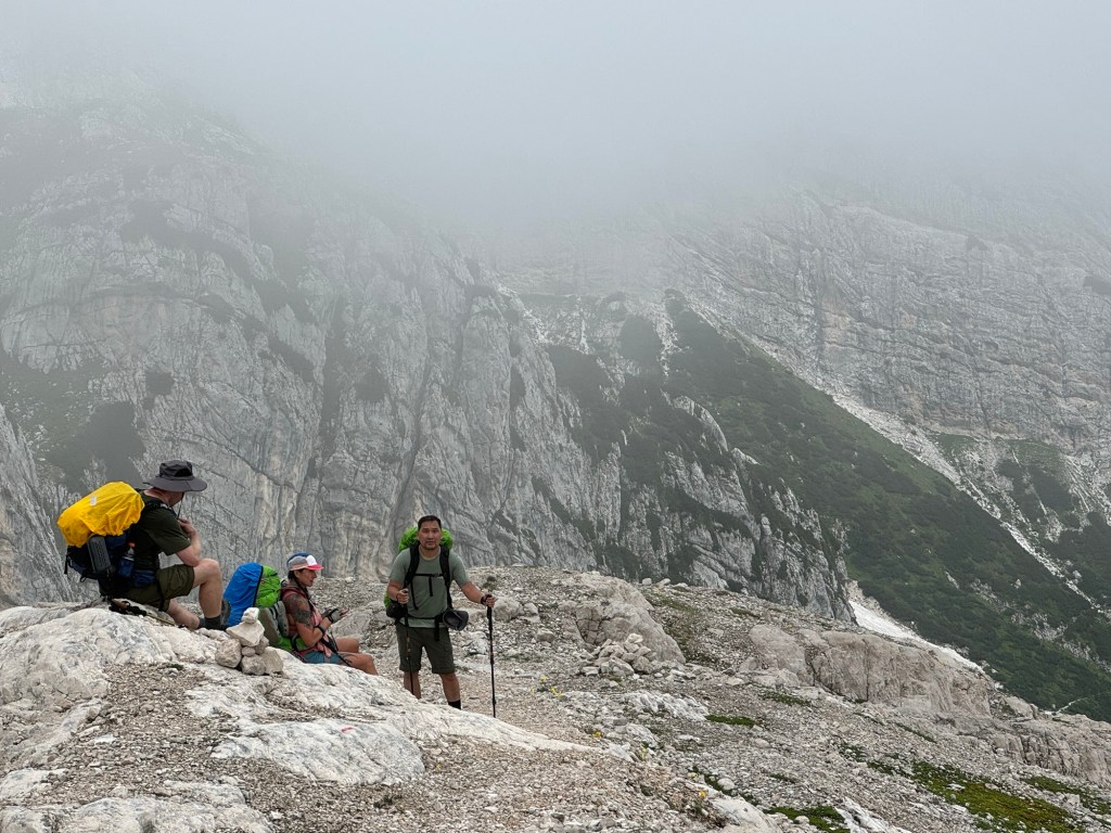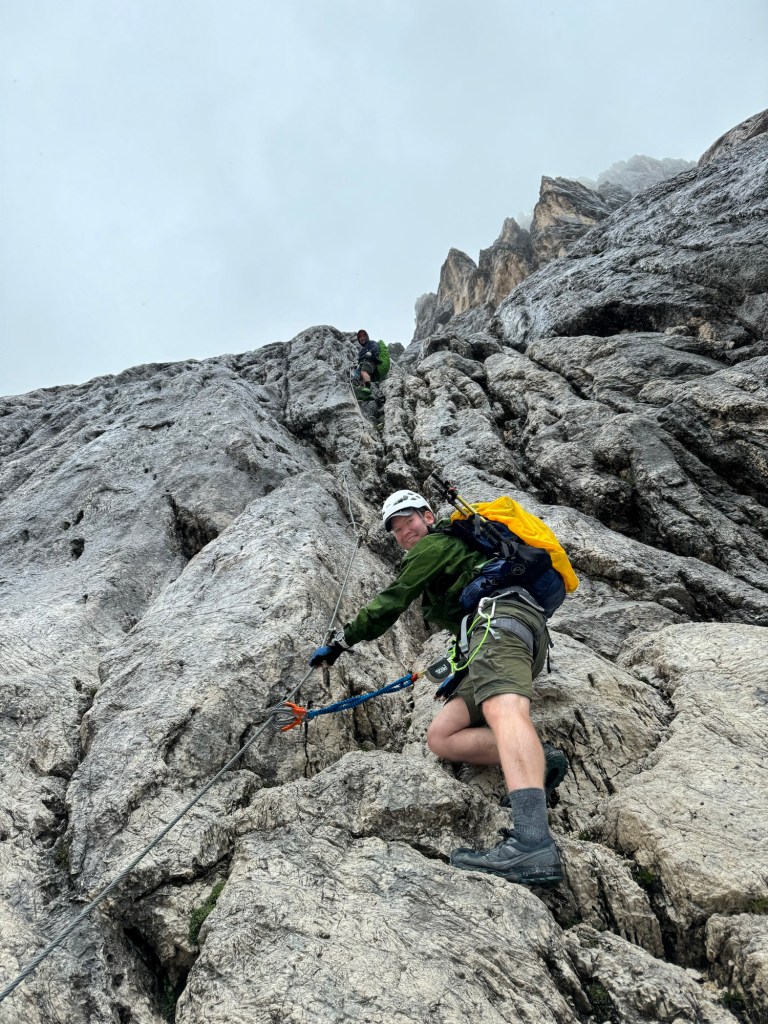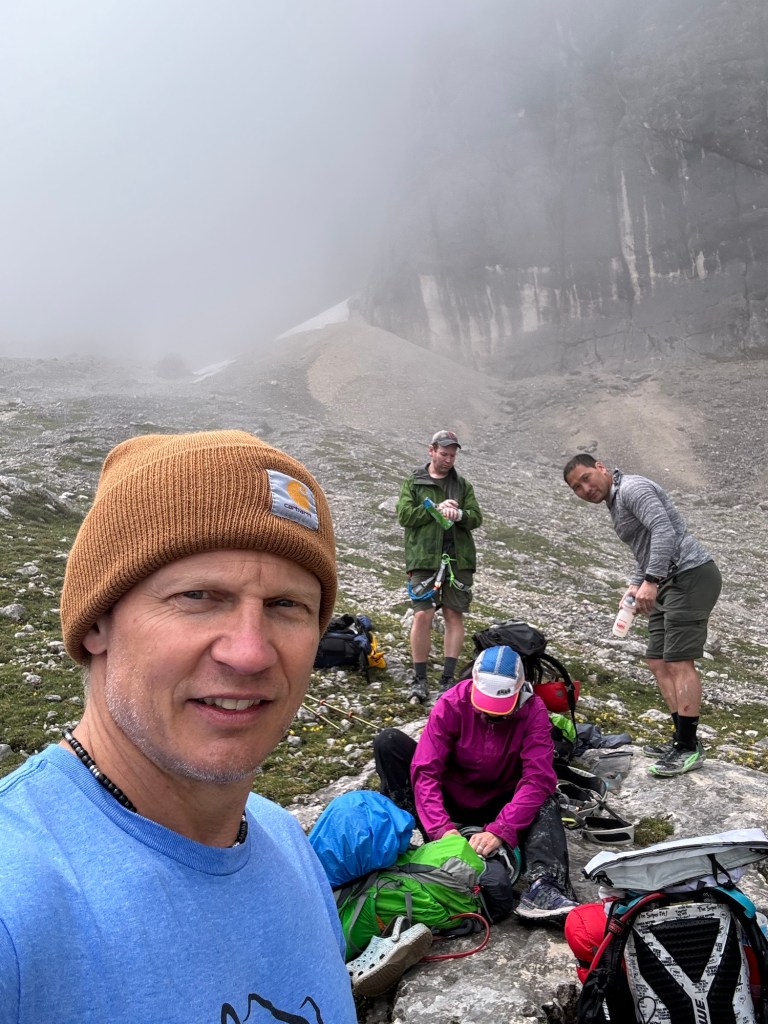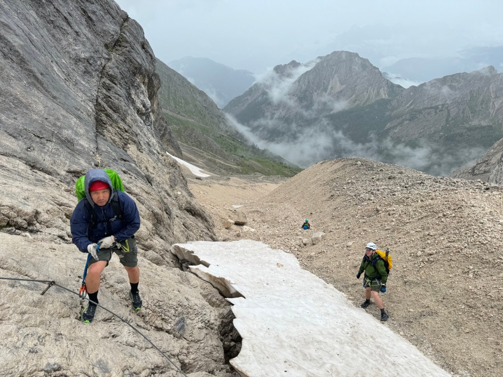 We started to encounter some snow sections and then the rain picked up, making for a chilly climb. Knowing we had a Via Ferrata coming up, we sheltered under a rock for a quick snack and the gear up. Soon we came to the cables and it was pretty much a route straight up the sloping face of the rock. I feel confident that if the weather had been dry, Steve would have just walked up but given the rain and heavy packs, we all opted to clip in for the climb.