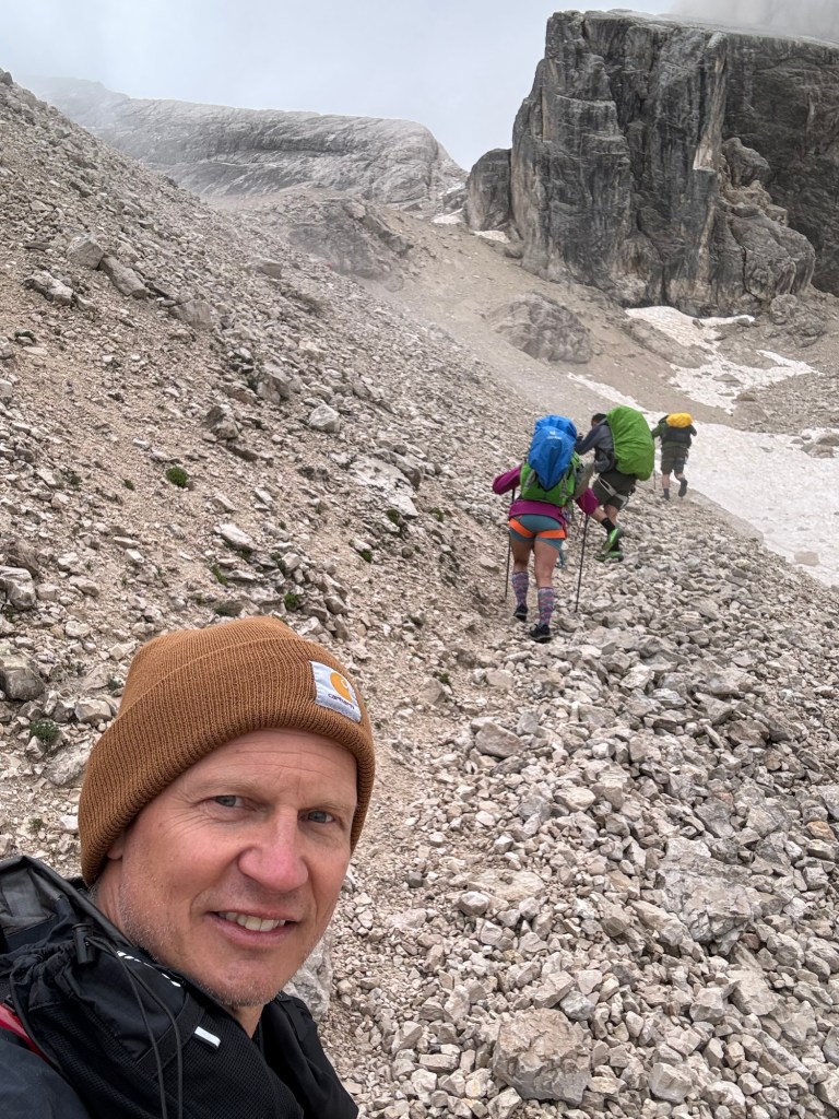 Breakfast was a tad light today but that has come to be the norm on this trip since we led the comfort of our Austrian Bed and Breakfast. The night before we had a brief chat with some lads from the UK who had hiked into San Marco from the direction we were headed. They claimed it was an easy day, something we would breeze through in a couple of hours (they assumed we were just going to the next hut but we had many more miles to go). Steve remarked that sure, it only took them a few hours because they had long legs, to which one dude lifted up his leg and said “no mate, not me, I have little hooves”! For some reason this just cracked me the hell up and I would continue to bring it up for the next couple of days! The hike out of San Marco for us was straight uphill to the pass then down and around and over.