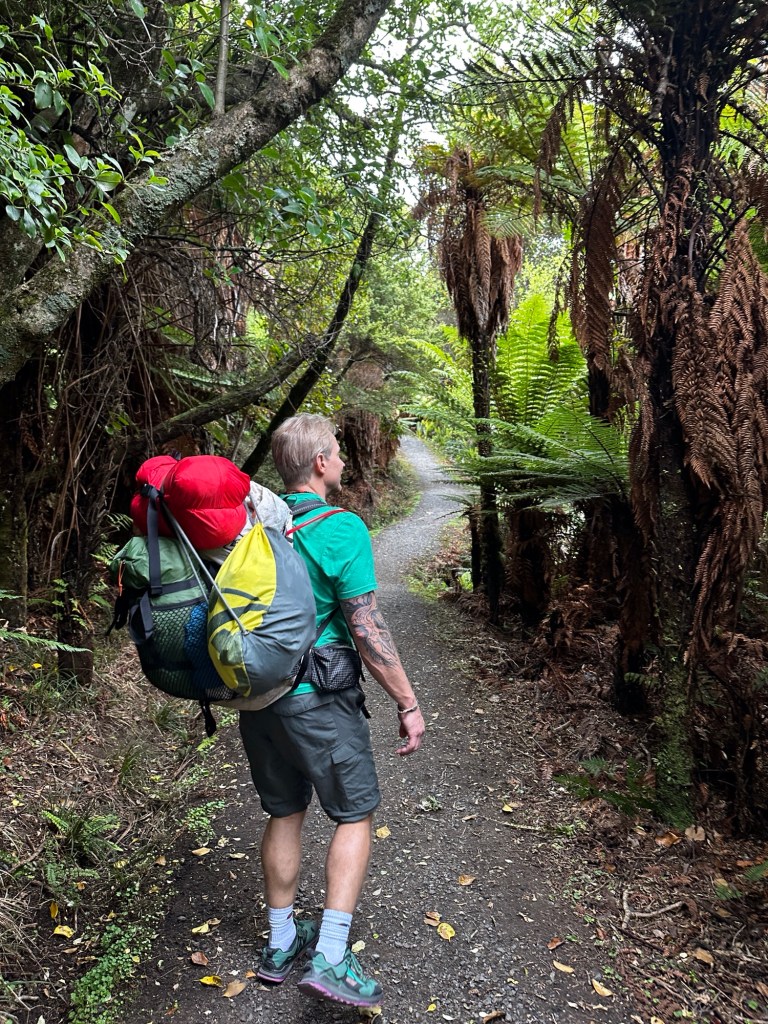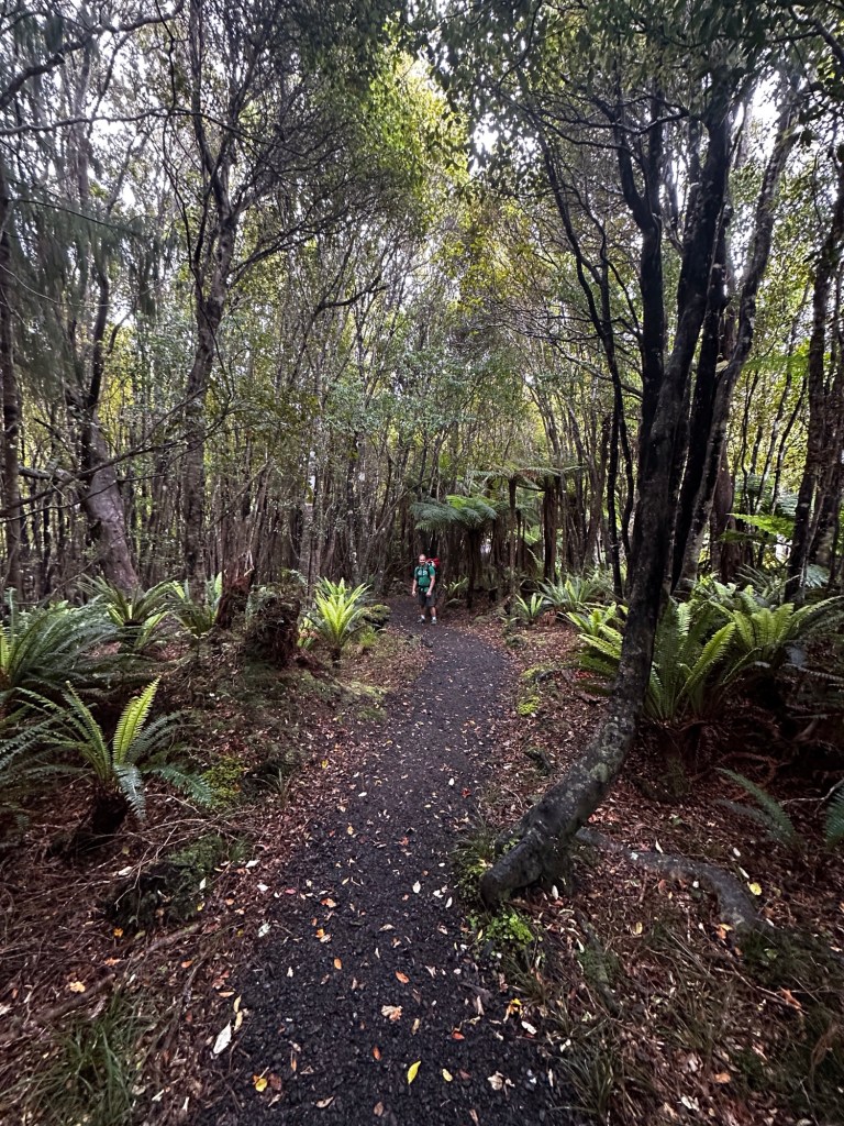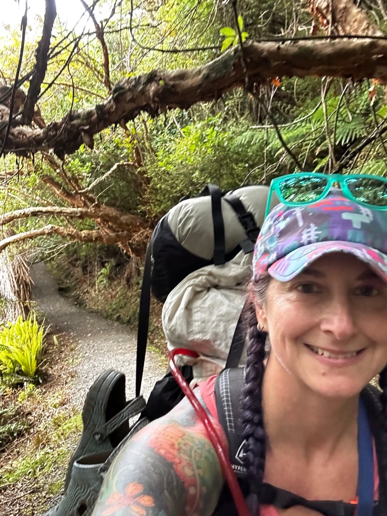 We landed and were shuttled to Oban, the main town on the island. We had to get some stove gas and find lunch before setting out. We had hopes of getting some fresh fish from the Kai Kart but it didn’t open until noon. The Snuggery cafe had a decent selection of sandwiches and some delicious kombucha. Due to the restaurant being on tank water, they advised us to head to the visitors center to fill our water bladders, so back across town we went (the whole town is like 3 blocks). One last stop for toilet paper, on the advisement of the visitor center folks, and we finally hit the road around noon. I had opted to just trek along the road to the trailhead instead of getting a taxi, this only added about 3 miles to our journey. I swear my pack has to be every bit of 35 lbs! Thank goodness I’ve been putting in time rucking over the past few months, so while it was freaking heavy, we still maintained a good pace.