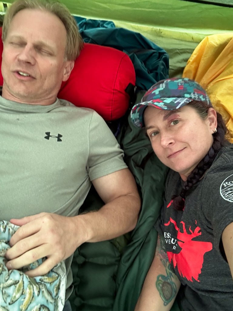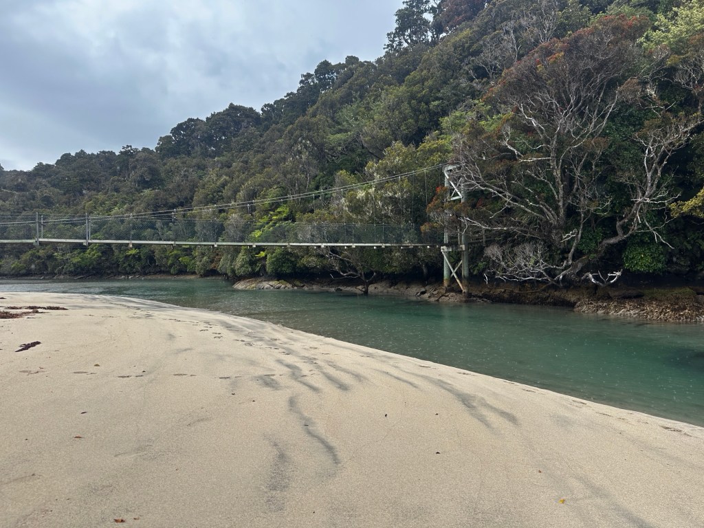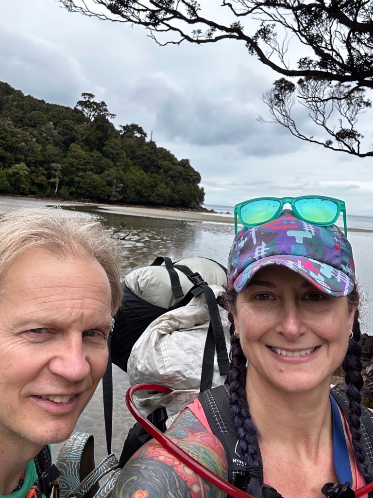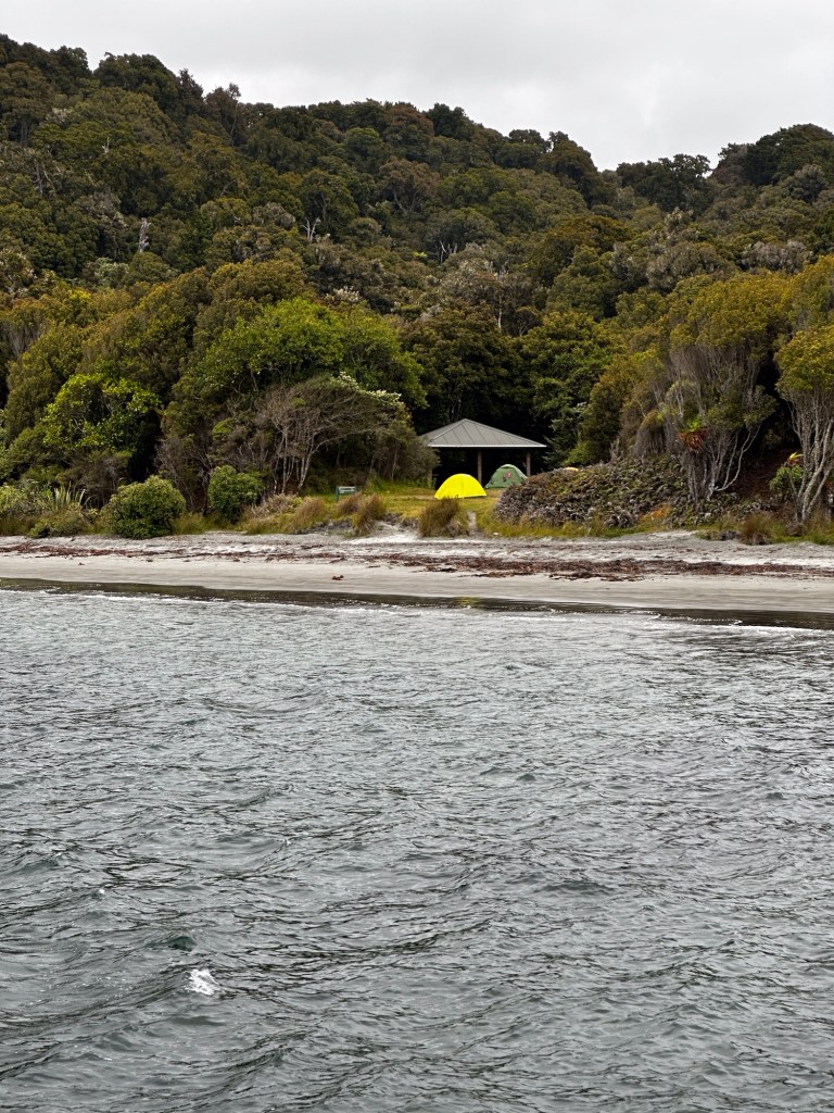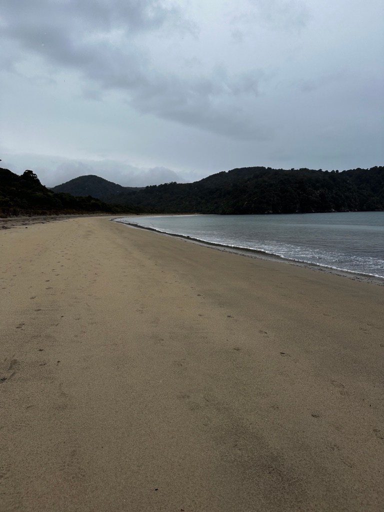 As soon as we stopped moving the sand flies descended so we rushed to get our tent up for refuge from rain and flies! We had a quick dip in the ocean to clean off the hiking grime and then it was siesta time. The time difference is still affecting us a bit, with the 4 pm local time feeling like the 10 pm back home. I woke up around 9 pm and decided dinner should probably happen, if for no other reason than it would lighten our packs! The campsite has a nice cooking shelter and with the cooler temps the sand flies were not as bad. The Jetboil once again wouldn’t ignite from the push button so I had to borrow a lighter. Hopefully we can keep finding nice people to borrow from or can fix the dang stove! While the food was “cooking” (more like soaking since it was freeze dried), I took a short wander down to the jetty. What I thought was a log washed up by the trailhead turned out to be a sea lion that was soundly asleep! We had dinner in the tent and drifted off to the sounds of waves crashing on shore.
