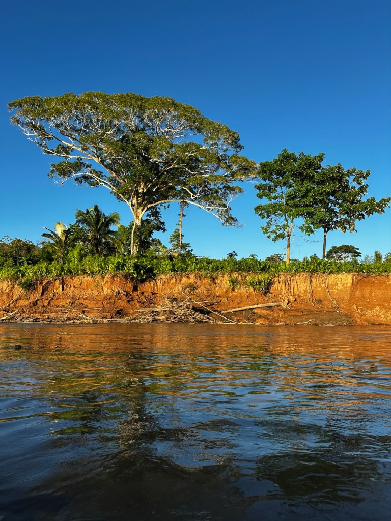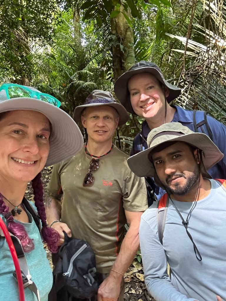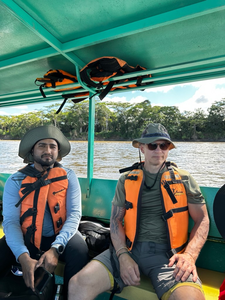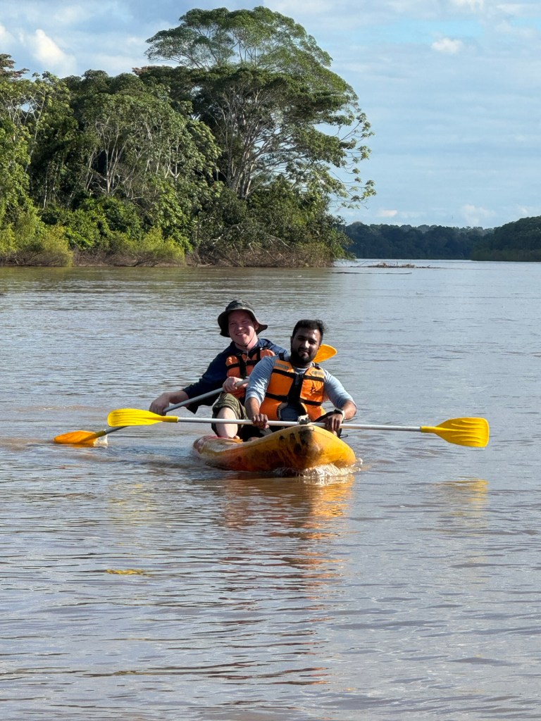 Back to the lodge for lunch of traditional catfish and rice, with fabulous fresh lemonade to drink. Then it was time for afternoon activities. I love the phrasing of “morning activities, afternoon activities” since Steve uses the same with our IU class when the students try and get specific details from us. Allen gave us way more details about what was happening next! We loaded back on the boat headed downstream towards Monkey Island. Along the way we rotated pairs of people into the sit on kayaks for a brief paddle. It was a little underwhelming to be honest due to how short we were actually paddling. Monkey Island is a small maybe 2km long island that was once home to many monkeys of several species. Due to illegal gold mining and hunting, the island is down to only 15 monkeys in one family troop (I think… might do some research on this when back online). The leader of the troop is Chico and he just wasn’t in the mood for a visit and free food today. After seeing the number of boats that came and went, I don’t blame him! The boat ride back to our lodge was more exciting though since we saw capybaras!! That was my bucket list animal for this trip once I realised they are native to Peru! Once again, I have phone envy after seeing how Josh and Ashish’s phones take such quality zoomed photos compared to mine. Might be time to mix up the Apple ecosystem…
