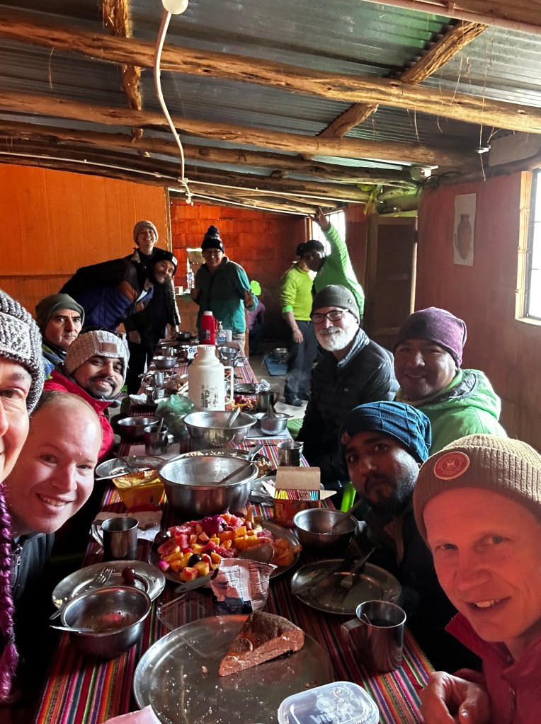 Our final early wake up day! We hit the road at around 4:15 am for the 2 1/2 hr van ride that brought us to the Alpaca Expeditions staging area for breakfast. Served in a concrete and tin building, cooked on a propane stove, the meal was 5 stars! Fueled on coffee, coca tea, and all the yummy foods, we started our slow trek up to Rainbow Mountain.